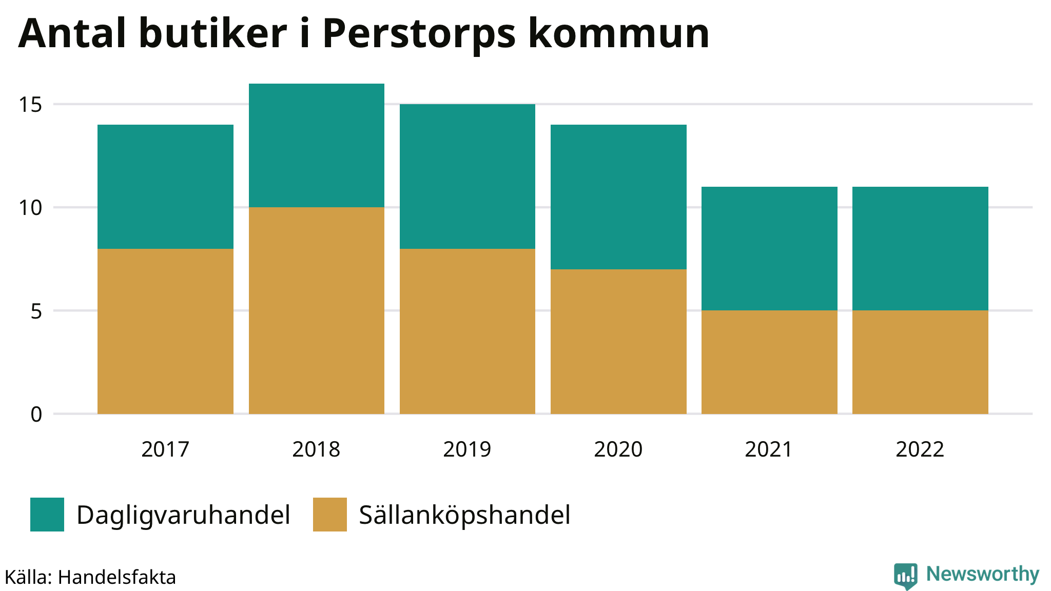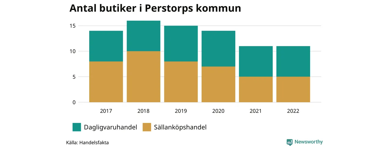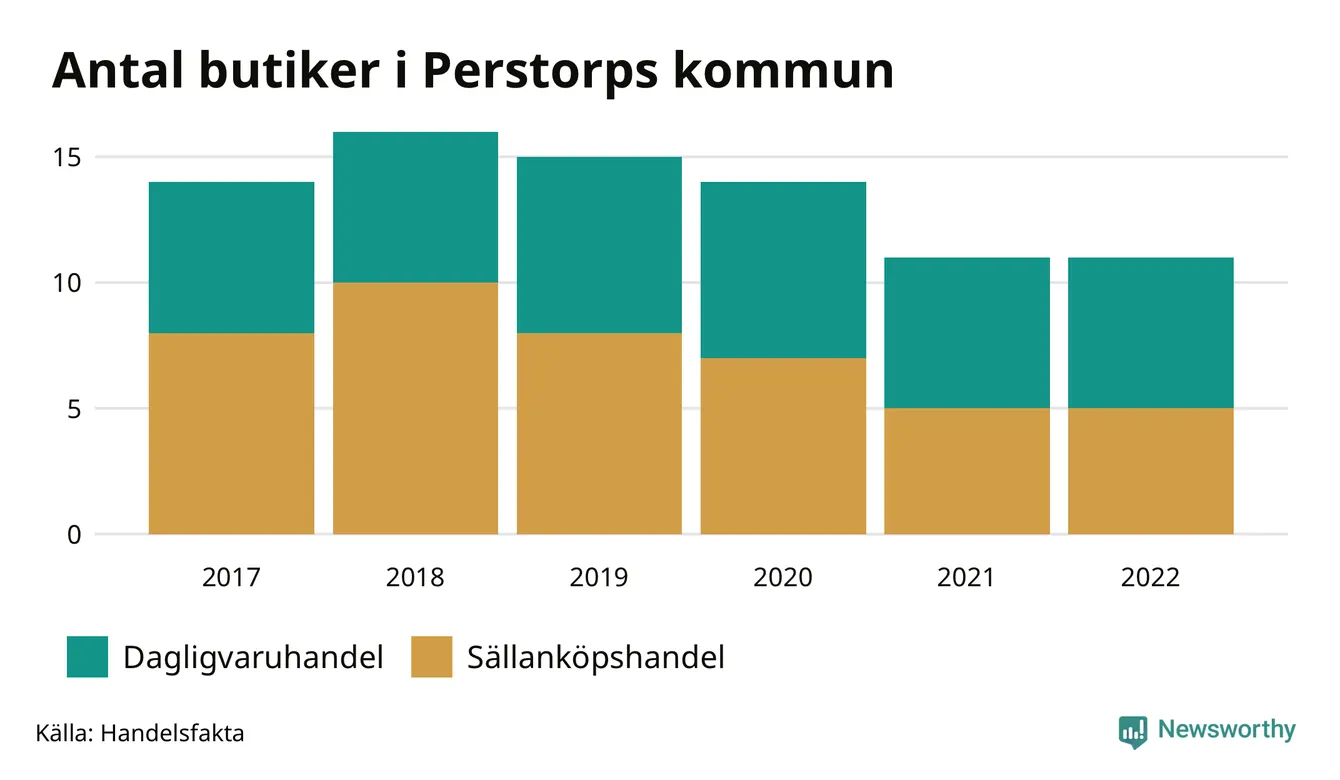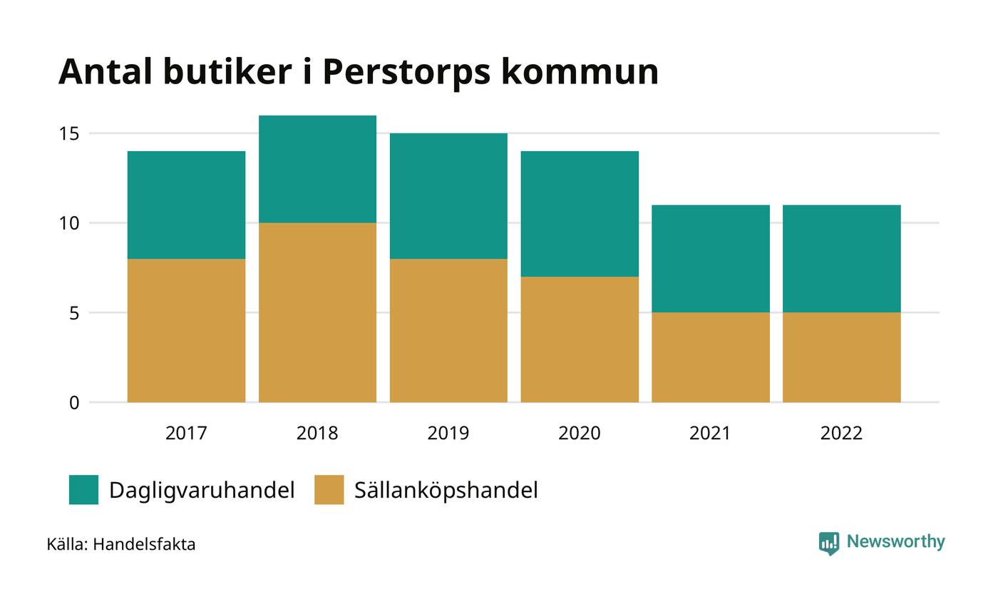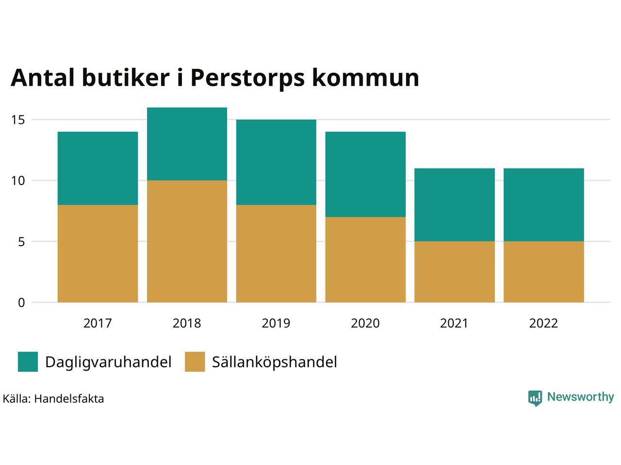 I Perstorp rör det sig om små tal. Den 30 november 2022 fanns elva butiker i kommunen, vilket är lika många som året innan men tre färre än 2017.