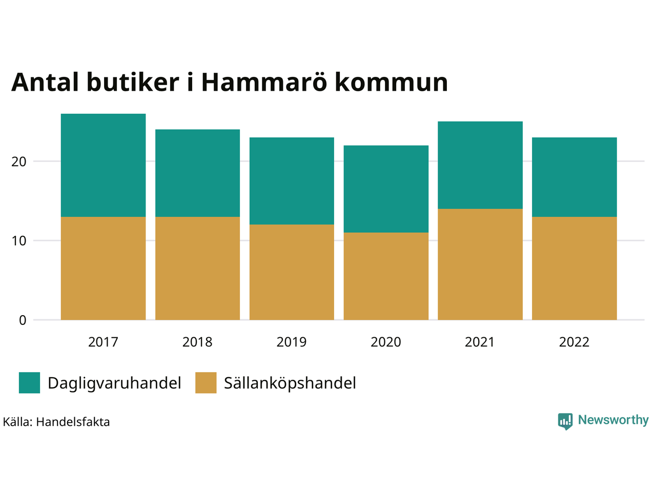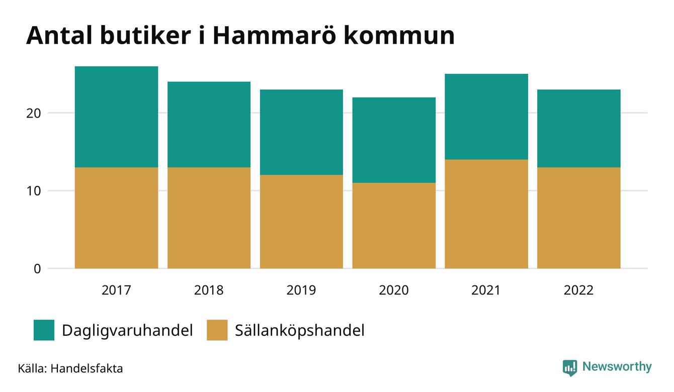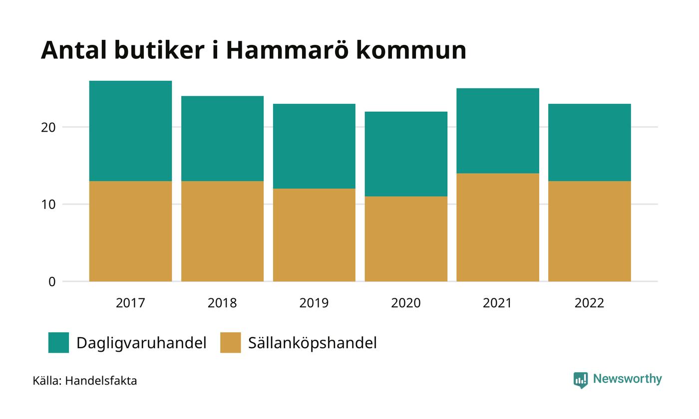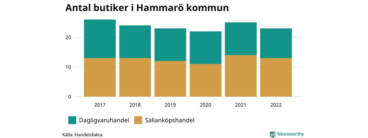 På Hammarö rör det sig om små tal. Den 30 november 2022 fanns 23 butiker i kommunen, vilket är två färre än året innan och tre färre än 2017.
