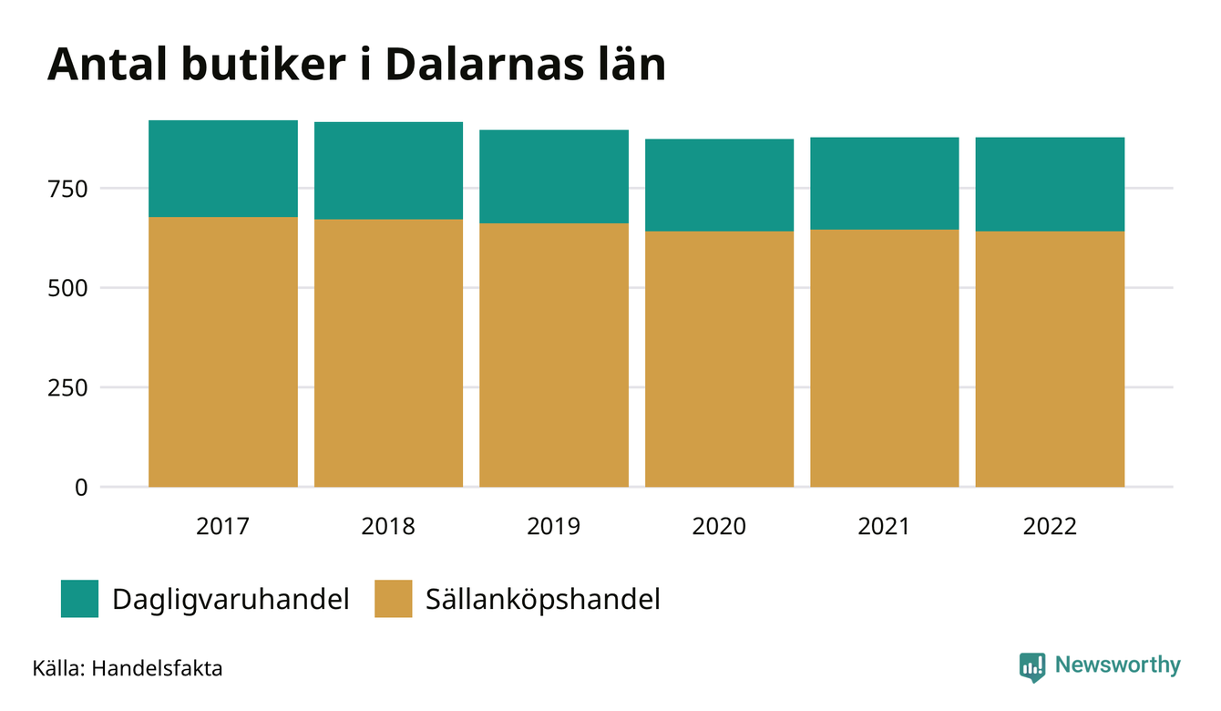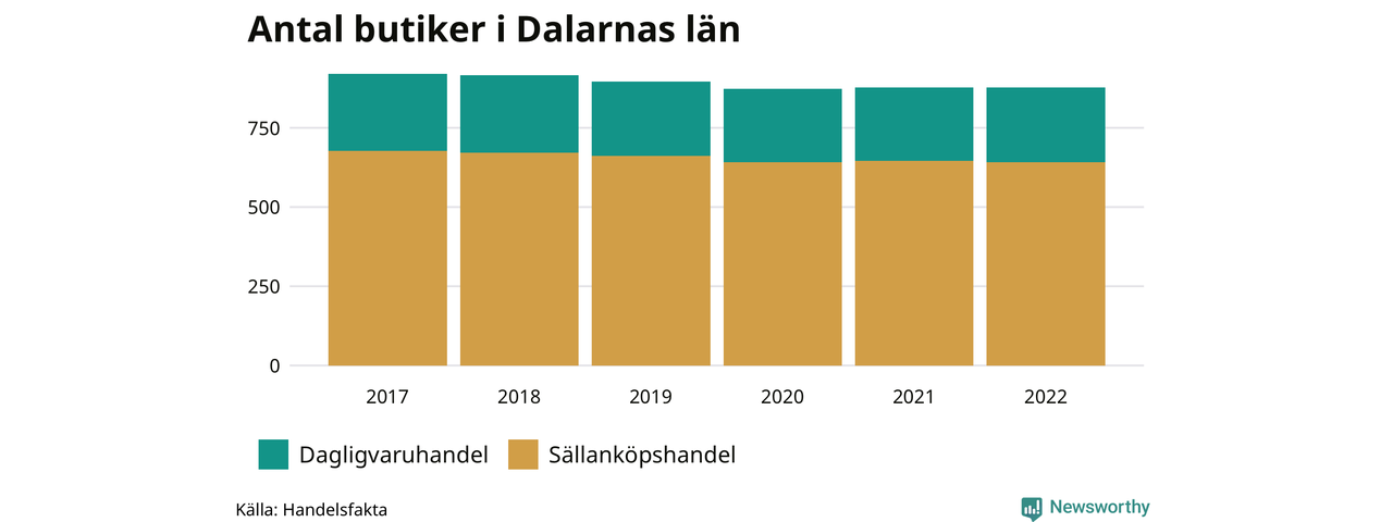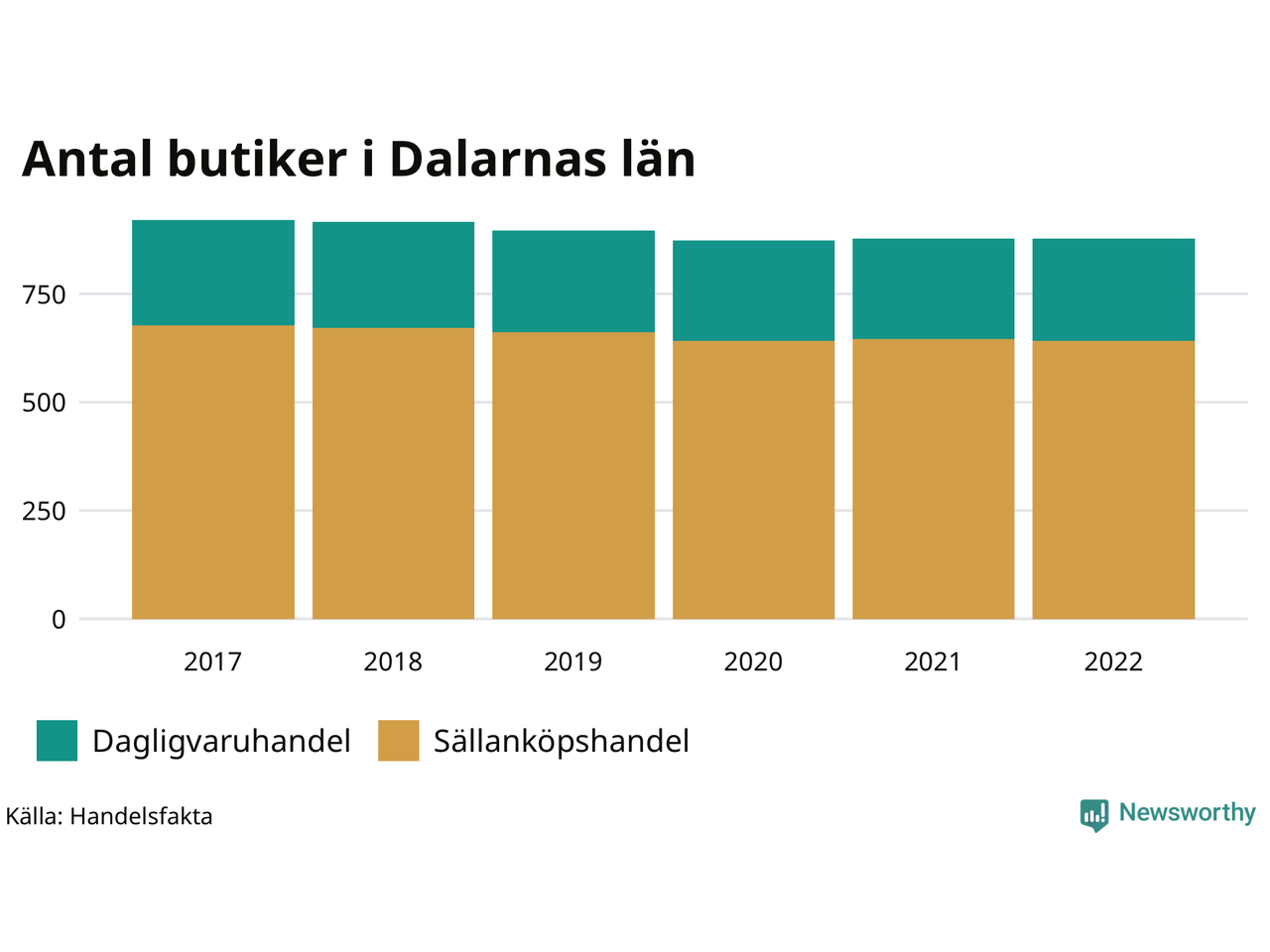 Samma utveckling ses i Dalarnas län, även om det inte gått riktigt lika fort. Den 30 november 2022 fanns 878 butiker i länet, vilket är lika många som året innan men 43 färre än 2017.