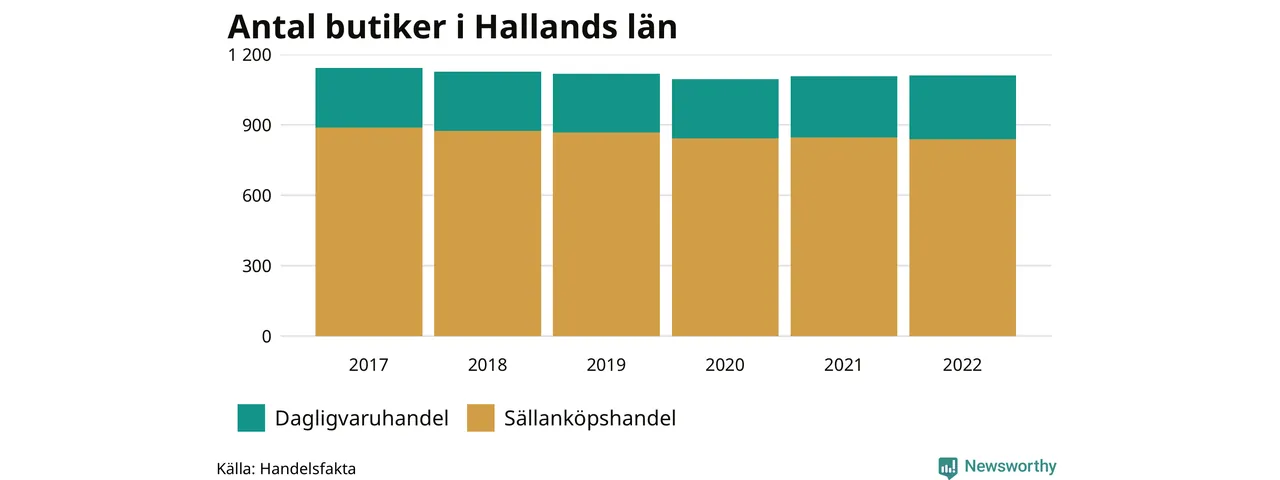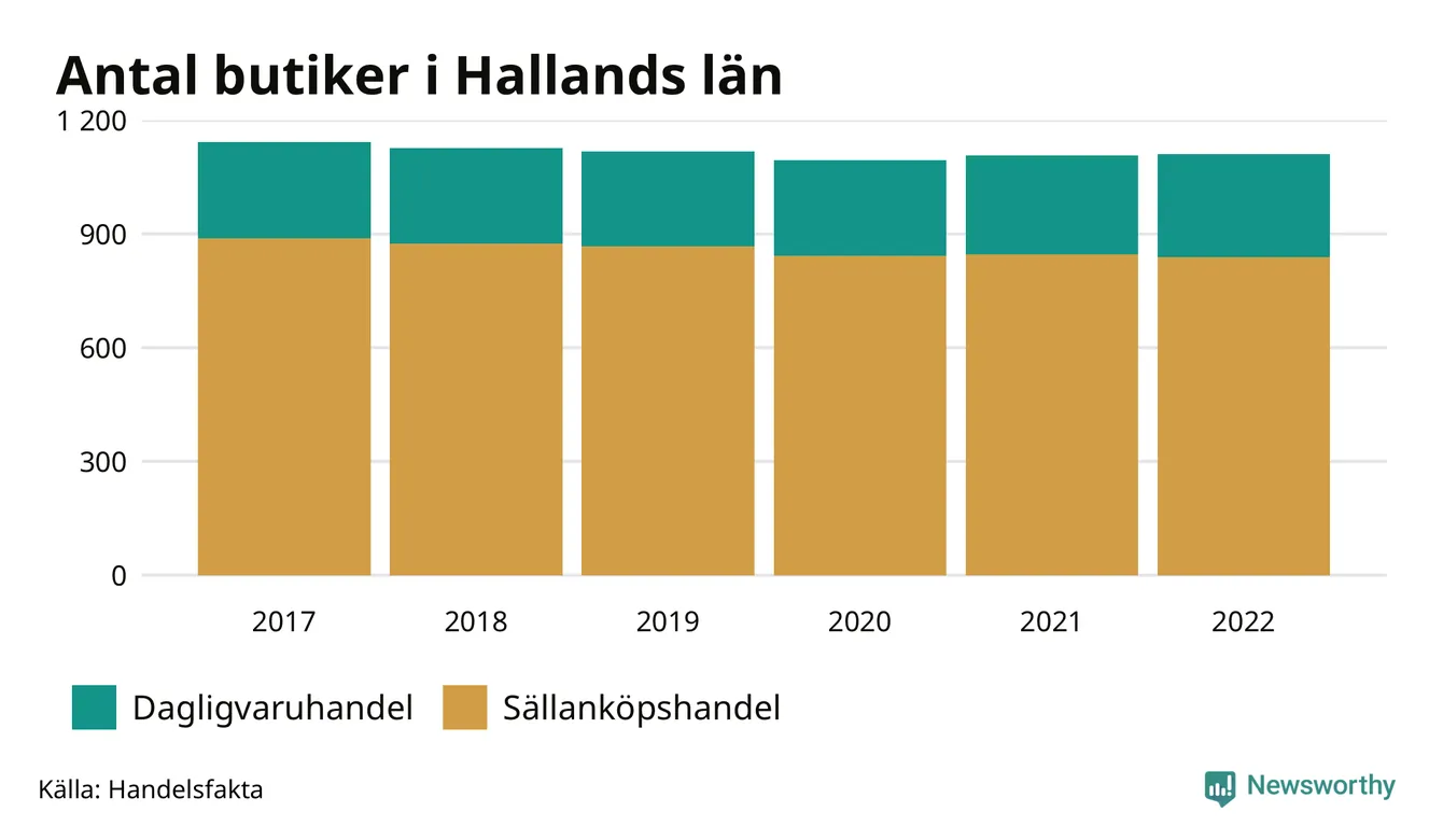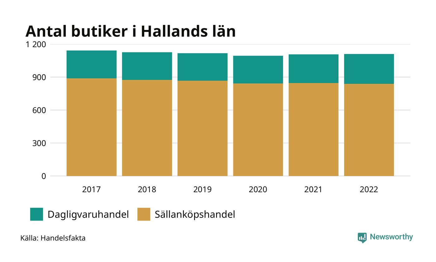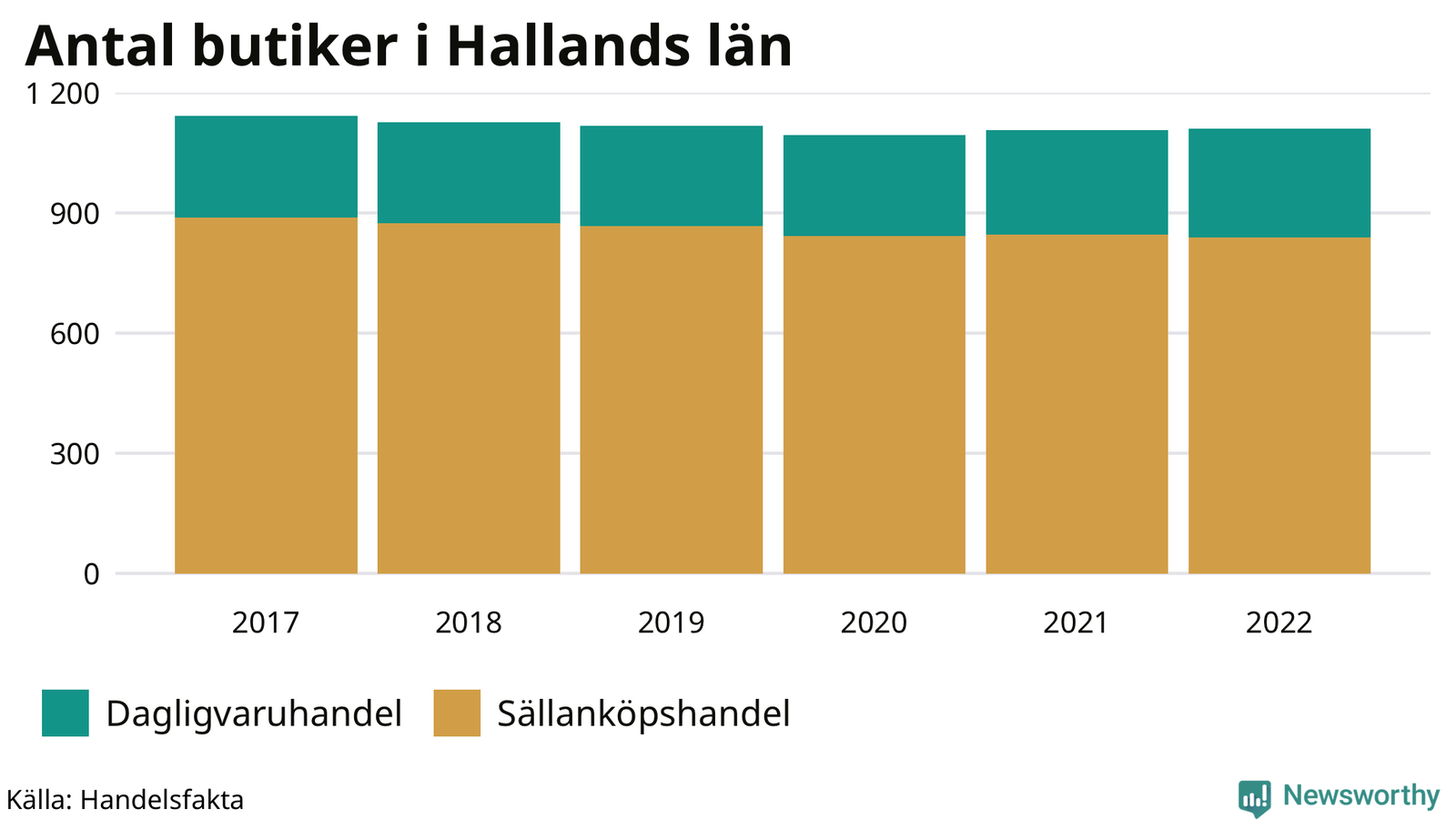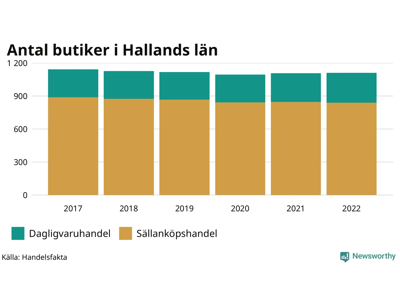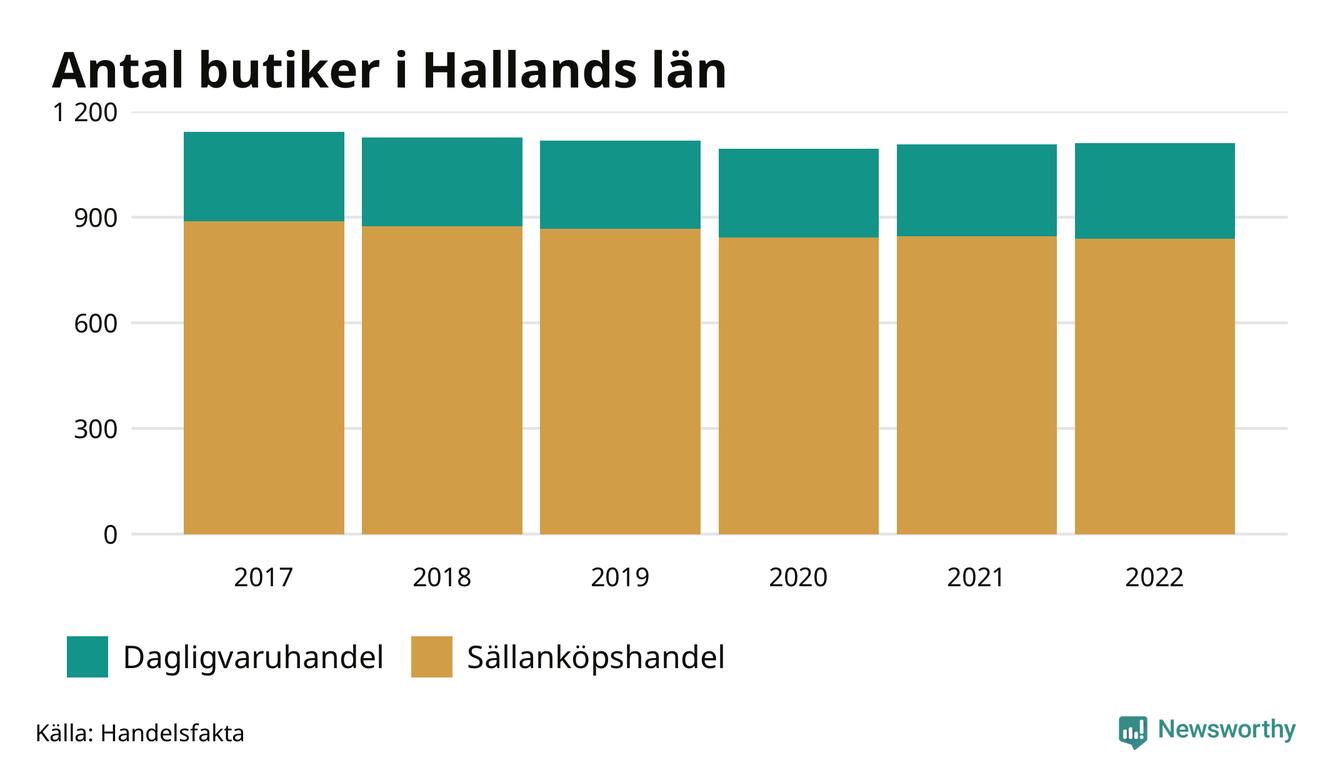 Samma utveckling ses i Hallands län, även om det inte gått riktigt lika fort. Den 30 november 2022 fanns 1 111 butiker i länet, vilket är fem fler än året innan men 32 färre än 2017.