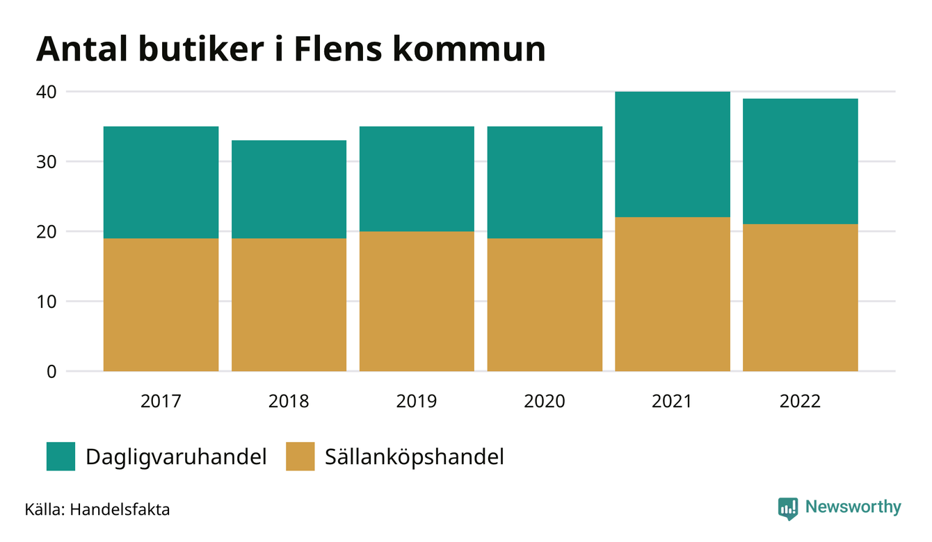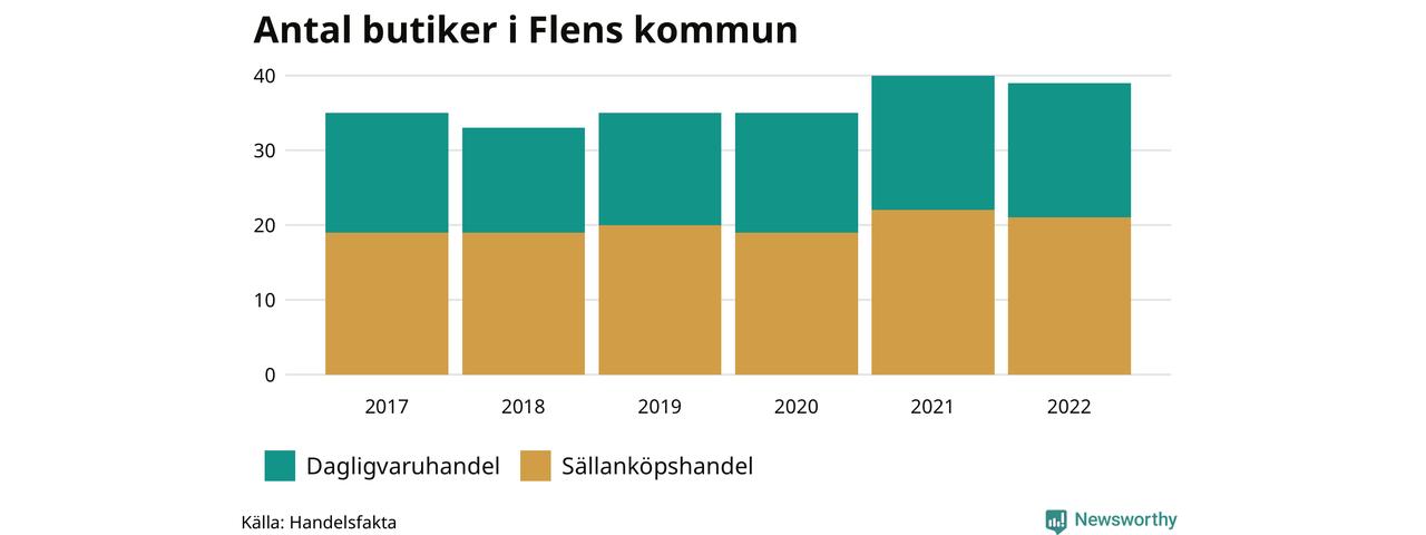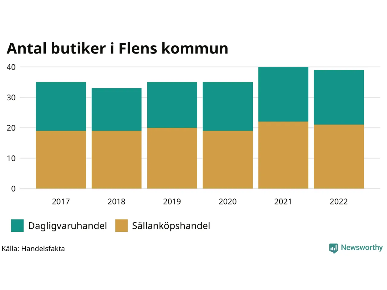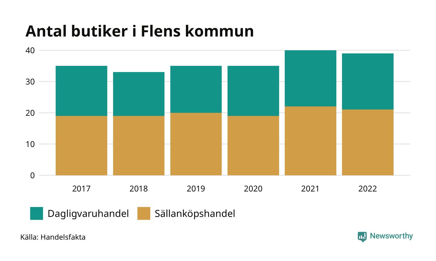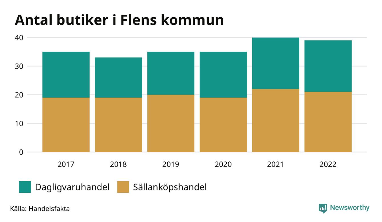 I Flens kommun har antalet butiker däremot ökat. Den 30 november 2022 fanns 39 butiker i kommunen, vilket är en färre än året innan men fyra fler än 2017.