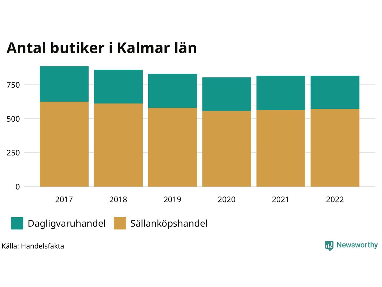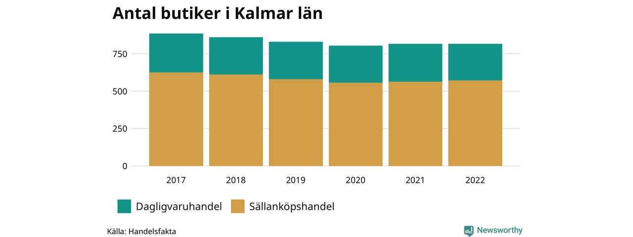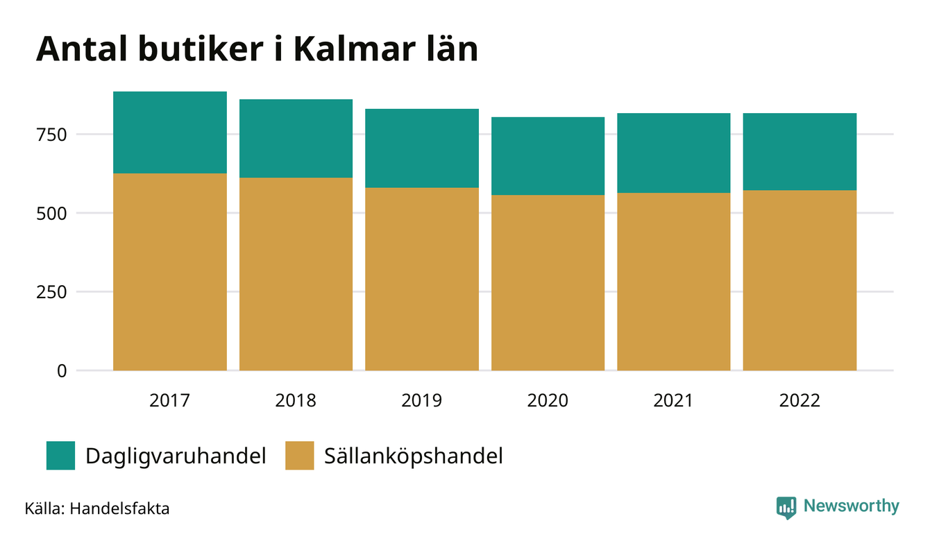 Samma utveckling ses i Kalmar län. Den 30 november 2022 fanns 816 butiker i länet, vilket är en färre än året innan och 70 färre än 2017.