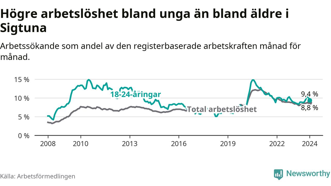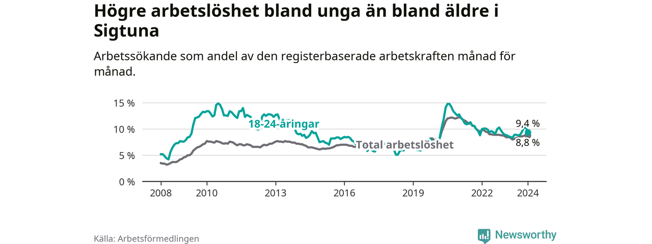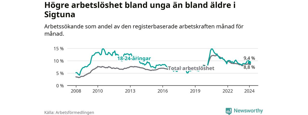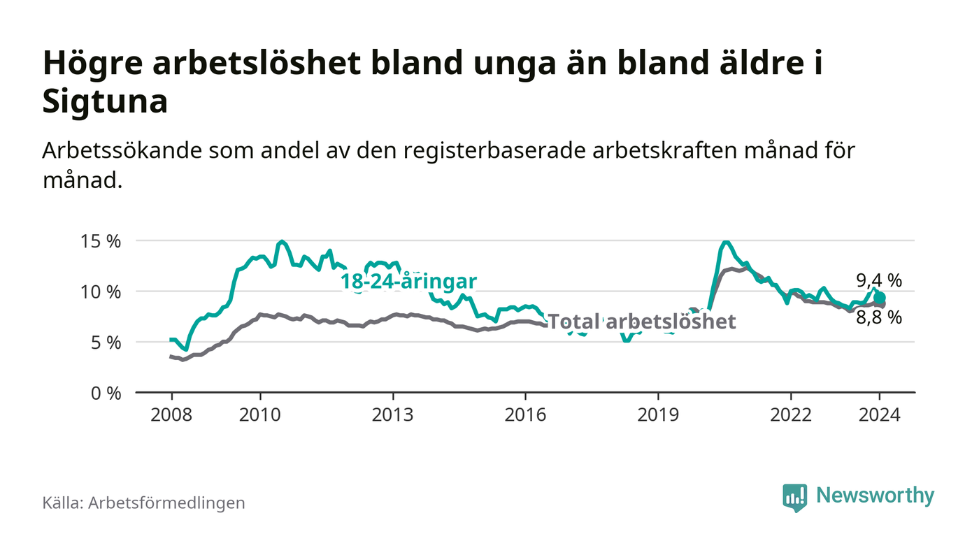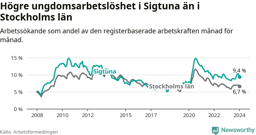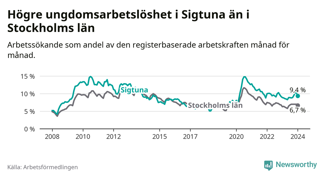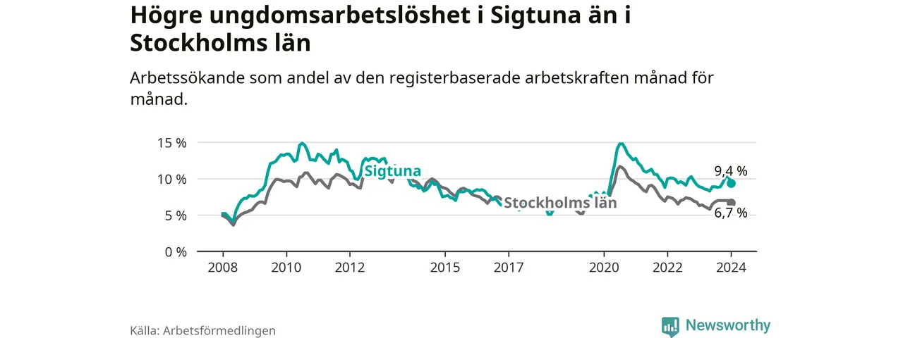 Precis som den totala arbetslösheten ligger ungdomsarbetslösheten i Sigtuna högre än i Stockholms län som helhet. Skillnaden mellan kommunen och länet är 2,7 procentenheter.