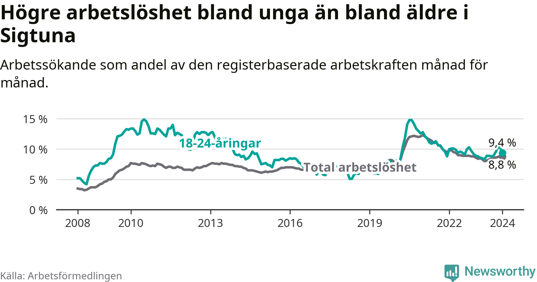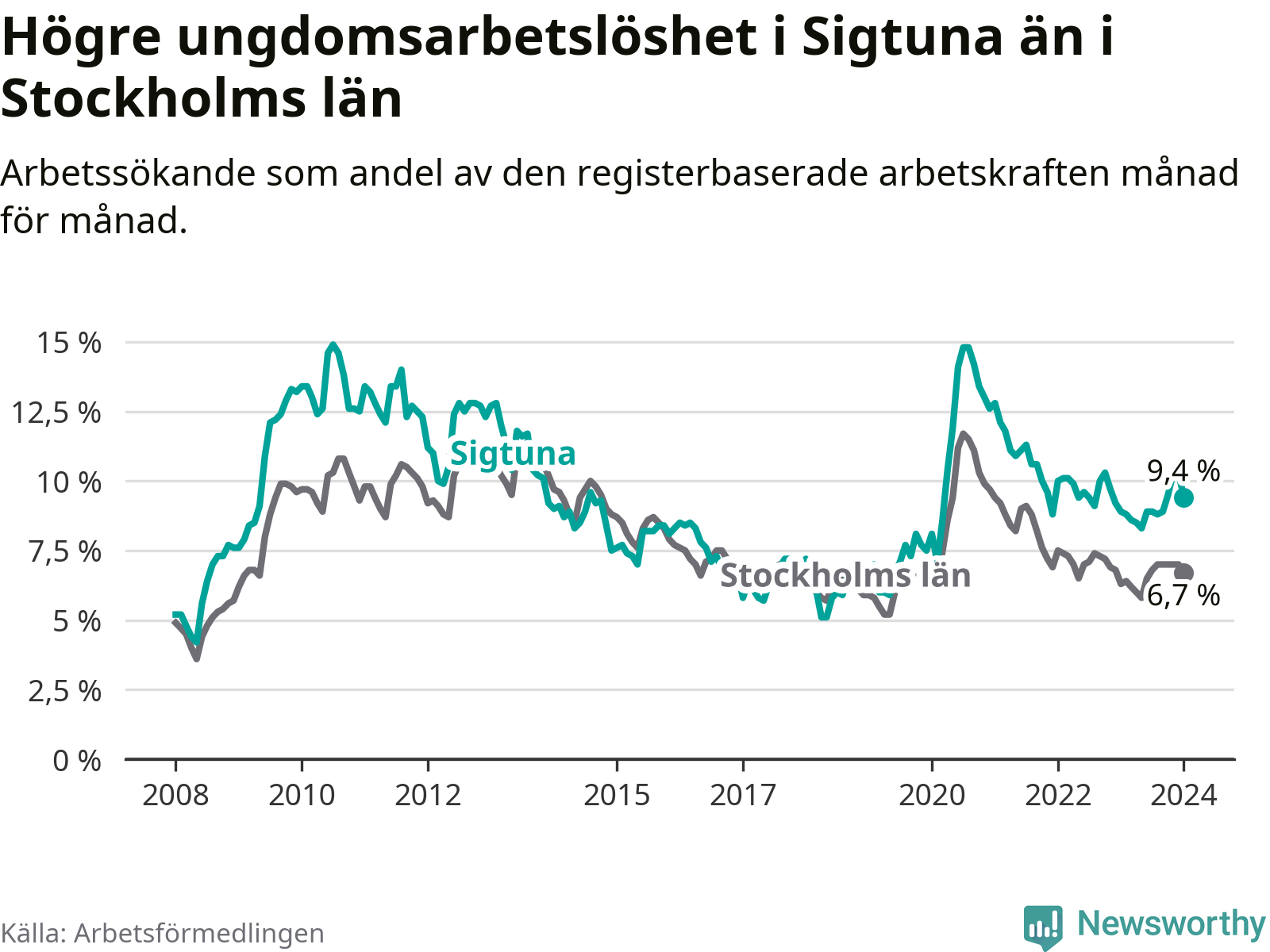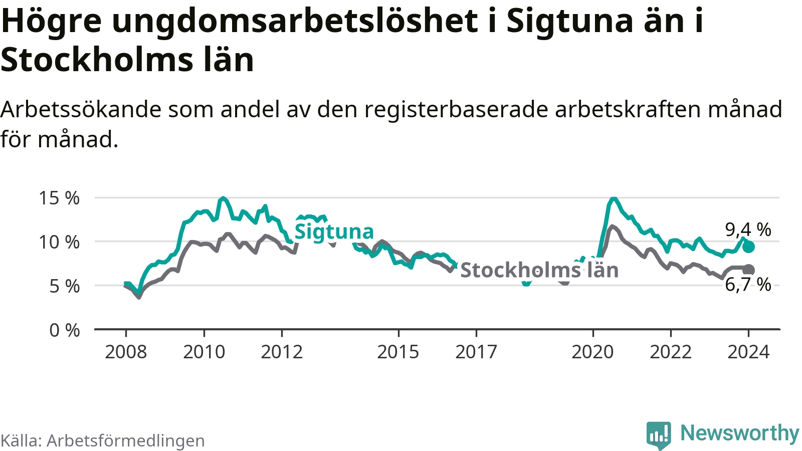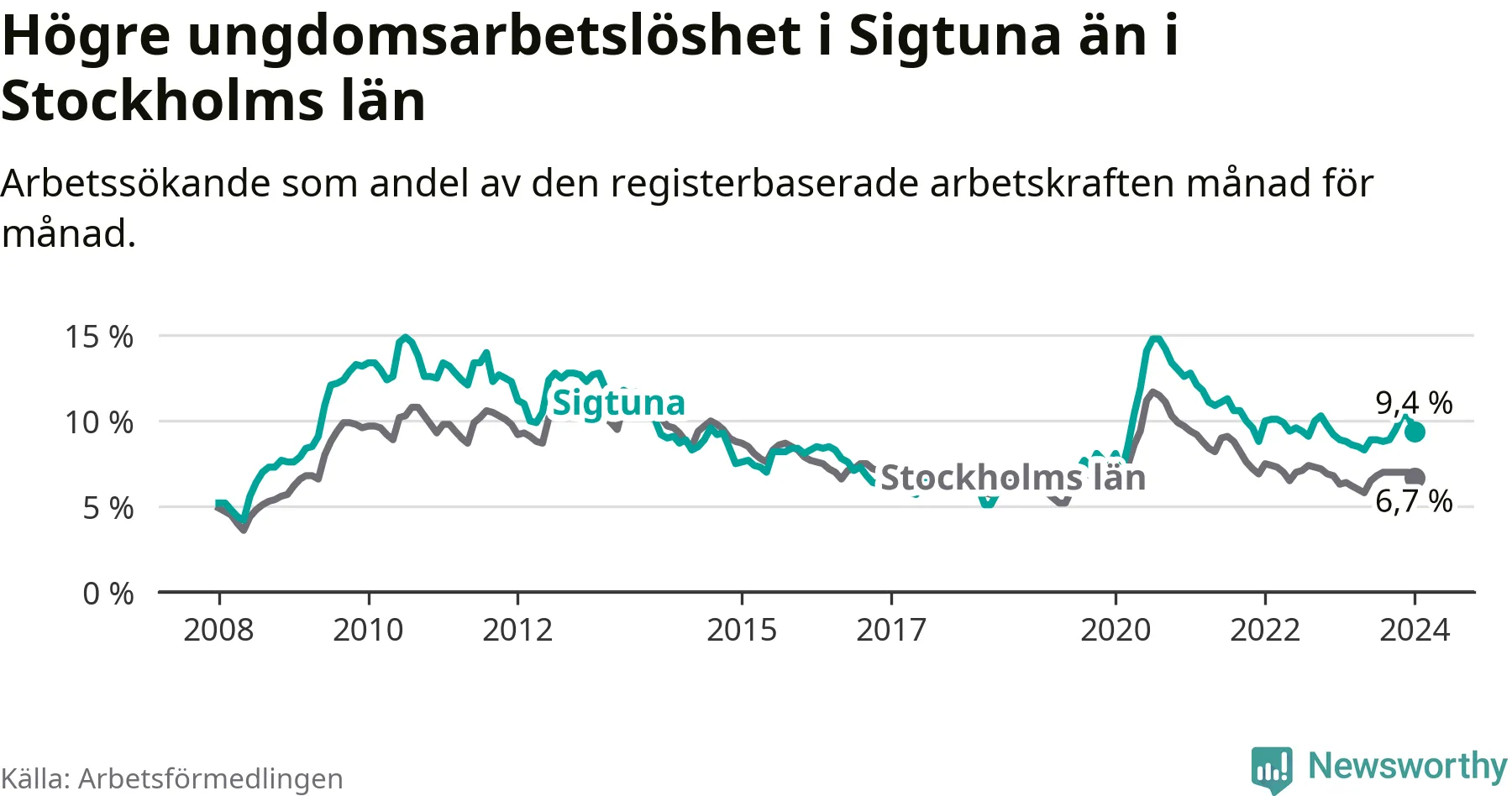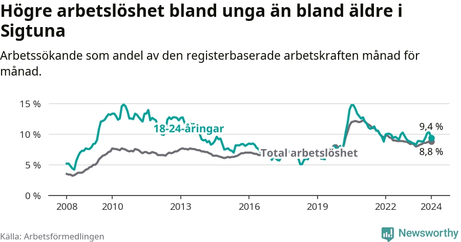 Precis som den totala arbetslösheten ligger ungdomsarbetslösheten i Sigtuna högre än i Stockholms län som helhet. Skillnaden mellan kommunen och länet är 2,7 procentenheter.