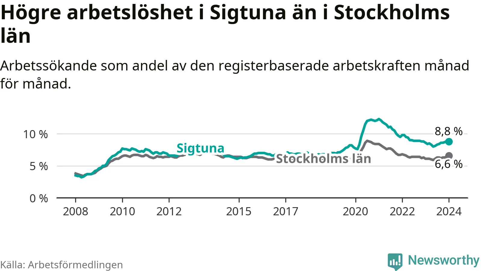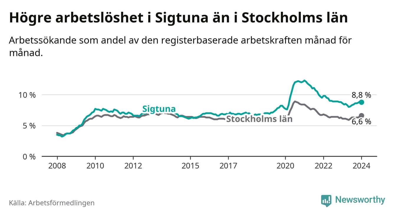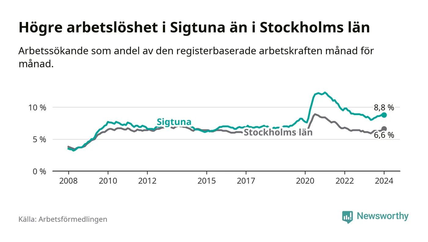 Sigtuna hade redan tidigare högre arbetslöshet än snittet i hela Stockholms län och nu växer klyftan (8,8 procent i kommunen, jämfört med 6,6 procent i hela länet). Ekerö har den lägsta arbetslösheten i länet (3,5 procent), medan Botkyrka har den högsta (11,0 procent).
