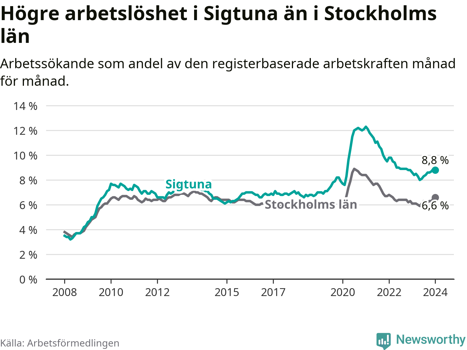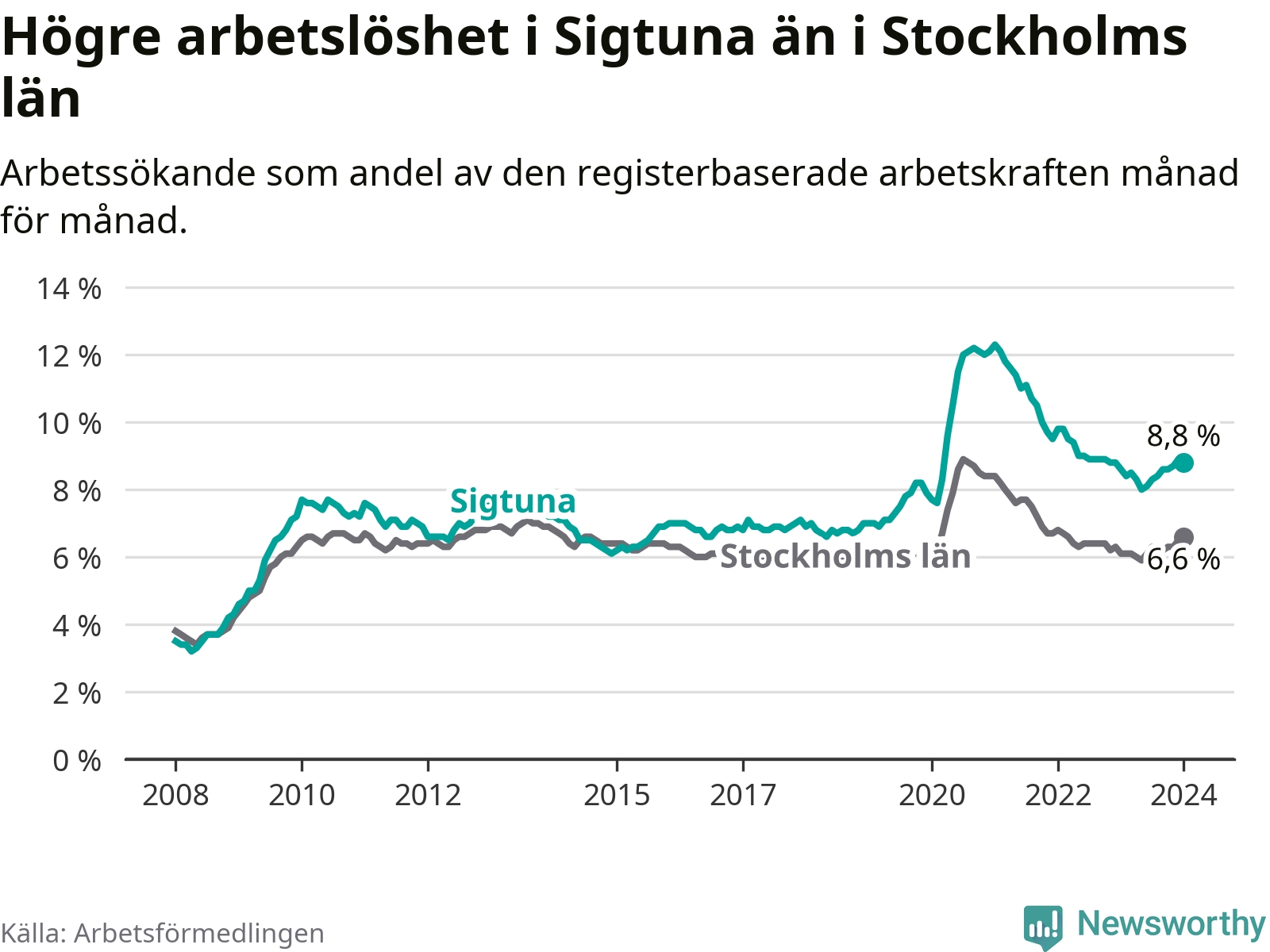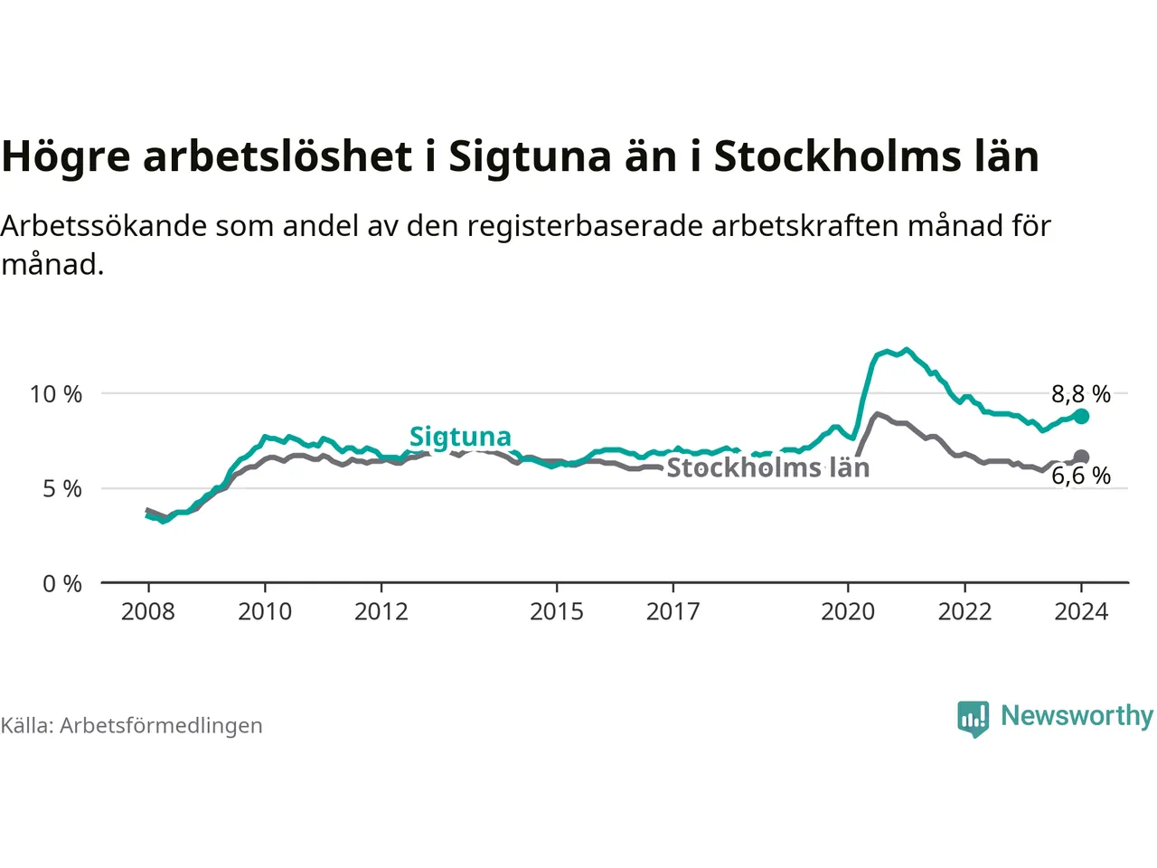 Sigtuna hade redan tidigare högre arbetslöshet än snittet i hela Stockholms län och nu växer klyftan (8,8 procent i kommunen, jämfört med 6,6 procent i hela länet). Ekerö har den lägsta arbetslösheten i länet (3,5 procent), medan Botkyrka har den högsta (11,0 procent).
