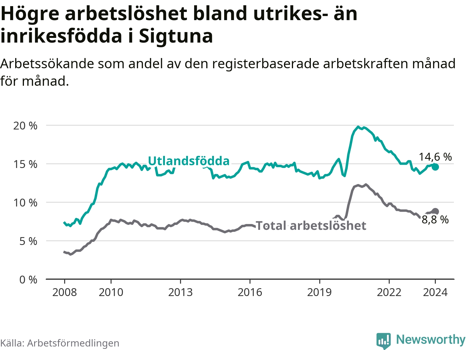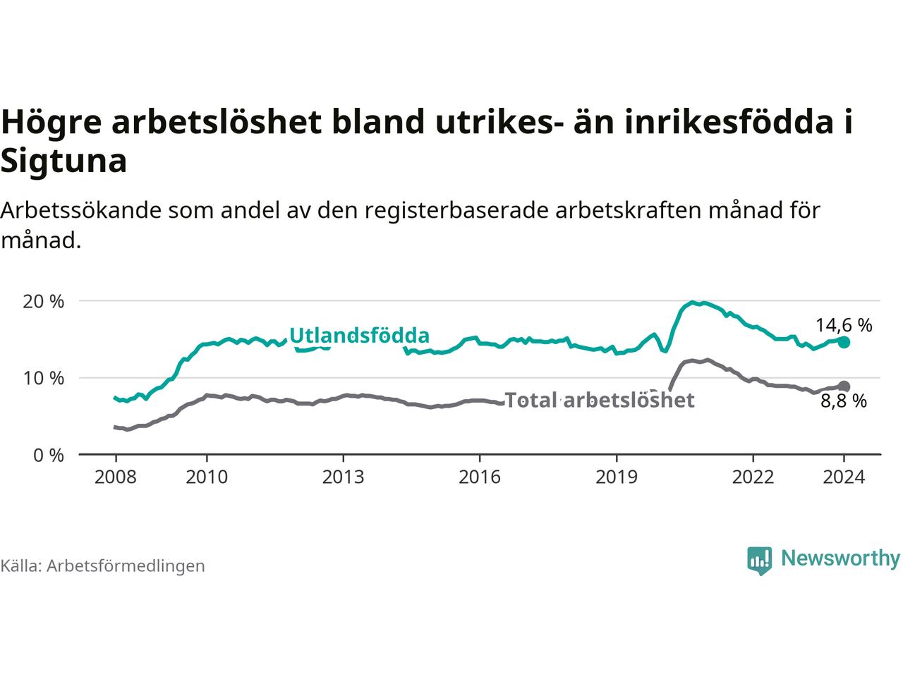 Läs mer om arbetslösheten bland utlandsfödda längre ner i den här texten.
