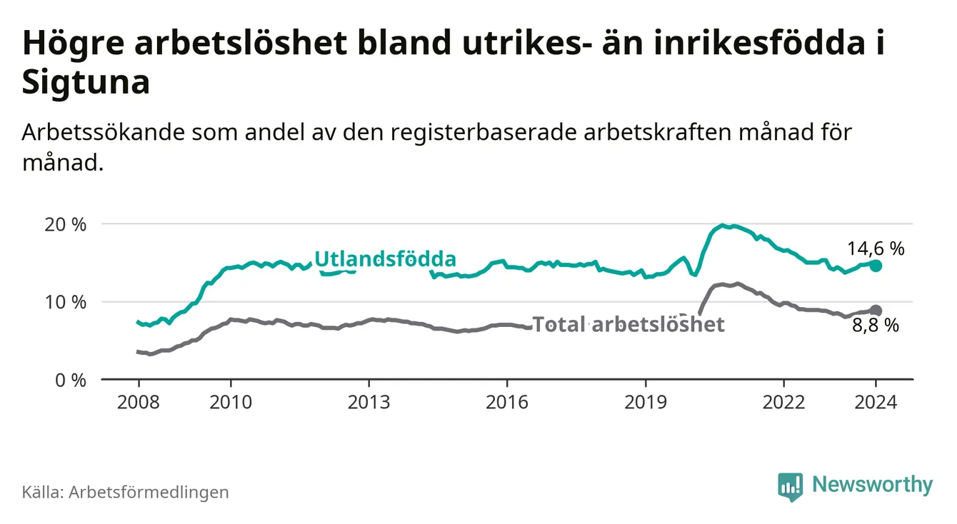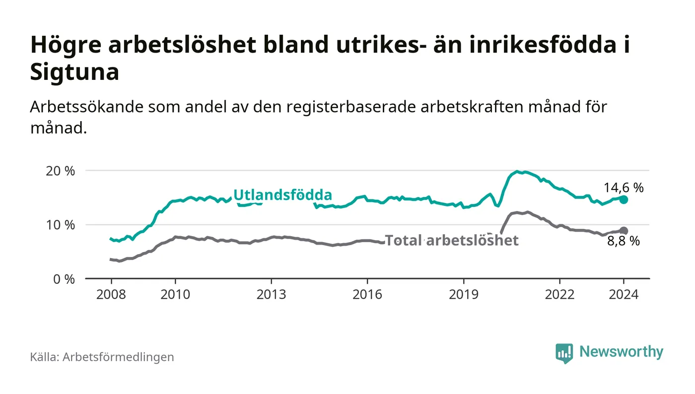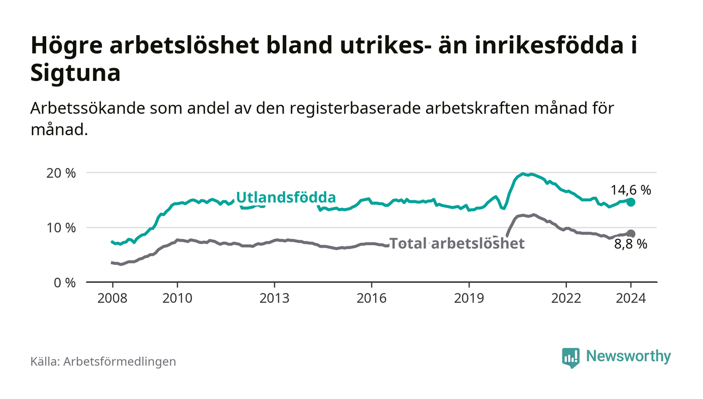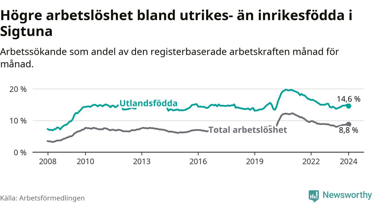 Arbetslösheten bland utlandsfödda var 14,6 procent i Sigtuna under januari månad, motsvarande 15 av 103 personer. Det är 0,3 procentenheter fler än vid samma tidpunkt i fjol (−1 653 om man räknar personer). Den senaste månadens uppgång innebär ett trendbrott. Under de 31 föregående månaderna hade arbetslösheten bland utlandsfödda varit lägre än motsvarande tidpunkt året innan.