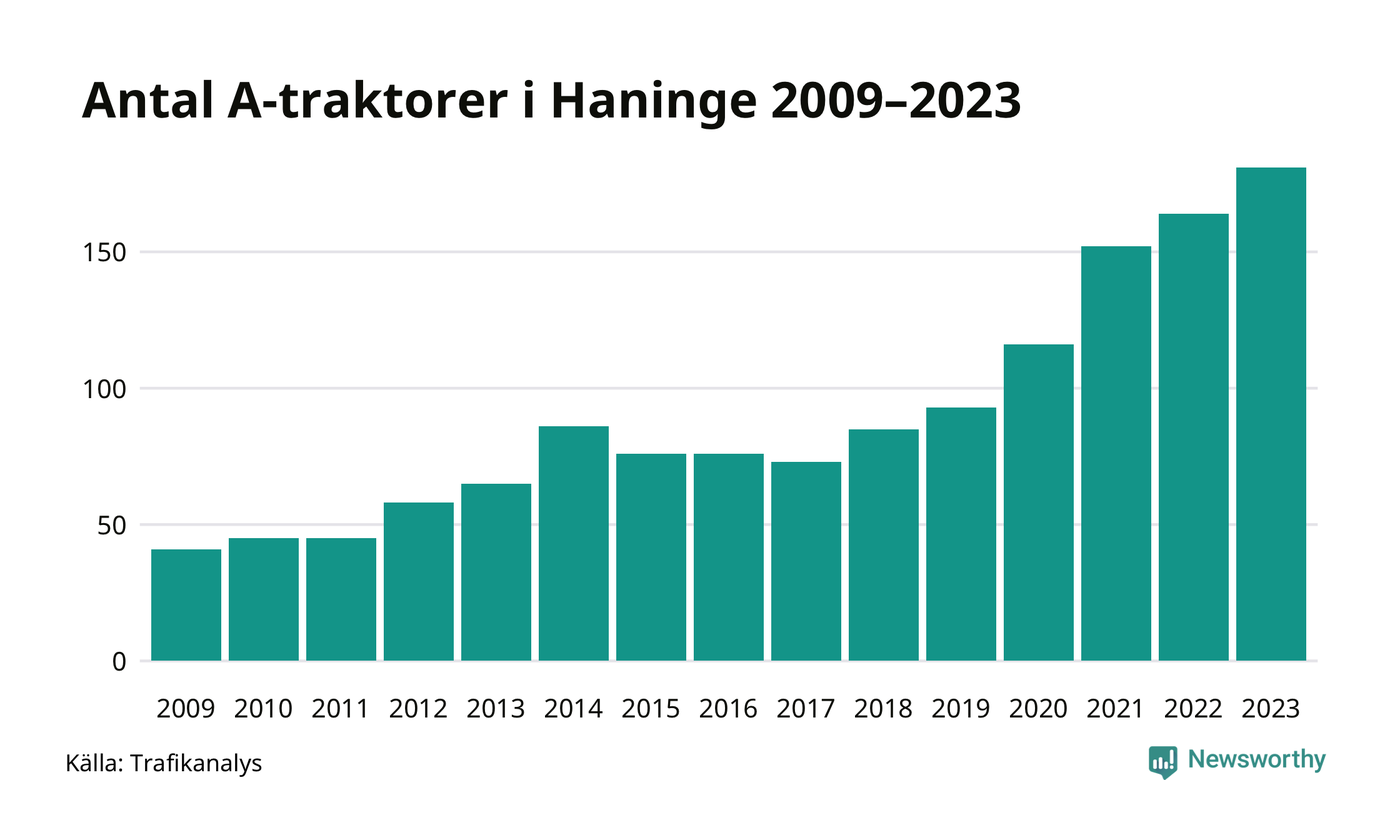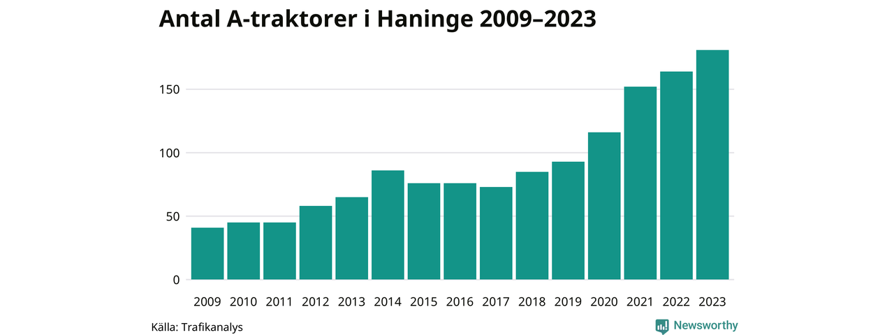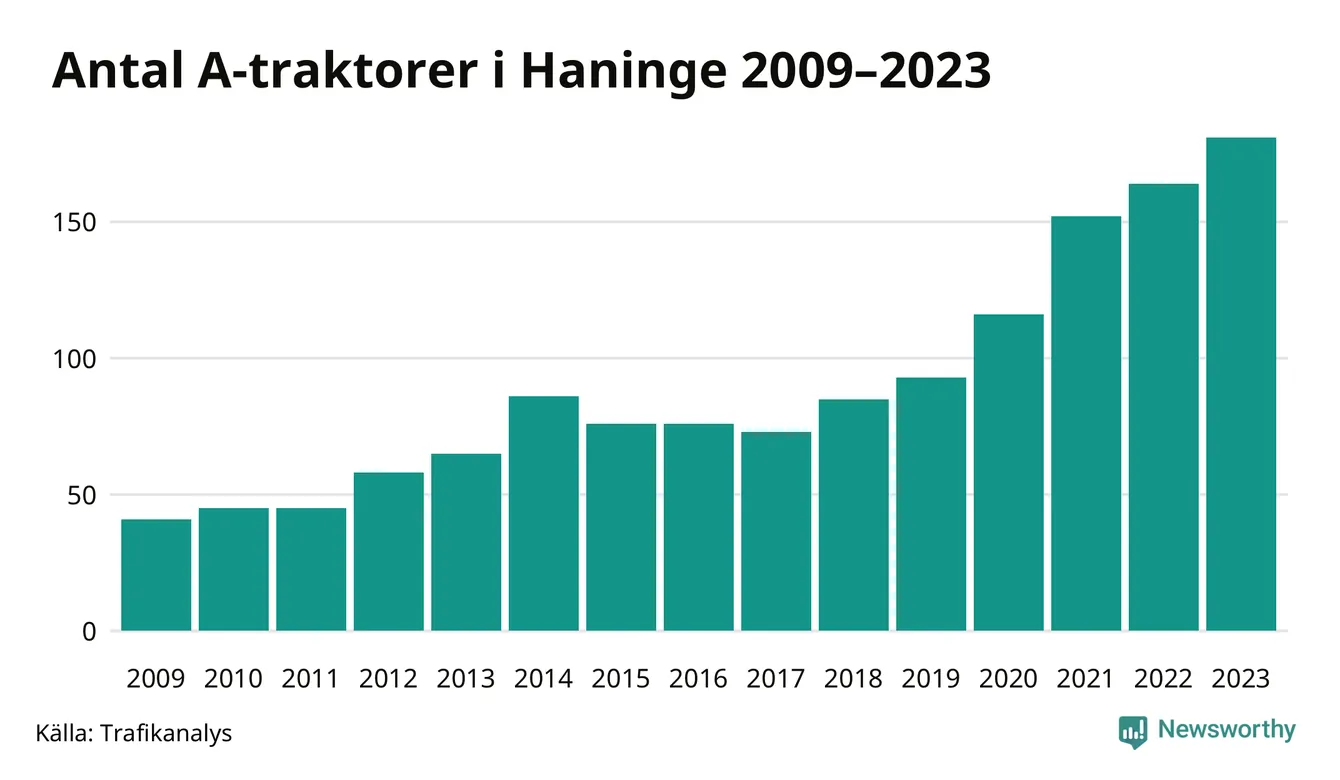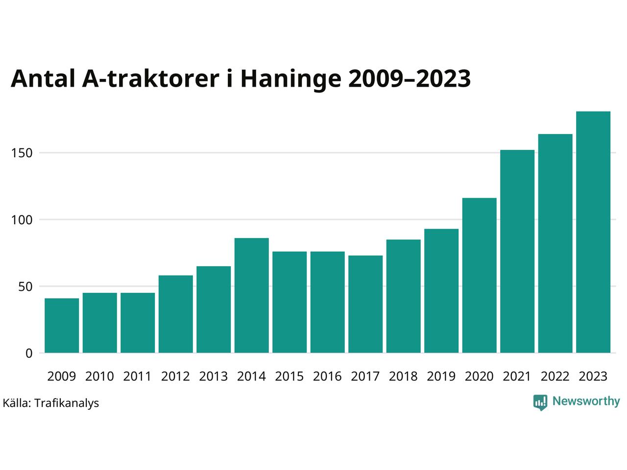 För sjätte året i rad ökar antalet A-traktorer i Haninge kommun, visar nya siffror från Trafikanalys. I slutet av 2023 fanns 181 A-traktorer registrerade i kommunen, vilket är 17 fler än året innan – en ökning med 10 procent. Inte sedan åtminstone 2009, som är det första året vi har statistik för, har det funnits så många A-traktorer i kommunen.
