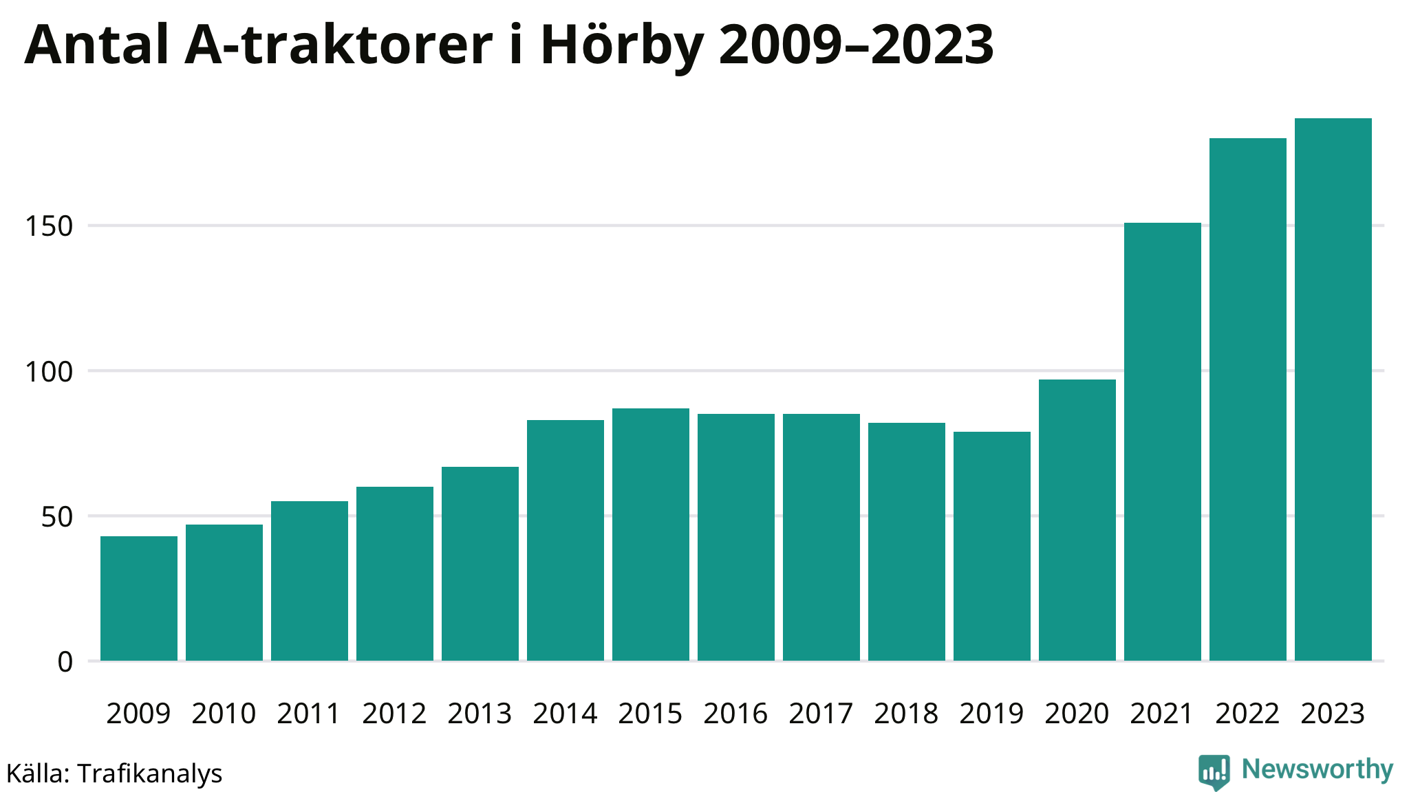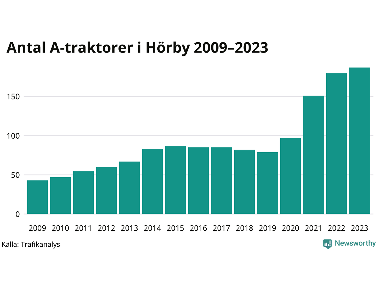 För fjärde året i rad ökar antalet A-traktorer i Hörby kommun, visar nya siffror från Trafikanalys. I slutet av 2023 fanns 187 A-traktorer registrerade i kommunen, vilket är sju fler än året innan – en ökning med 4 procent. Inte sedan åtminstone 2009, som är det första året vi har statistik för, har det funnits så många A-traktorer i kommunen.