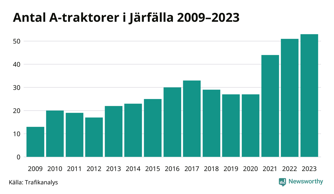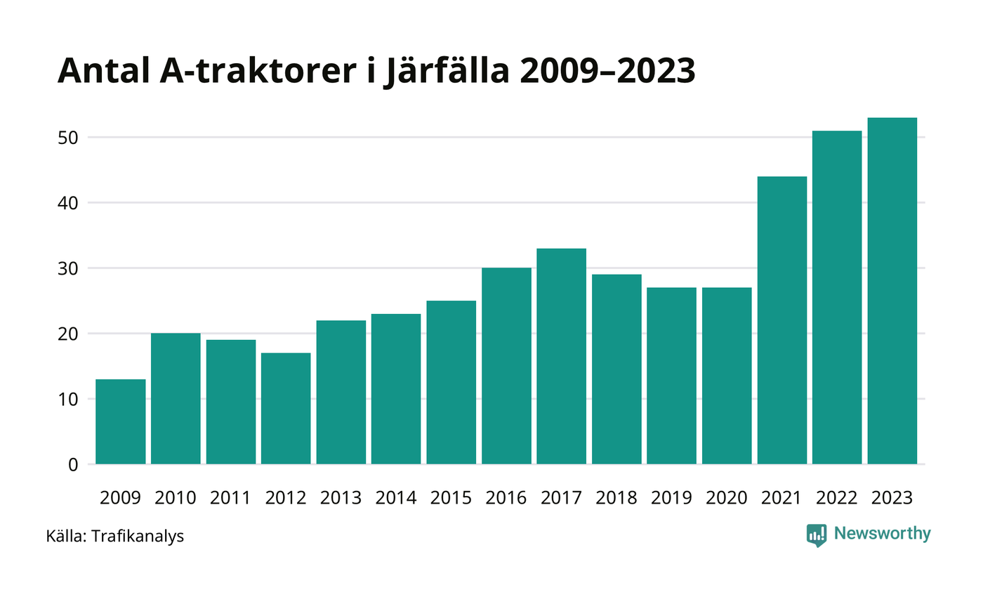 Under det senaste decenniet har antalet A-traktorer mer än fyrdubblats i Sverige – och under 2023 fortsatte utvecklingen. Så många finns i Järfälla kommun.