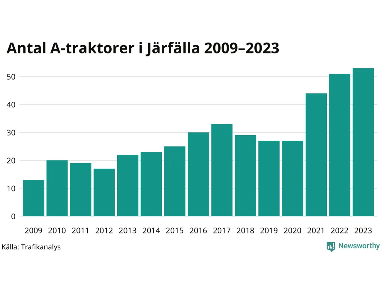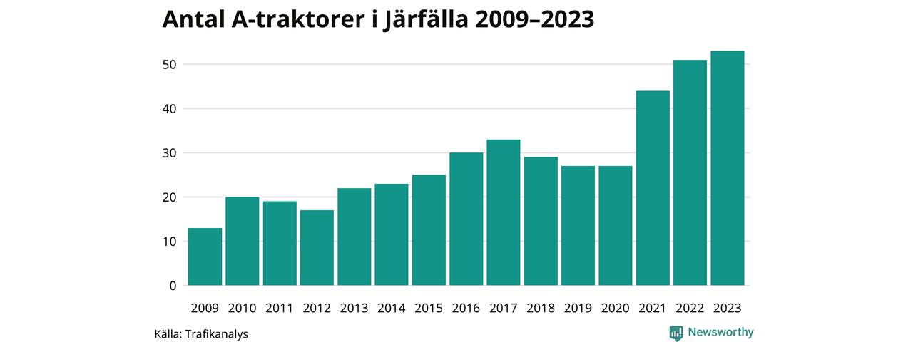 För tredje året i rad ökar antalet A-traktorer i Järfälla kommun, visar nya siffror från Trafikanalys. I slutet av 2023 fanns 53 A-traktorer registrerade i kommunen, vilket är två fler än året innan. Det visar nya siffror från Trafikanalys. Inte sedan åtminstone 2009, som är det första året vi har statistik för, har det funnits så många A-traktorer i kommunen.