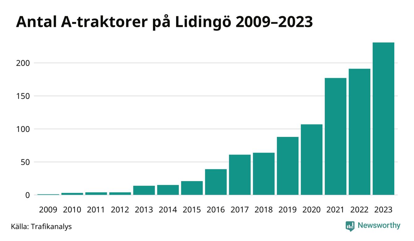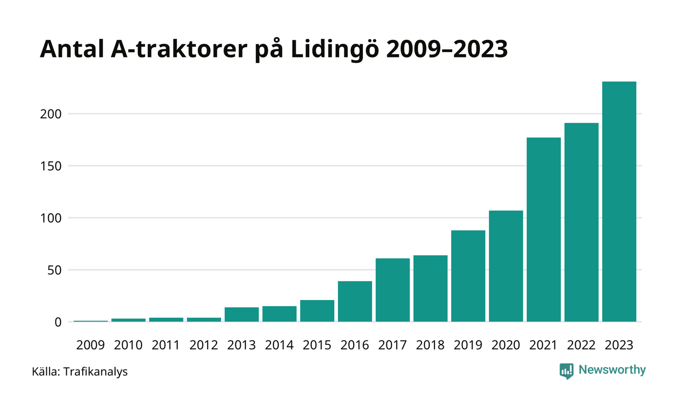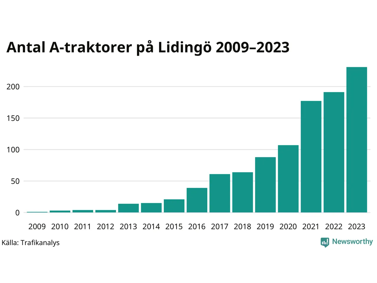 Stockholms län följer samma mönster. Jämfört med 2009 har antalet sexdubblats – från knappt 700 till drygt 3 700 i slutet av 2023. Även på Lidingö har A-traktorerna blivit betydligt fler – antalet har tvåhundratrettioettdubblats sedan 2009. Det är den största, procentuella, ökningen i landet.