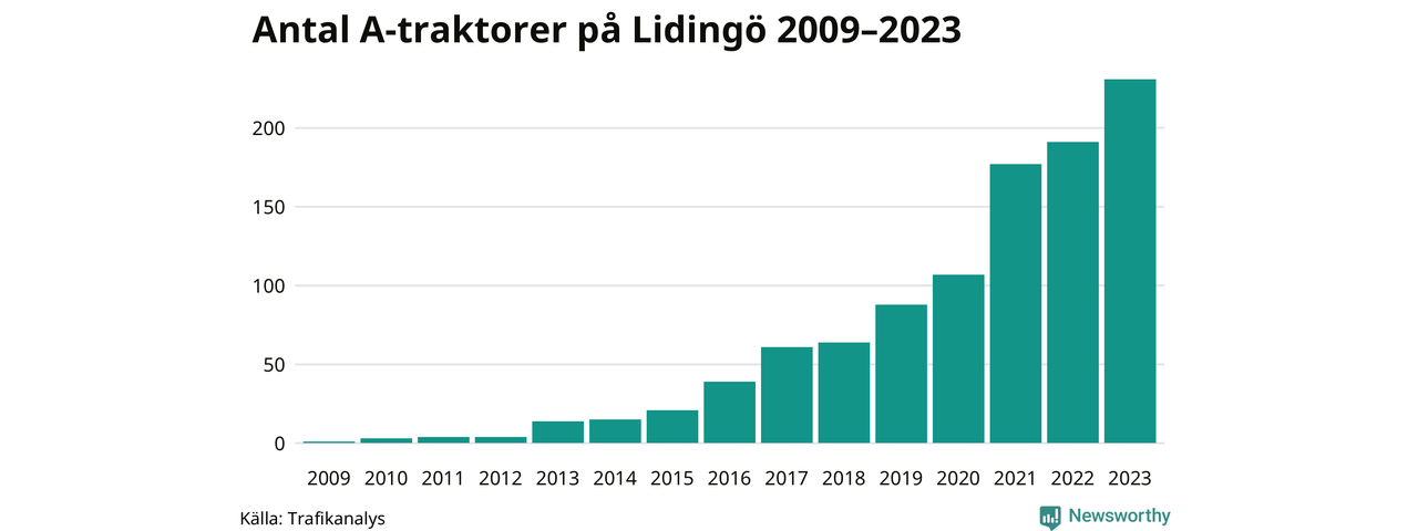 För elfte året i rad ökar antalet A-traktorer i Lidingö kommun, visar nya siffror från Trafikanalys. I slutet av 2023 fanns 231 A-traktorer registrerade i kommunen, vilket är 40 fler än året innan – en ökning med 21 procent. Inte sedan åtminstone 2009, som är det första året vi har statistik för, har det funnits så många A-traktorer i kommunen.