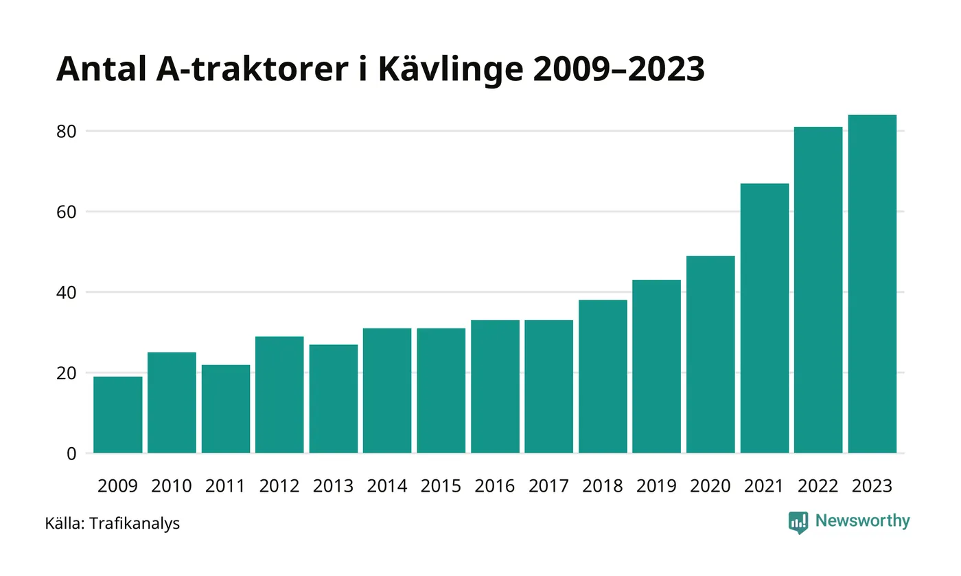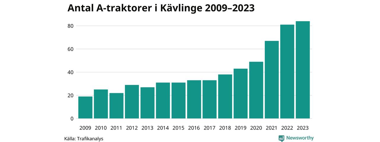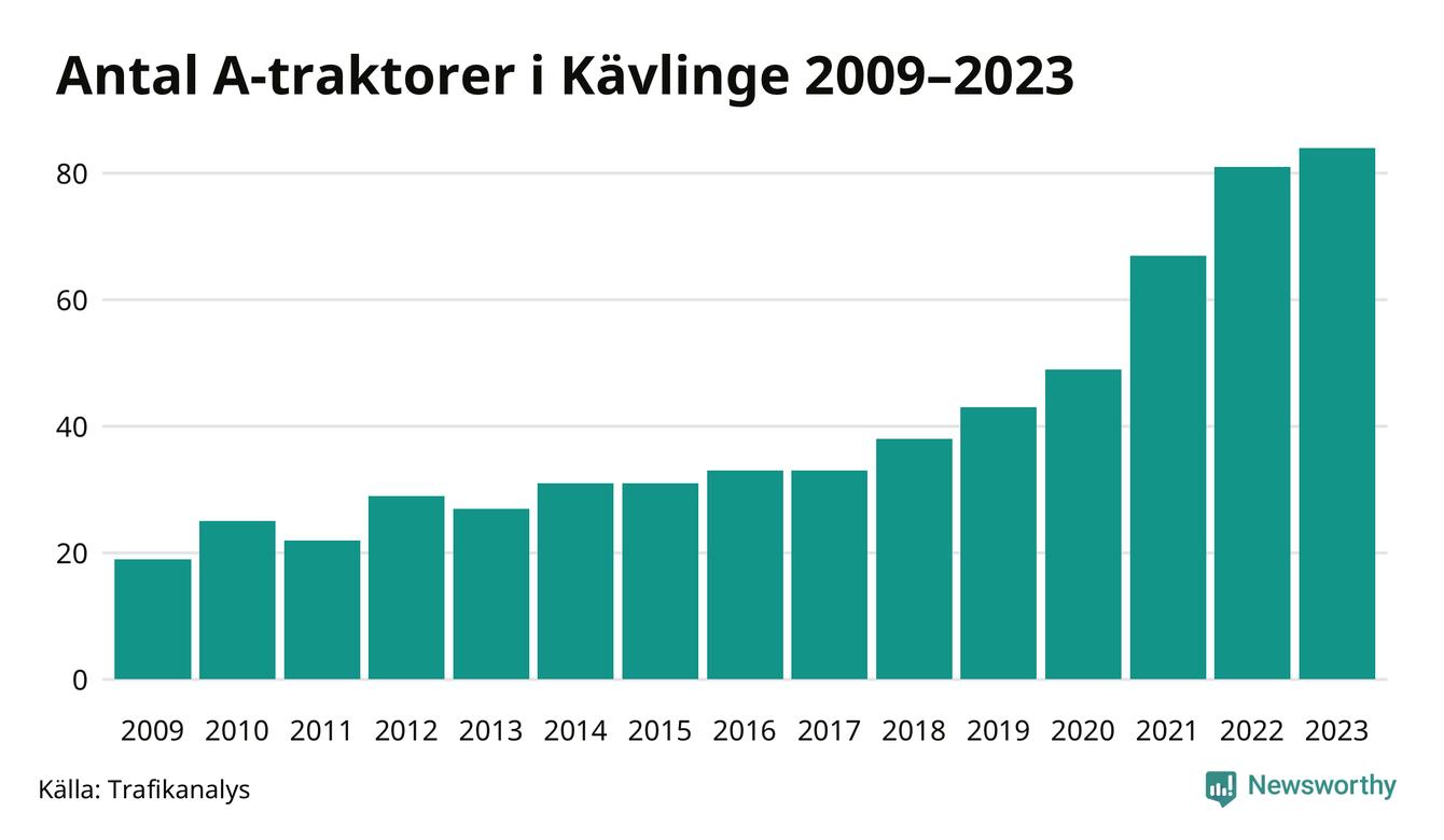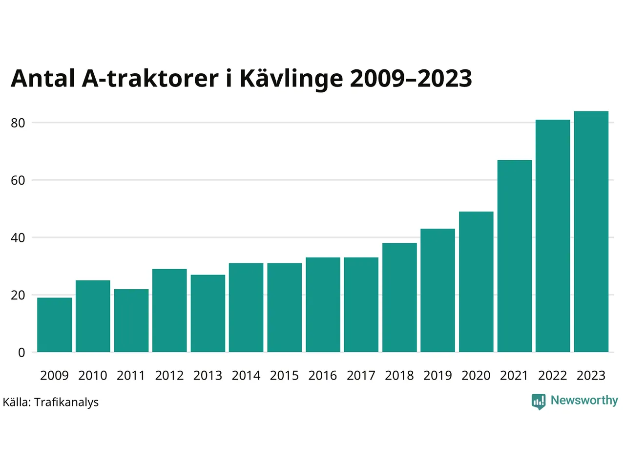 För sjätte året i rad ökar antalet A-traktorer i Kävlinge kommun, visar nya siffror från Trafikanalys. I slutet av 2023 fanns 84 A-traktorer registrerade i kommunen, vilket är tre fler än året innan. Inte sedan åtminstone 2009, som är det första året vi har statistik för, har det funnits så många A-traktorer i kommunen.