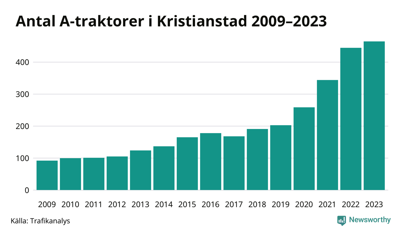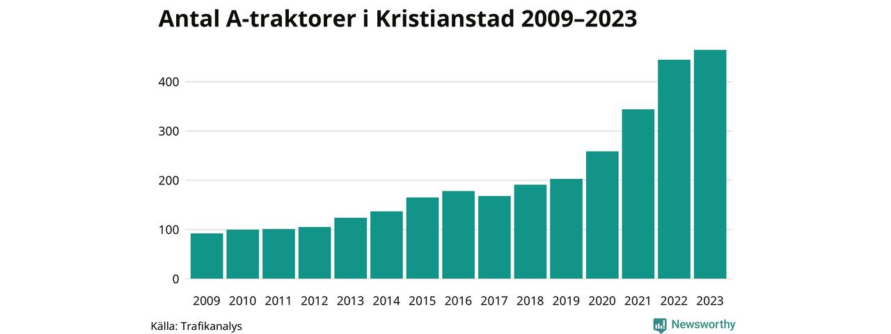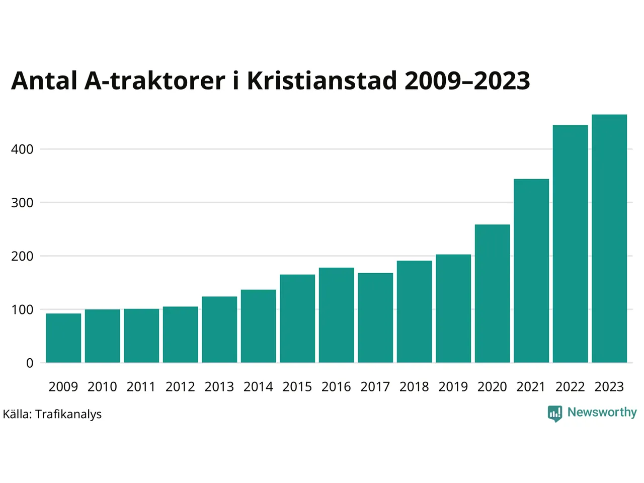 För sjätte året i rad ökar antalet A-traktorer i Kristianstads kommun, visar nya siffror från Trafikanalys. I slutet av 2023 fanns 465 A-traktorer registrerade i kommunen, vilket är 20 fler än året innan – en ökning med 4 procent. Inte sedan åtminstone 2009, som är det första året vi har statistik för, har det funnits så många A-traktorer i kommunen.