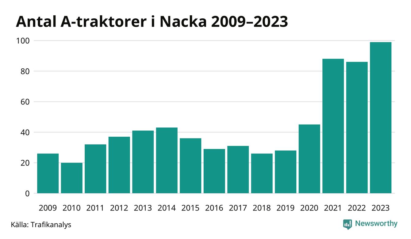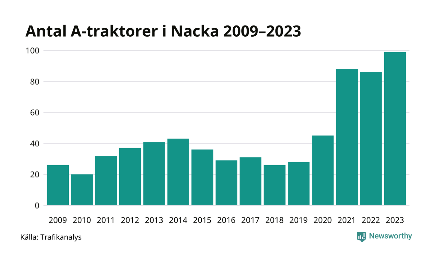 Under det senaste decenniet har antalet A-traktorer mer än fyrdubblats i Sverige – och under 2023 fortsatte utvecklingen. Även i Nacka blev de fler.