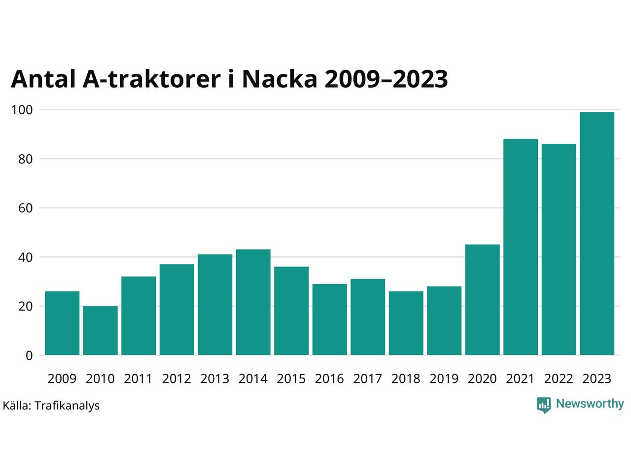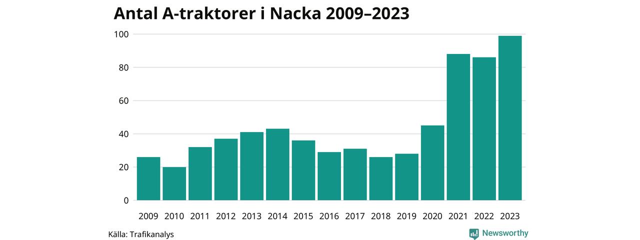 I slutet av 2023 fanns 99 A-traktorer registrerade i kommunen, vilket är 13 fler än året innan – en ökning med 15 procent. Det visar nya siffror från Trafikanalys. Inte sedan åtminstone 2009, som är det första året vi har statistik för, har det funnits så många A-traktorer i kommunen.