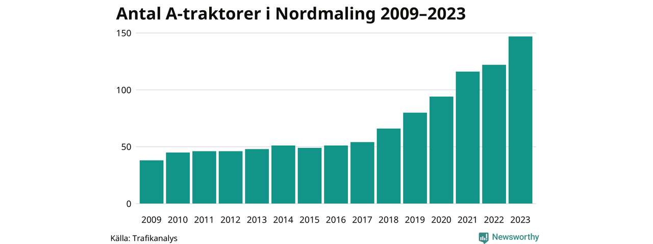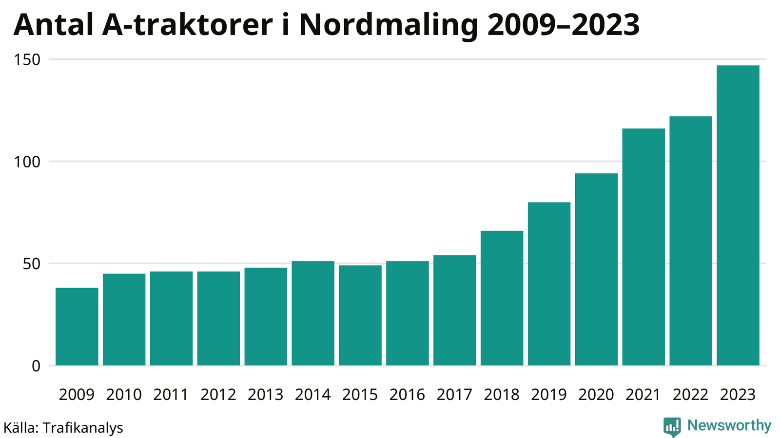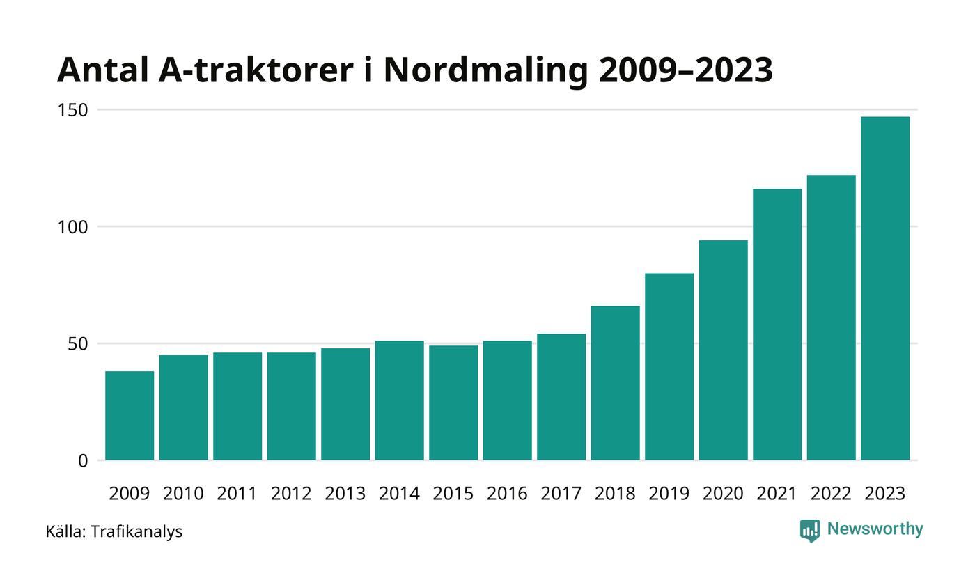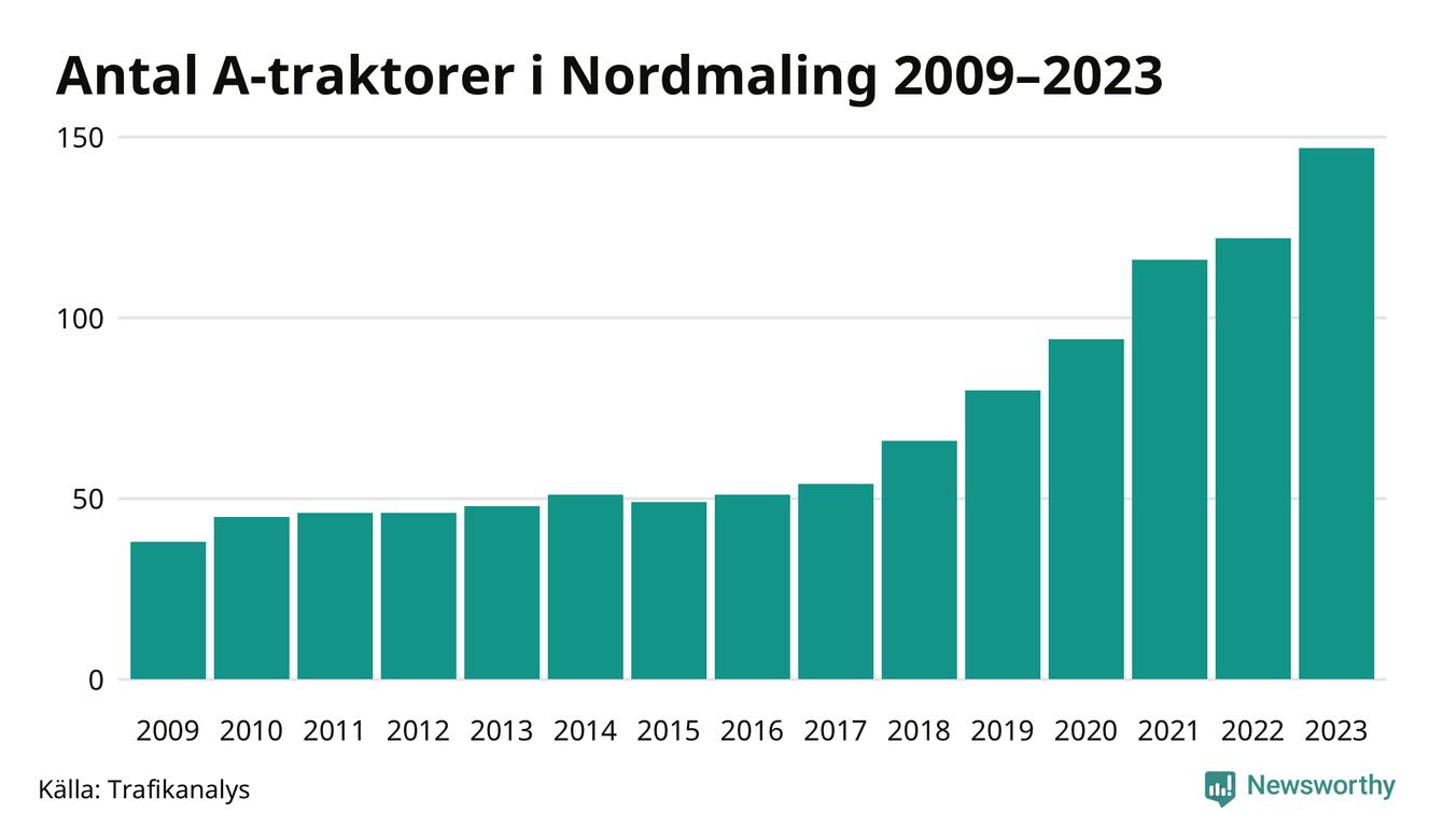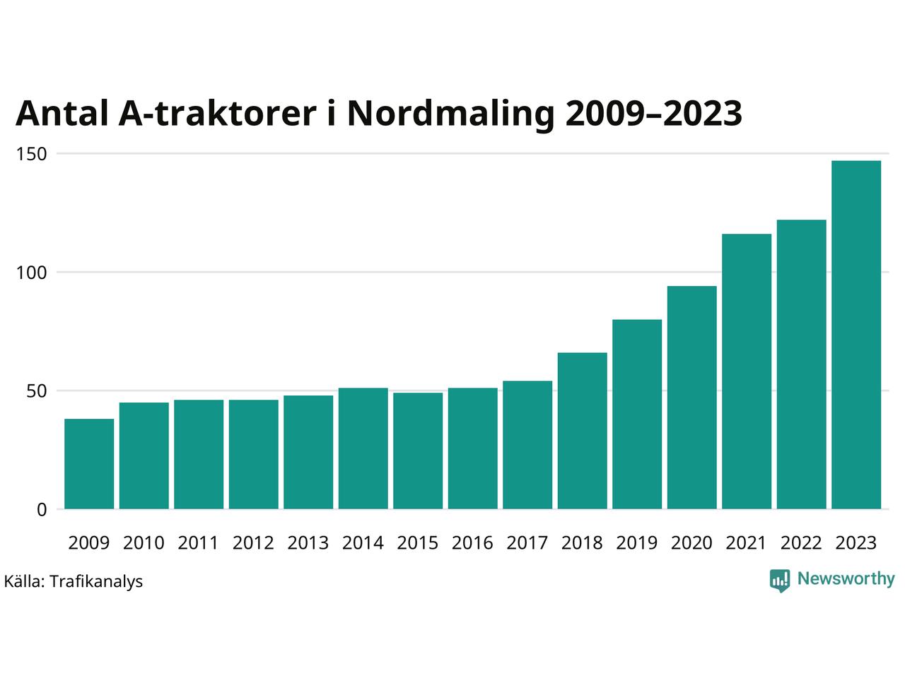 För åttonde året i rad ökar antalet A-traktorer i Nordmalings kommun, visar nya siffror från Trafikanalys. I slutet av 2023 fanns 147 A-traktorer registrerade i kommunen, vilket är 25 fler än året innan – en ökning med 20 procent. Det är den största ökningen från ett år till ett annat sedan åtminstone 2009 och den näst största ökningen i Västerbottens län i år. Inte sedan åtminstone 2009, som är det första året vi har statistik för, har det funnits så många A-traktorer i kommunen.