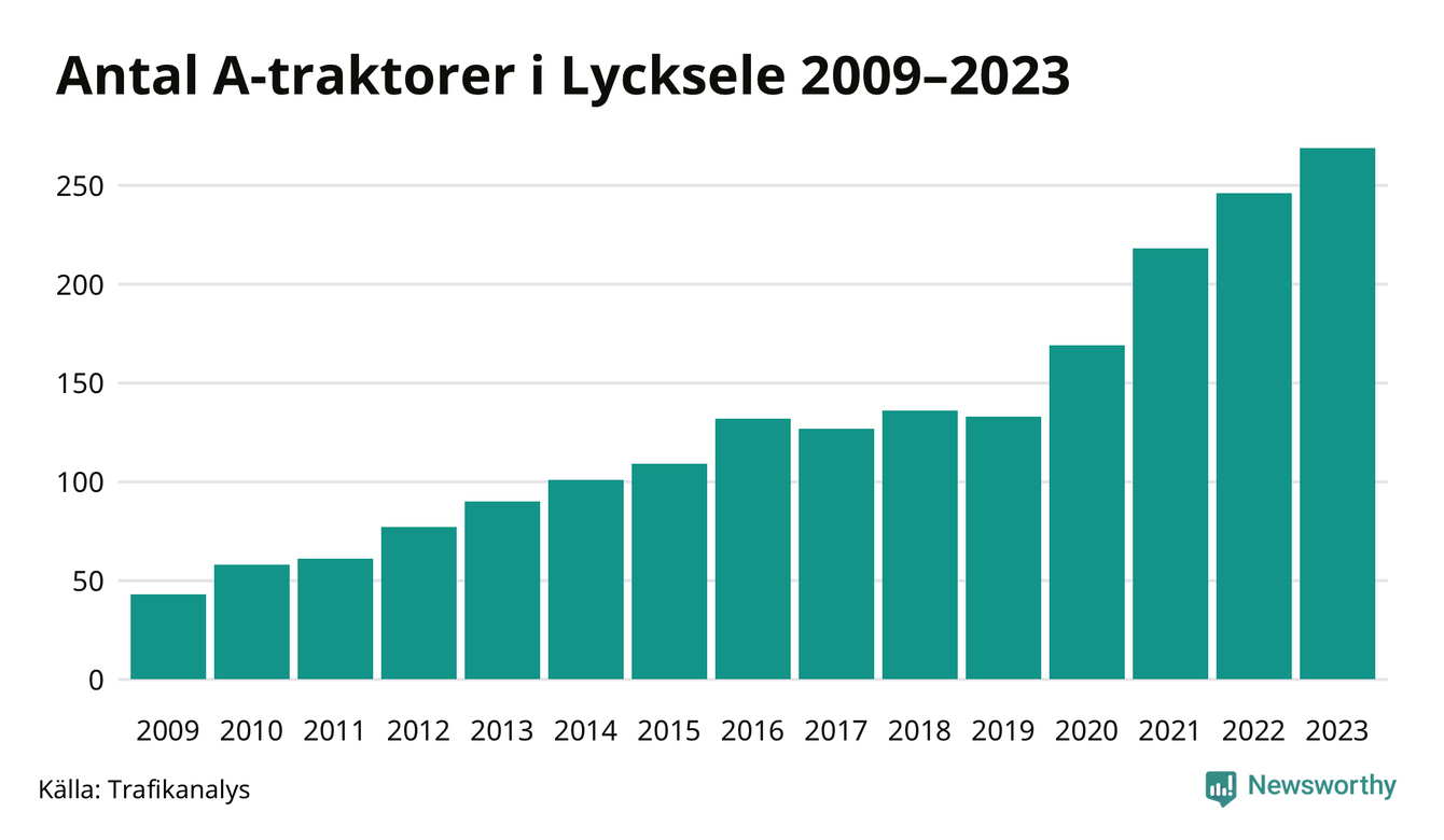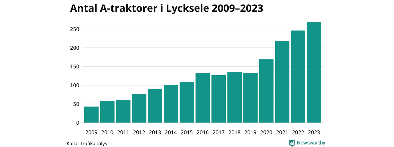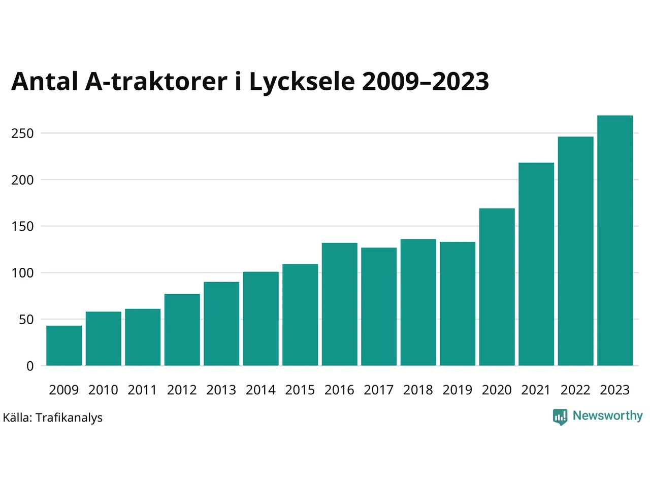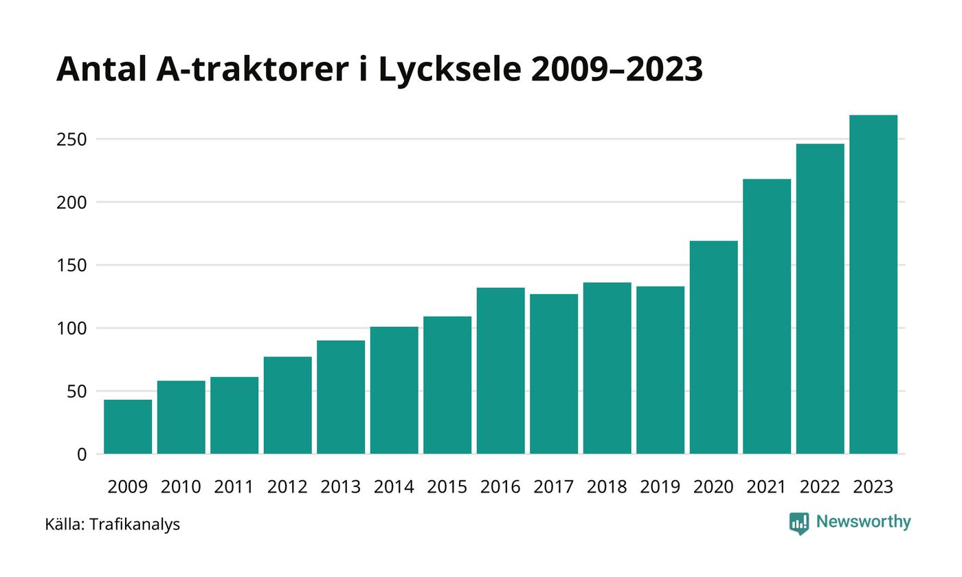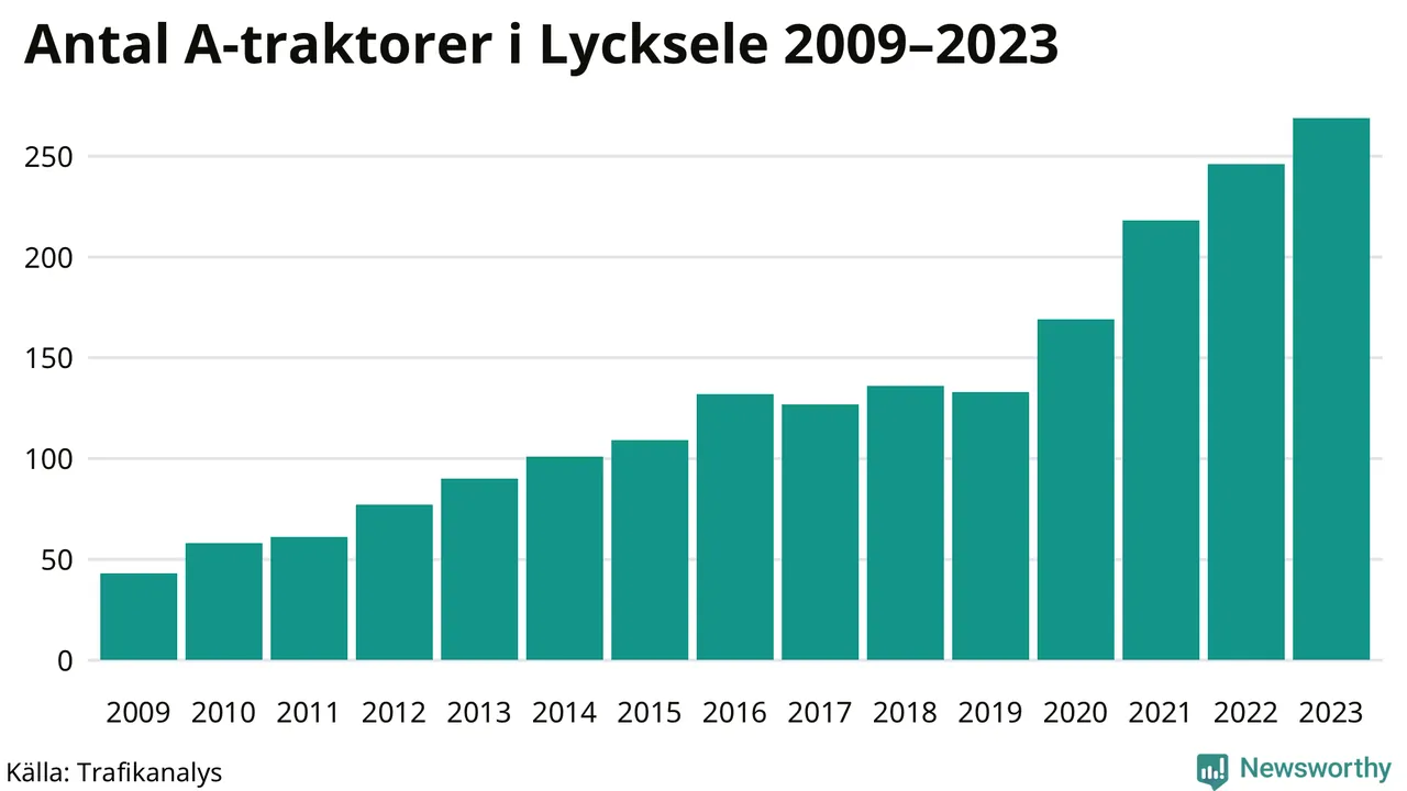 För fjärde året i rad ökar antalet A-traktorer i Lycksele kommun, visar nya siffror från Trafikanalys. I slutet av 2023 fanns 269 A-traktorer registrerade i kommunen, vilket är 23 fler än året innan – en ökning med 9 procent. Inte sedan åtminstone 2009, som är det första året vi har statistik för, har det funnits så många A-traktorer i kommunen.