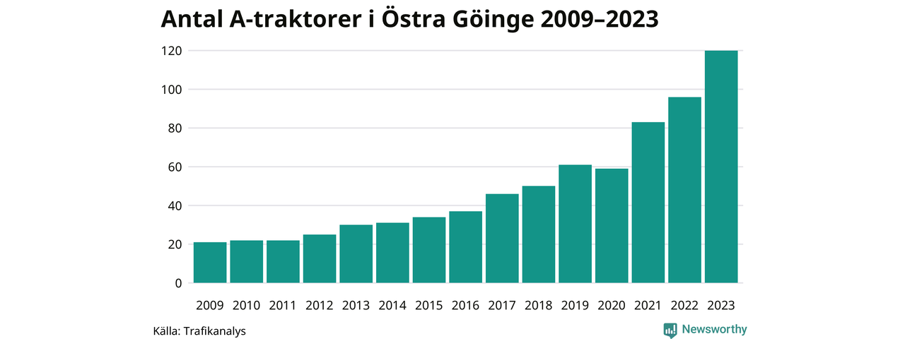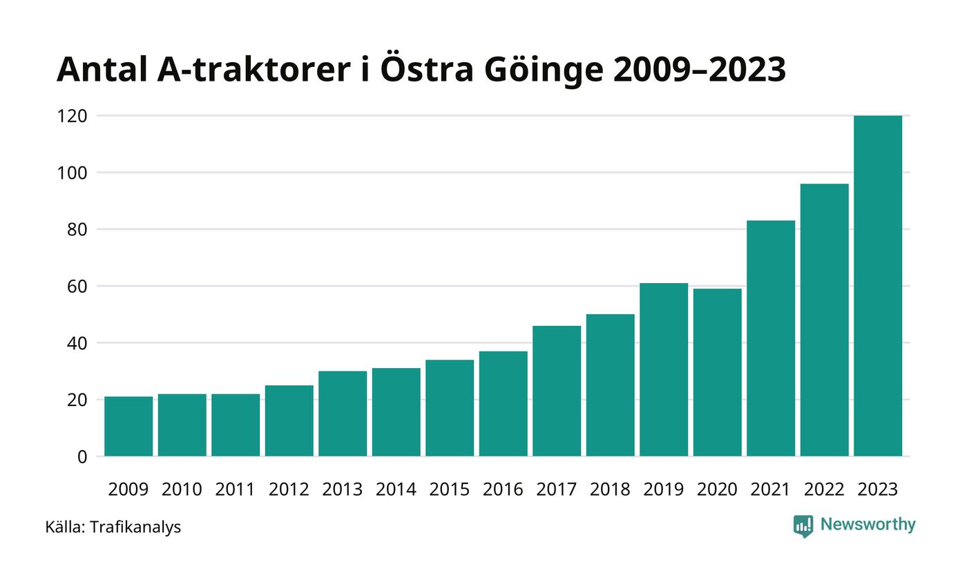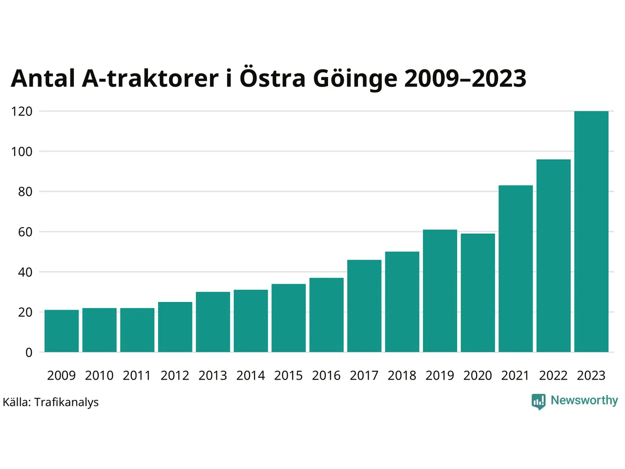 För tredje året i rad ökar antalet A-traktorer i Östra Göinge kommun, visar nya siffror från Trafikanalys. I slutet av 2023 fanns 120 A-traktorer registrerade i kommunen, vilket är 24 fler än året innan – en ökning med 25 procent. Det visar nya siffror från Trafikanalys. Det är den största ökningen från ett år till ett annat sedan åtminstone 2009 och den näst största ökningen i Skåne län i år. Inte sedan åtminstone 2009, som är det första året vi har statistik för, har det funnits så många A-traktorer i kommunen.