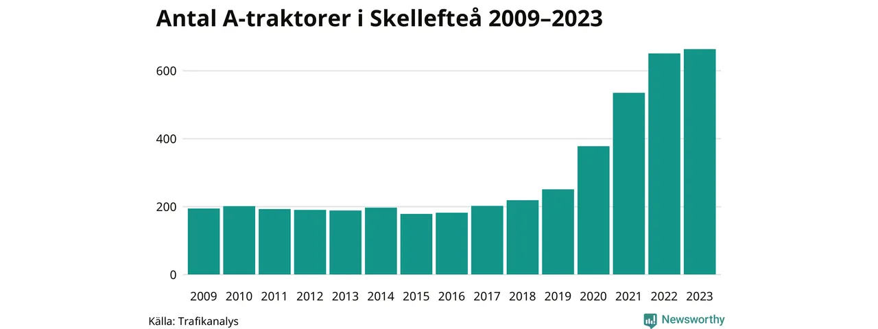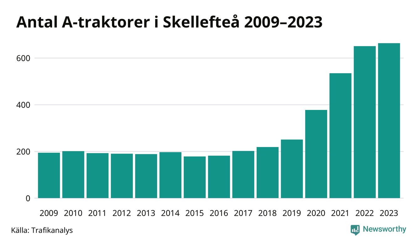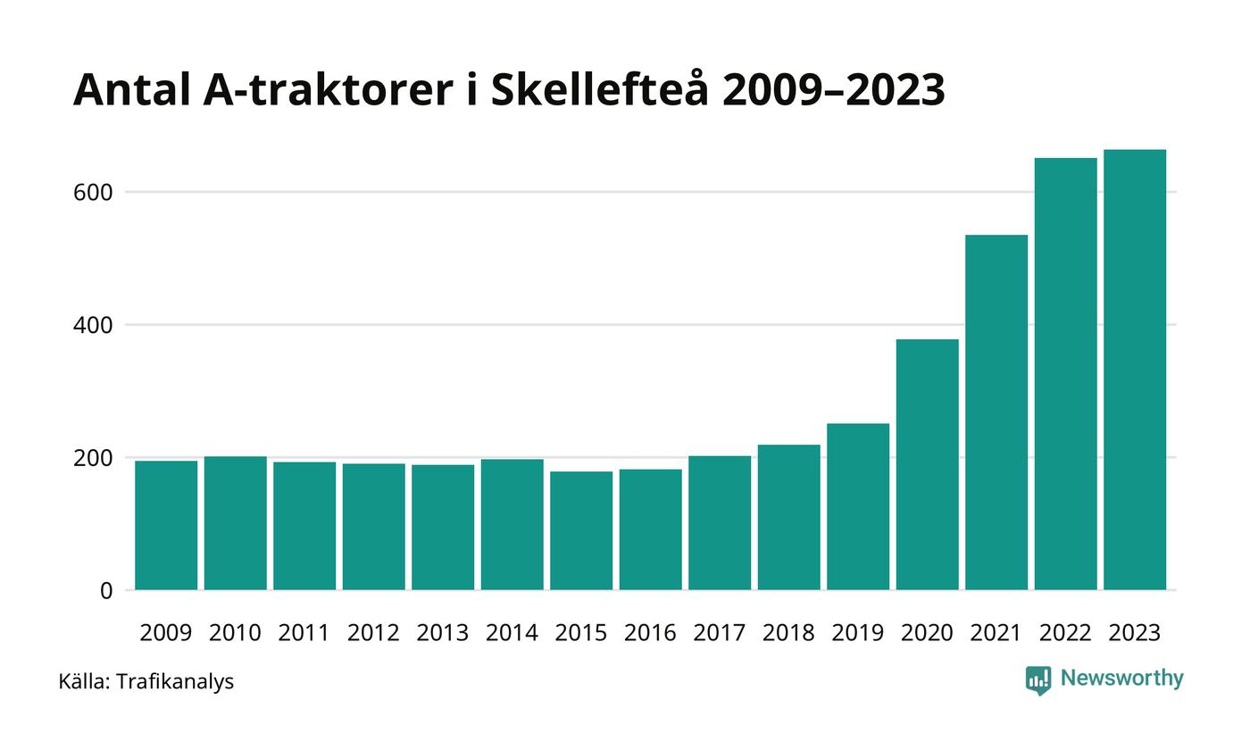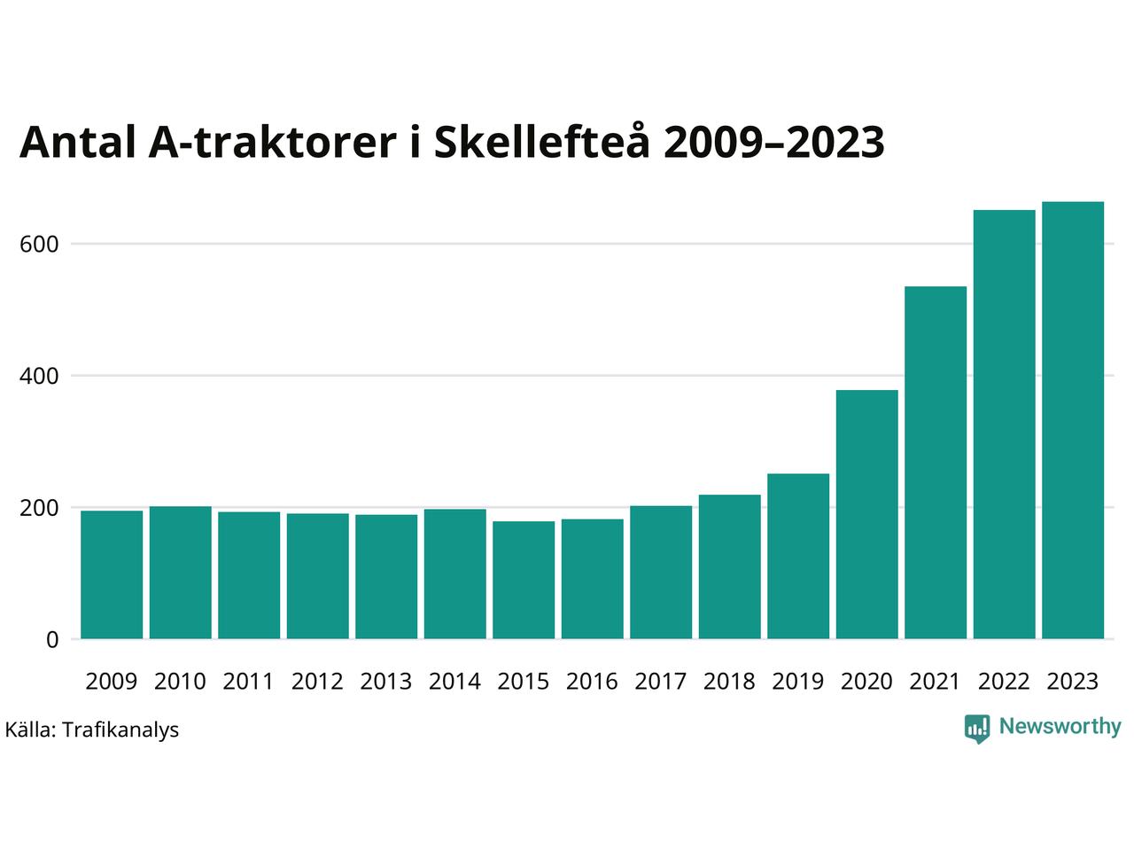 För åttonde året i rad ökar antalet A-traktorer i Skellefteå kommun, visar nya siffror från Trafikanalys. I slutet av 2023 fanns 664 A-traktorer registrerade i kommunen, vilket är 13 fler än året innan – en ökning med 2 procent. Inte sedan åtminstone 2009, som är det första året vi har statistik för, har det funnits så många A-traktorer i kommunen.