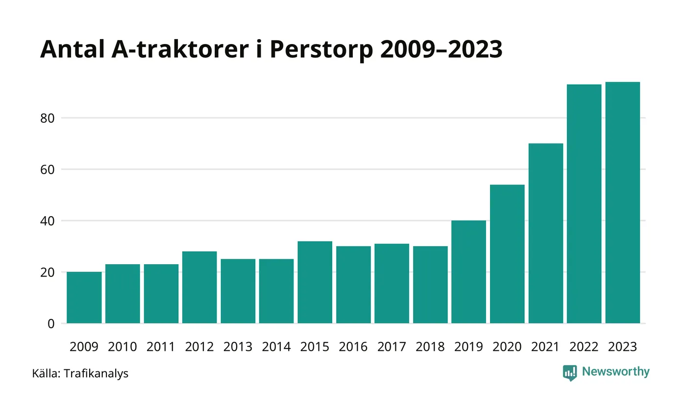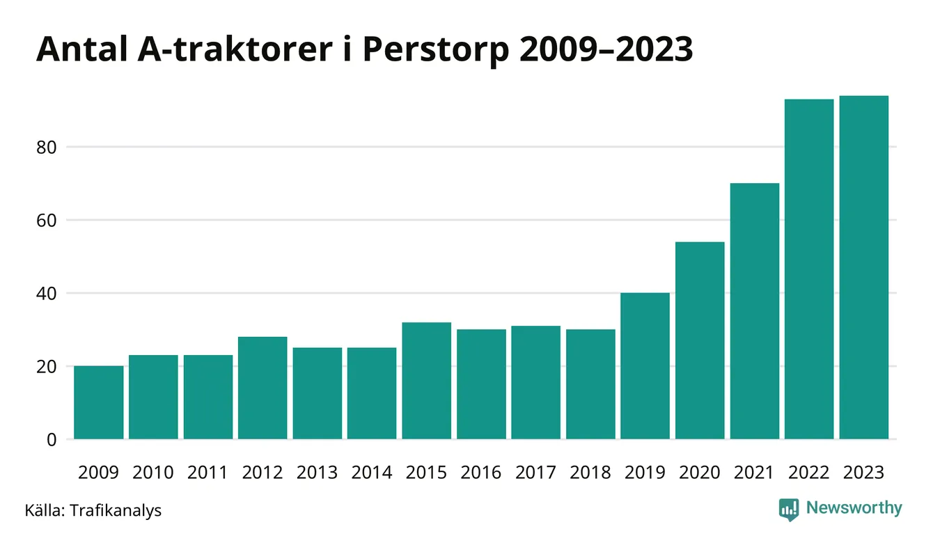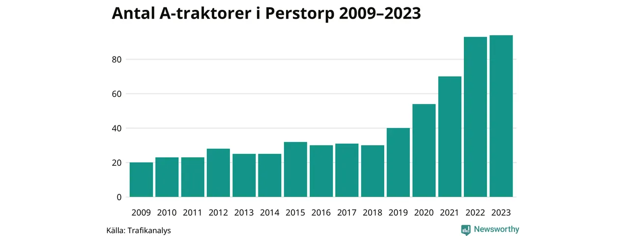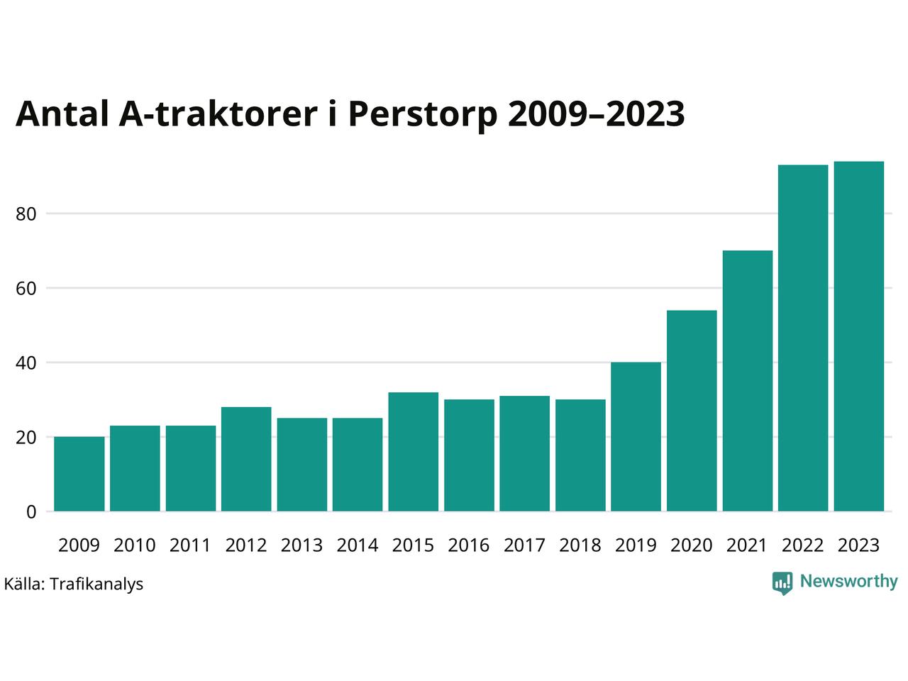 För femte året i rad ökar antalet A-traktorer i Perstorps kommun, visar nya siffror från Trafikanalys. I slutet av 2023 fanns 94 A-traktorer registrerade i kommunen, vilket är en fler än året innan. Inte sedan åtminstone 2009, som är det första året vi har statistik för, har det funnits så många A-traktorer i kommunen.