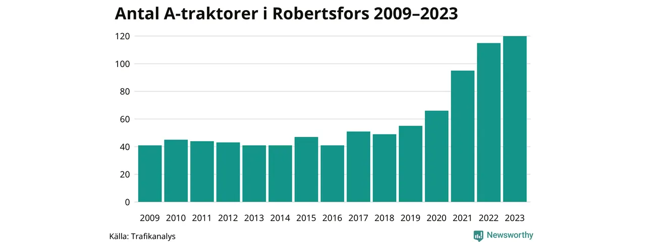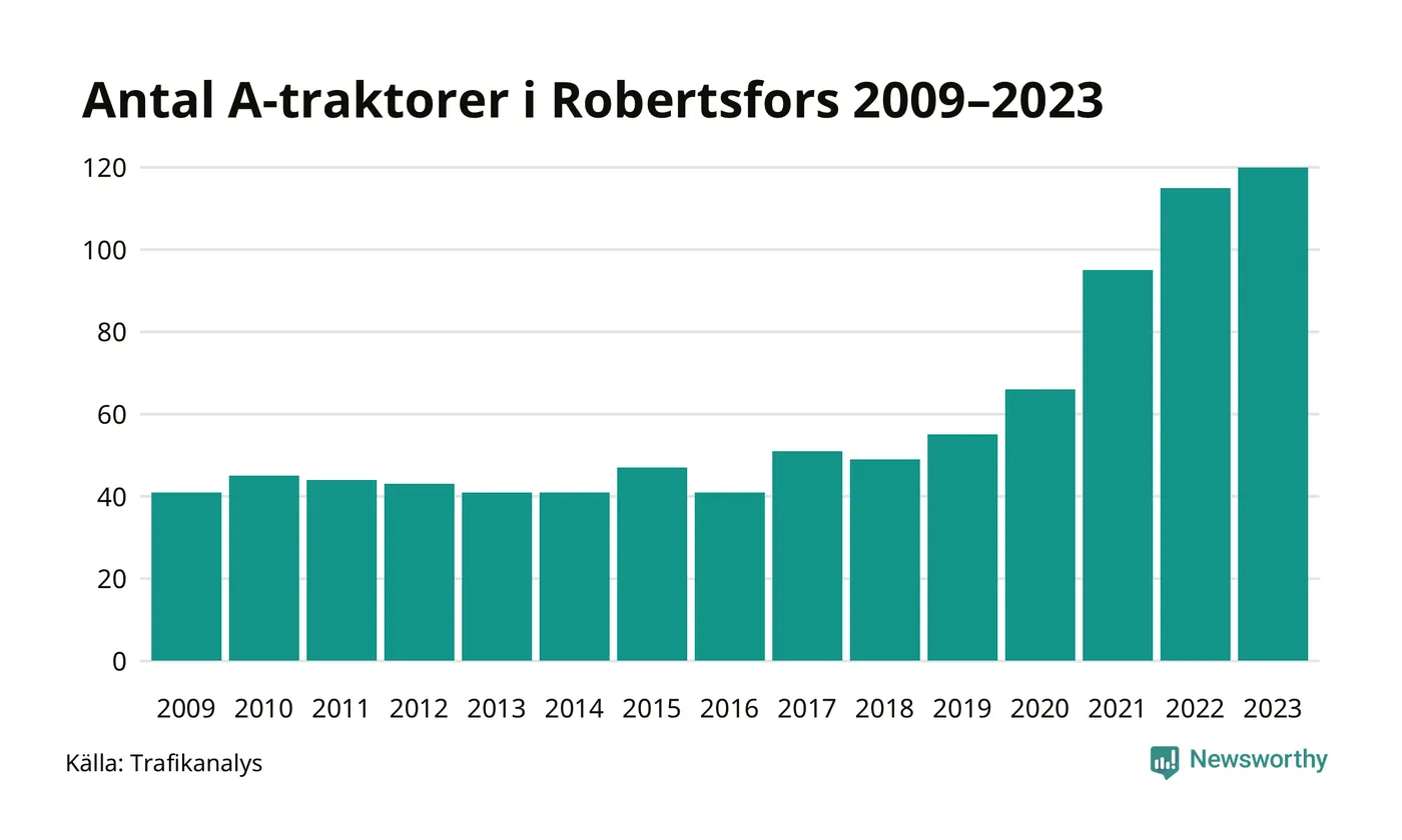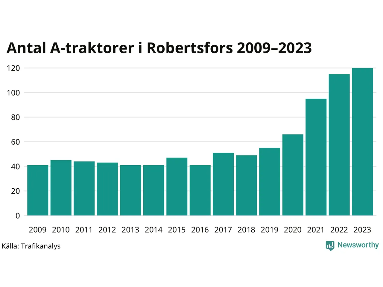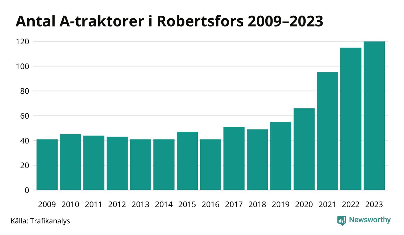För femte året i rad ökar antalet A-traktorer i Robertsfors kommun, visar nya siffror från Trafikanalys. I slutet av 2023 fanns 120 A-traktorer registrerade i kommunen, vilket är fem fler än året innan. Inte sedan åtminstone 2009, som är det första året vi har statistik för, har det funnits så många A-traktorer i kommunen.