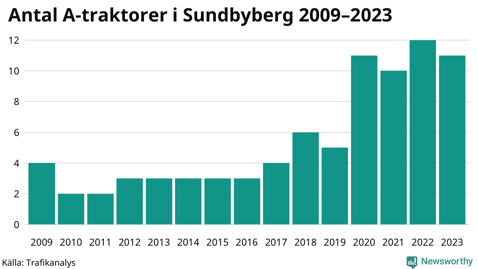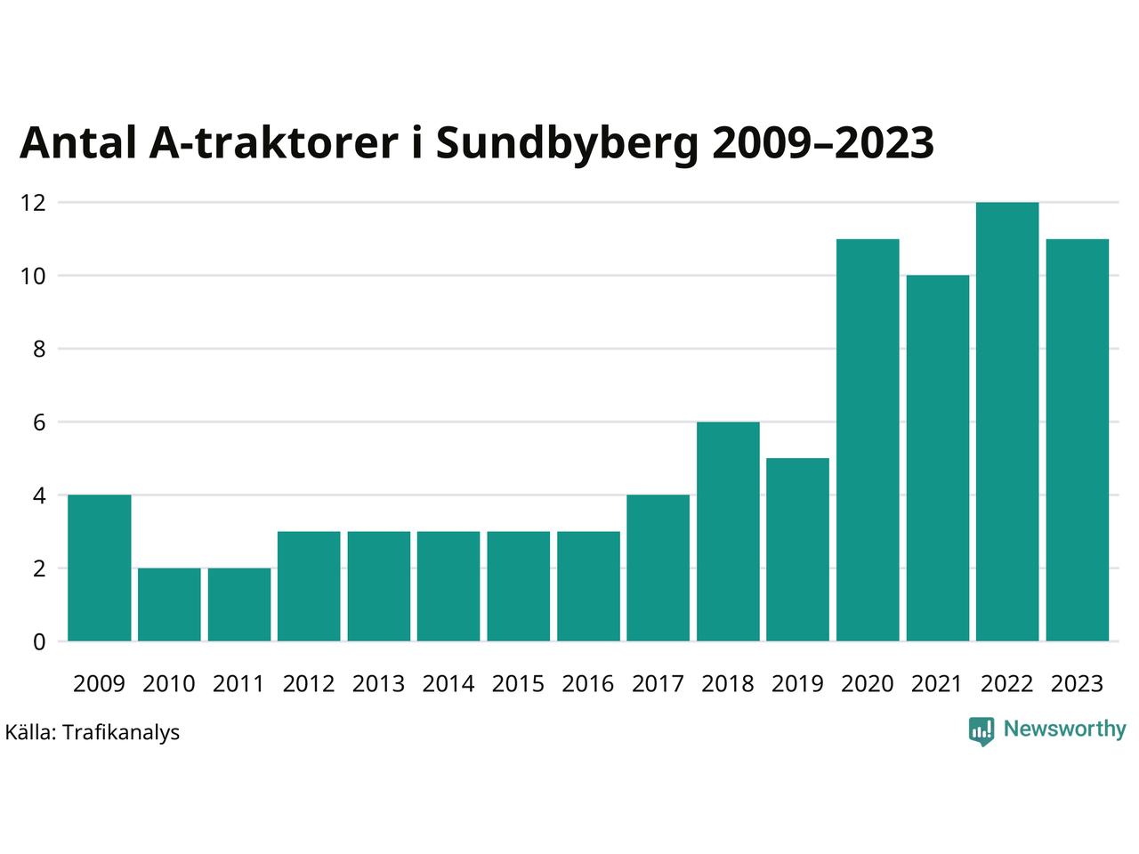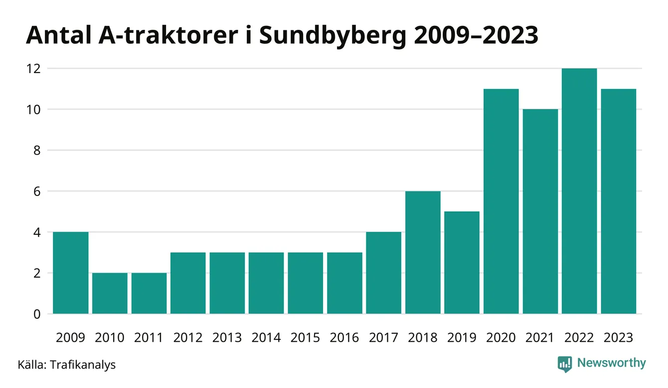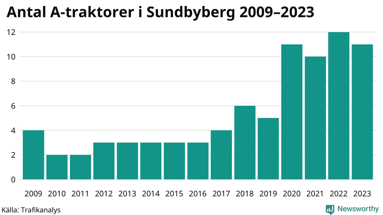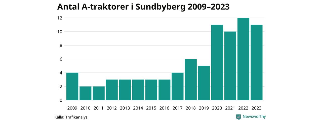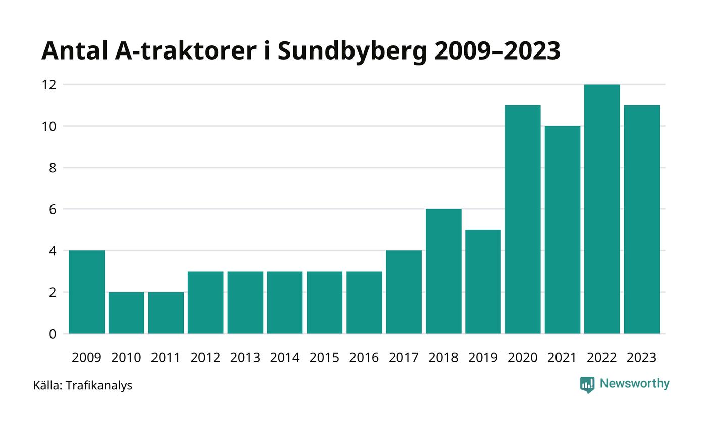 I slutet av 2023 fanns elva A-traktorer registrerade i Sundbybergs kommun, vilket är en färre än året innan. Det visar nya siffror från Trafikanalys.