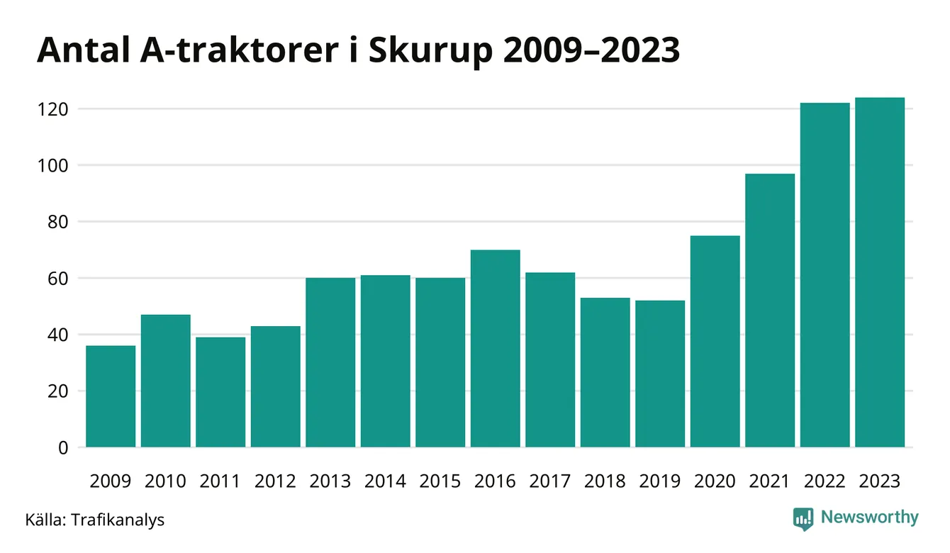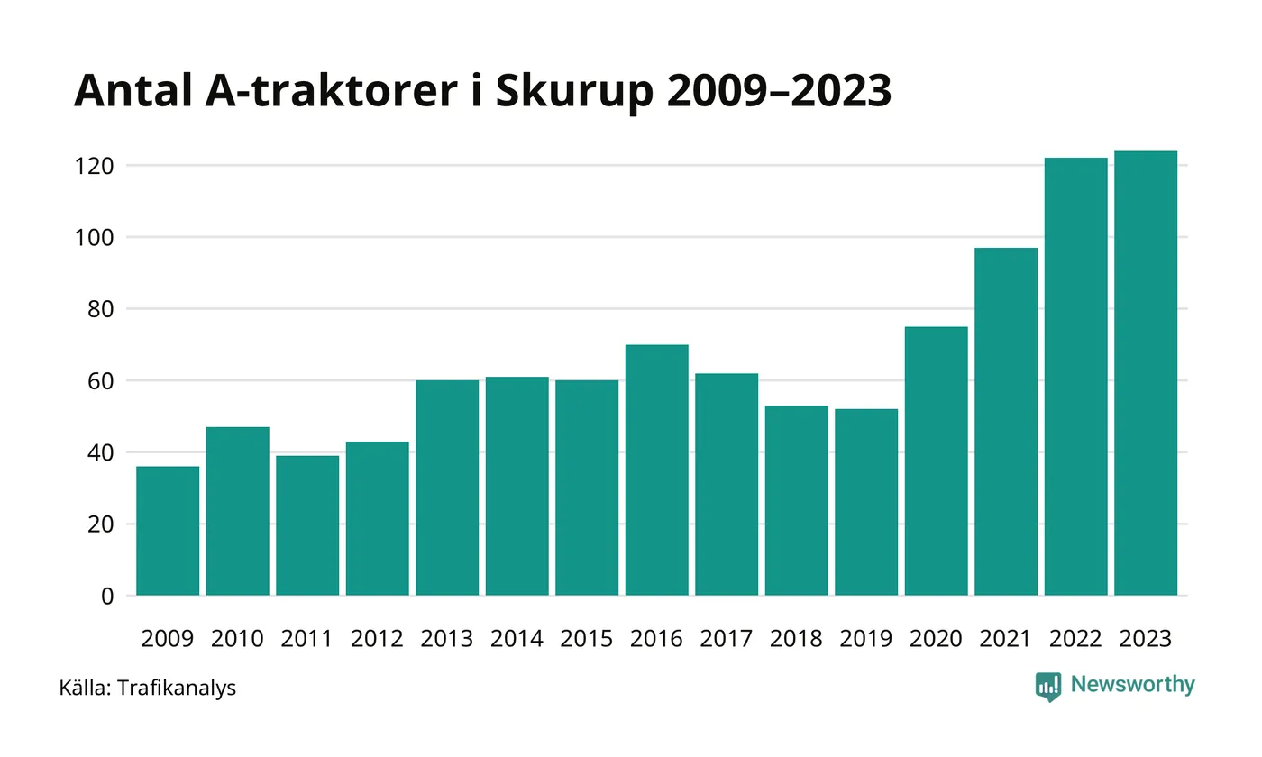 Under det senaste decenniet har antalet A-traktorer mer än fyrdubblats i Sverige – och under 2023 fortsatte utvecklingen. Så många finns i Skurups kommun.