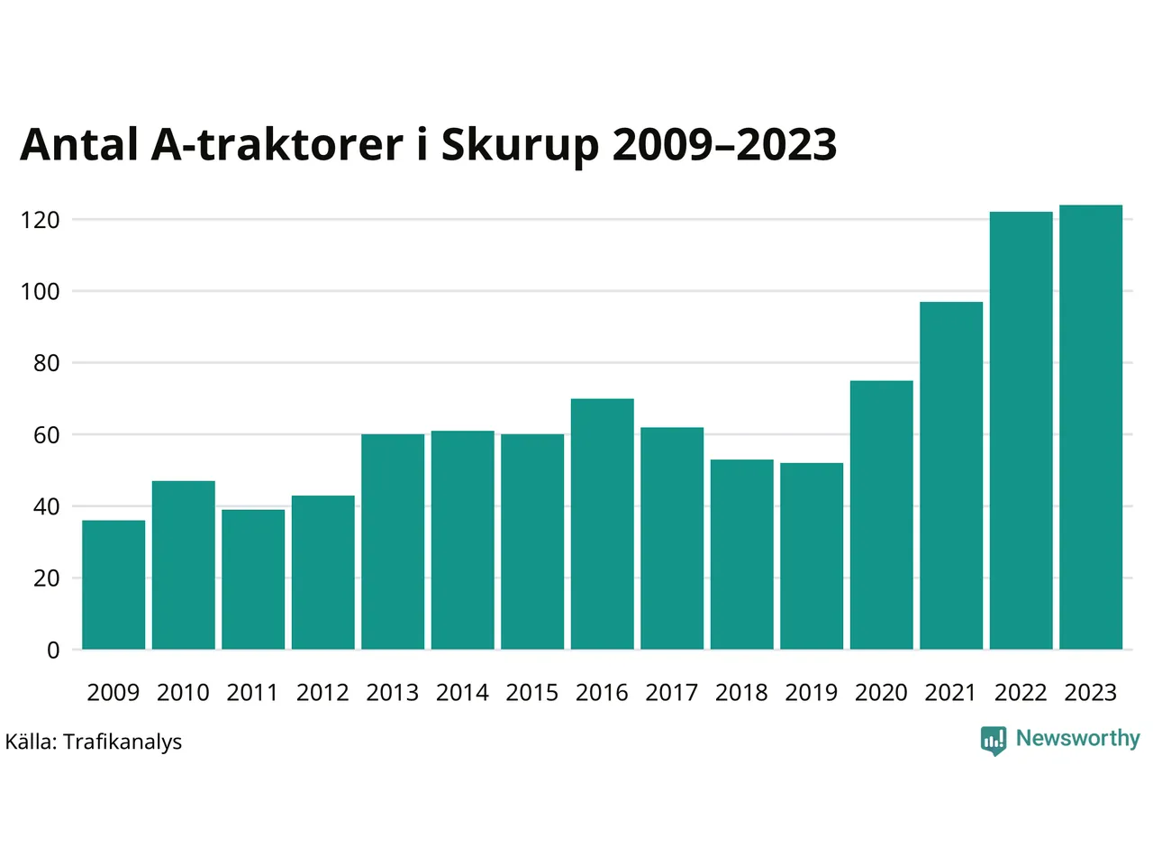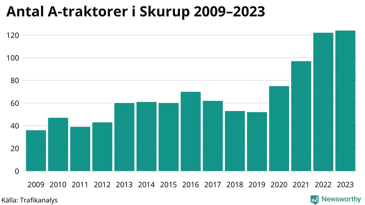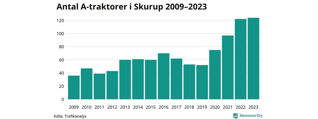 För fjärde året i rad ökar antalet A-traktorer i Skurups kommun, visar nya siffror från Trafikanalys. I slutet av 2023 fanns 124 A-traktorer registrerade i kommunen, vilket är två fler än året innan. Inte sedan åtminstone 2009, som är det första året vi har statistik för, har det funnits så många A-traktorer i kommunen.