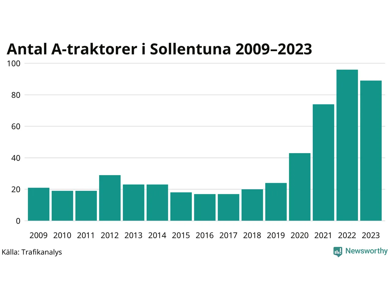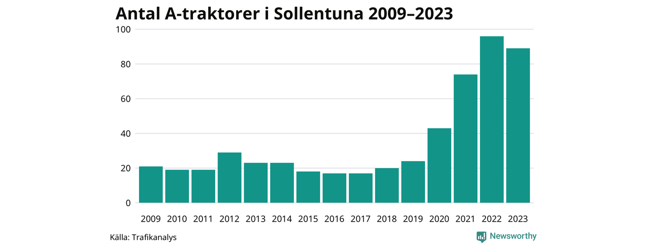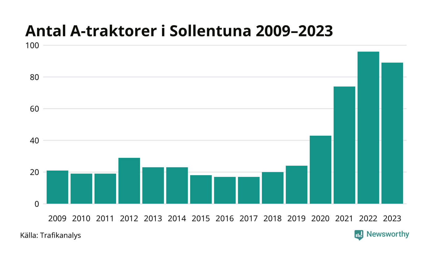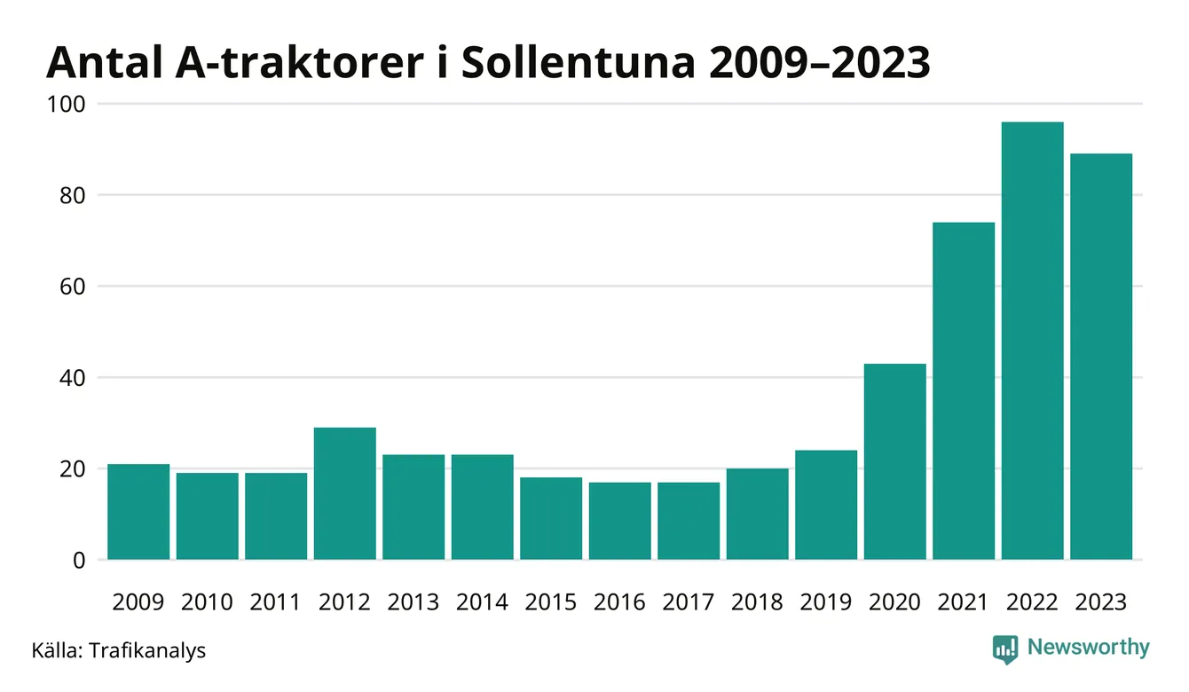 Under det senaste decenniet har antalet A-traktorer mer än fyrdubblats i Sverige, och under 2023 fortsatte utvecklingen. Men i Sollentuna kommun blev A-traktorerna färre. Det är första gången sedan 2018 som antalet inte ökar.