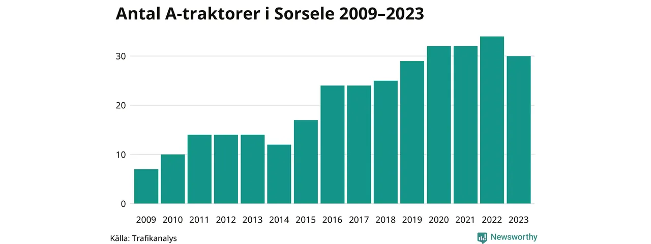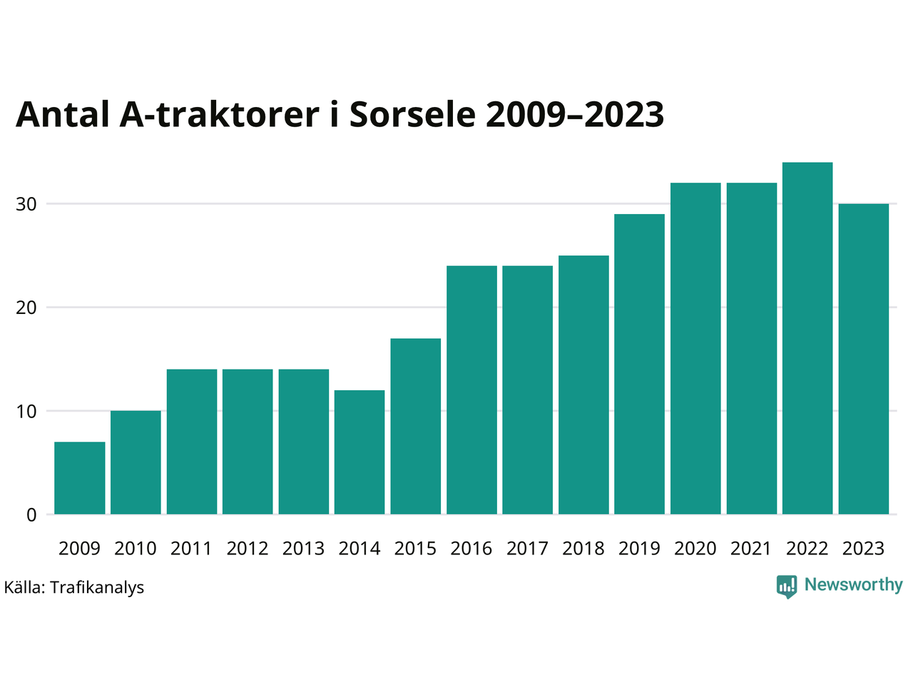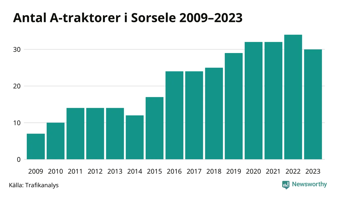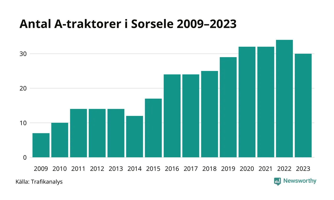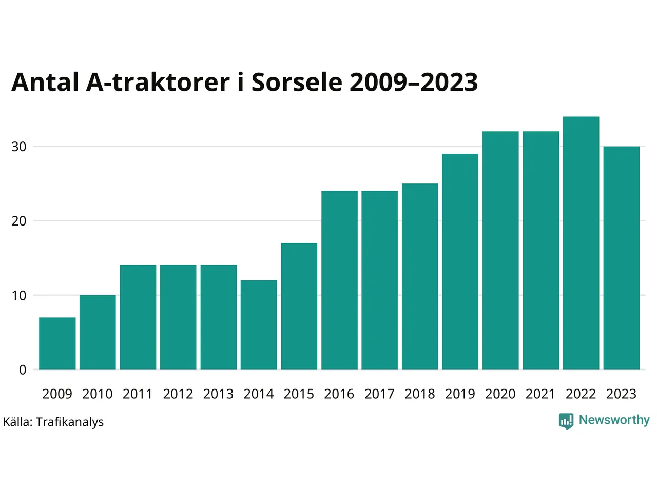 Under det senaste decenniet har antalet A-traktorer mer än fyrdubblats i Sverige – och under 2023 fortsatte utvecklingen. Så många finns i Sorsele kommun.