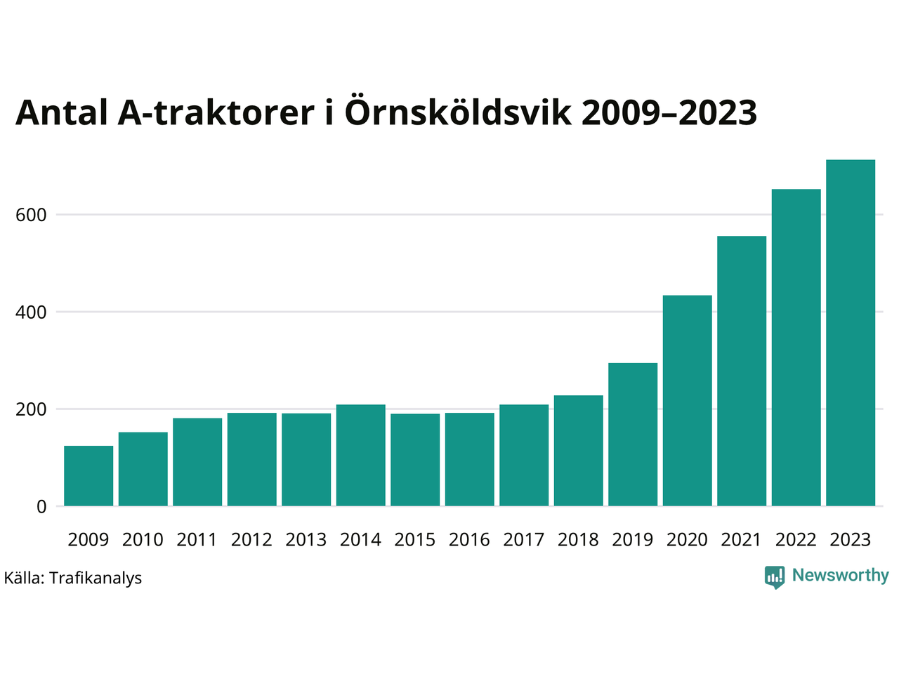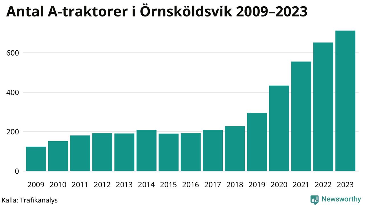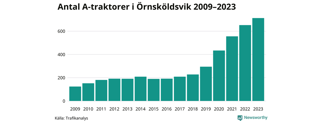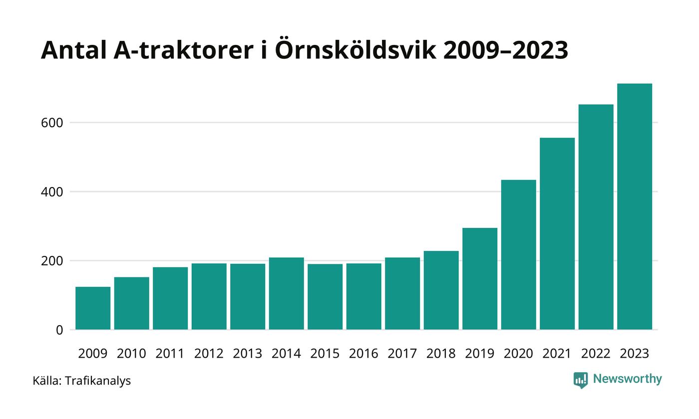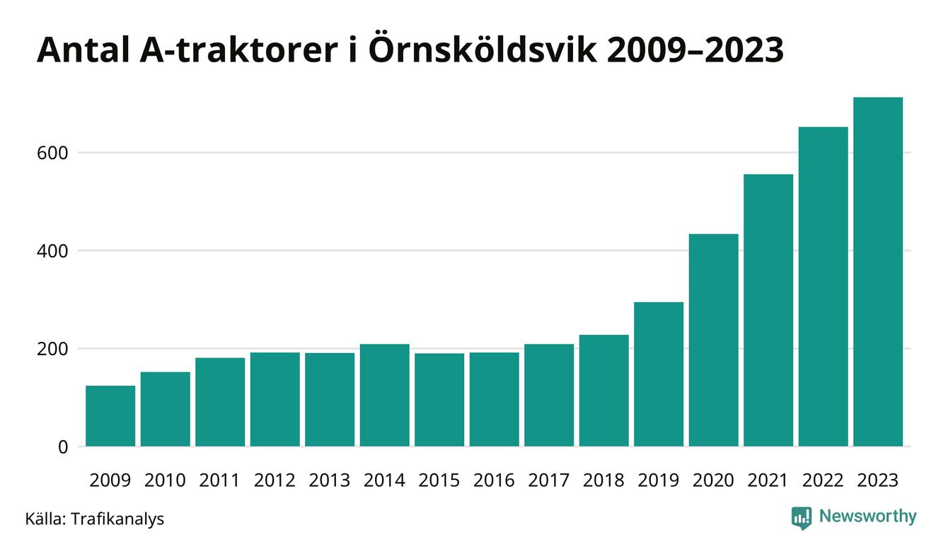 För åttonde året i rad ökar antalet A-traktorer i Örnsköldsviks kommun, visar nya siffror från Trafikanalys. I slutet av 2023 fanns 713 A-traktorer registrerade i kommunen, vilket är 61 fler än året innan – en ökning med 9 procent. Det är den näst största ökningen i Västernorrlands län. Inte sedan åtminstone 2009, som är det första året vi har statistik för, har det funnits så många A-traktorer i kommunen.