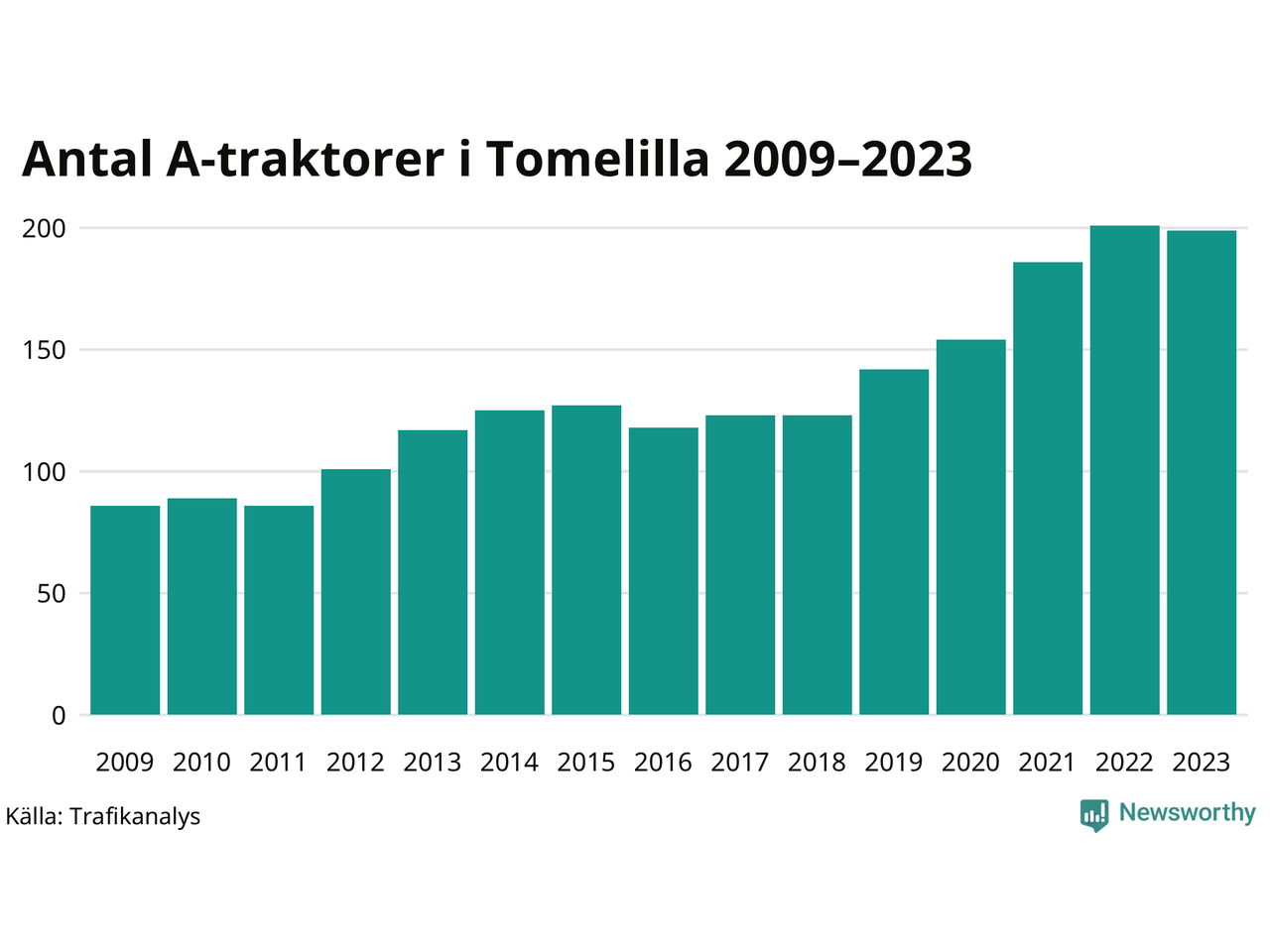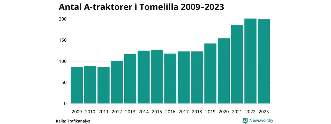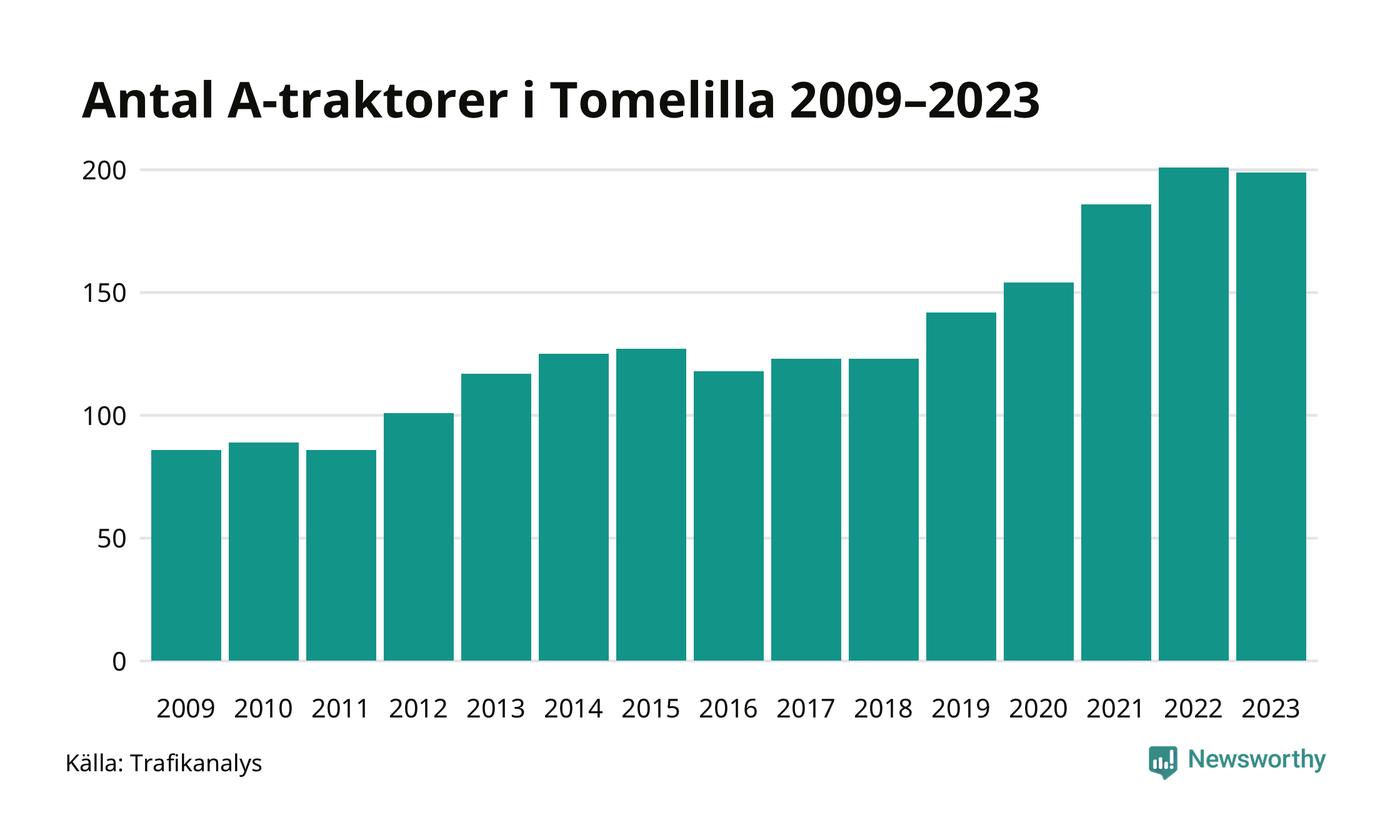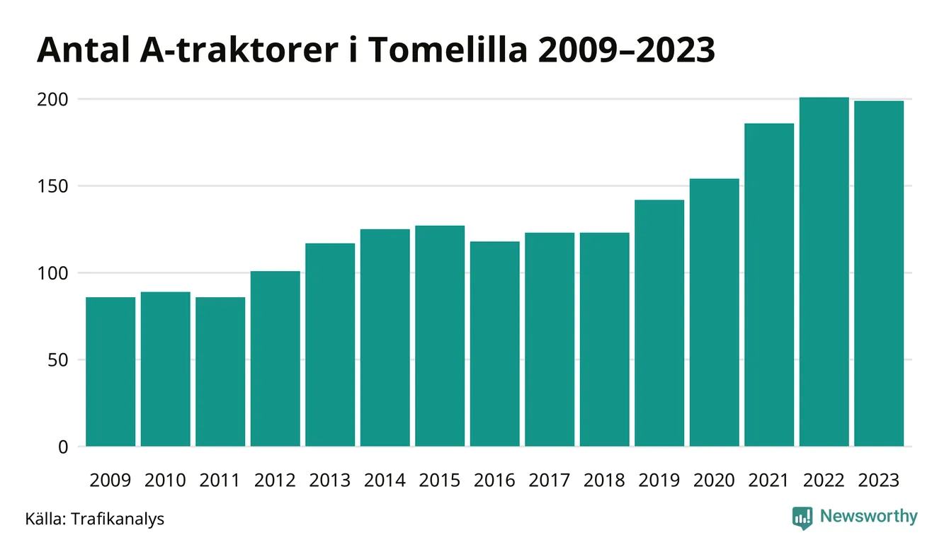 Under det senaste decenniet har antalet A-traktorer mer än fyrdubblats i Sverige, och under 2023 fortsatte utvecklingen. Men i Tomelilla kommun blev A-traktorerna färre. Det är första gången sedan 2019 som antalet inte ökar.