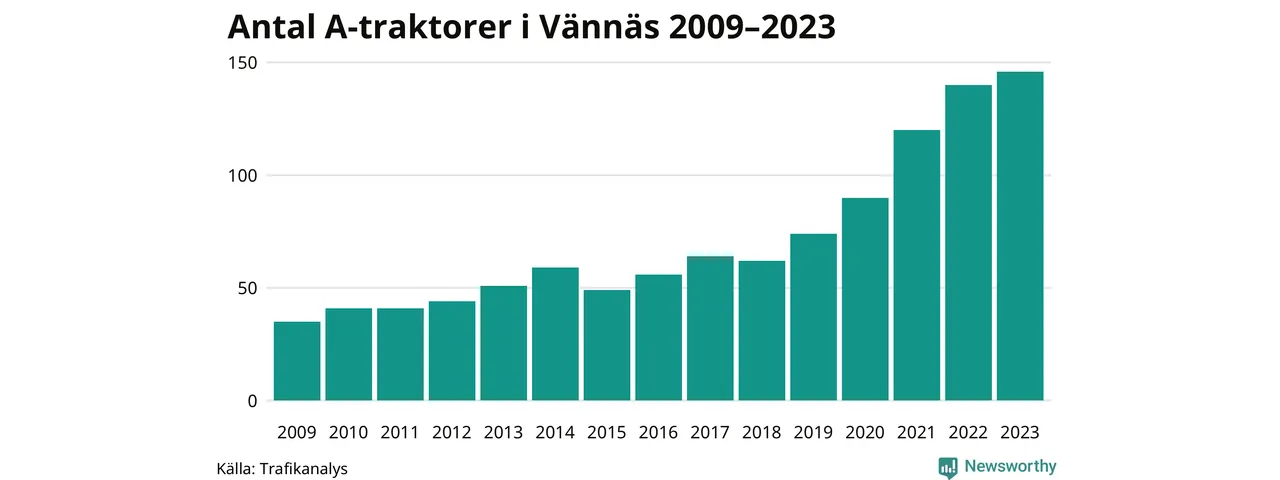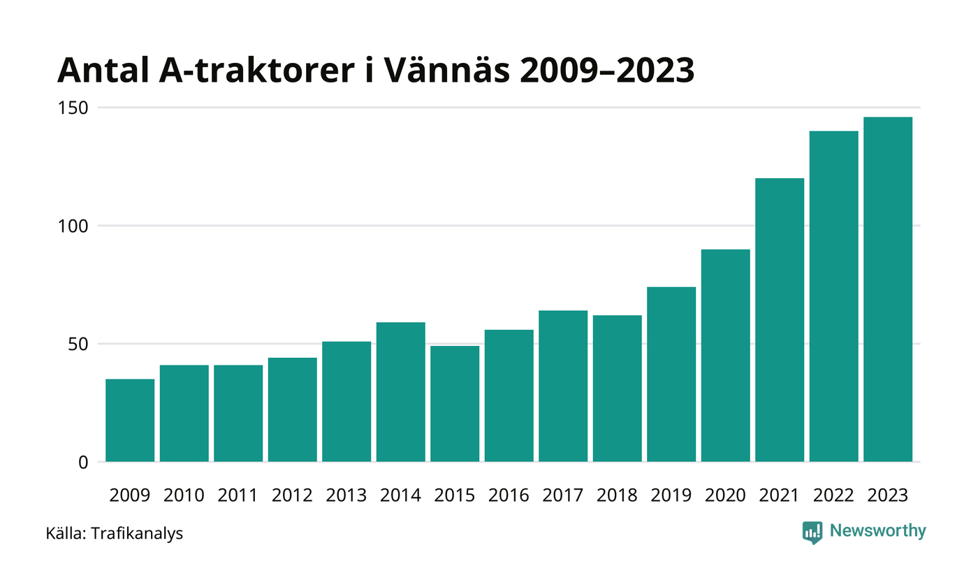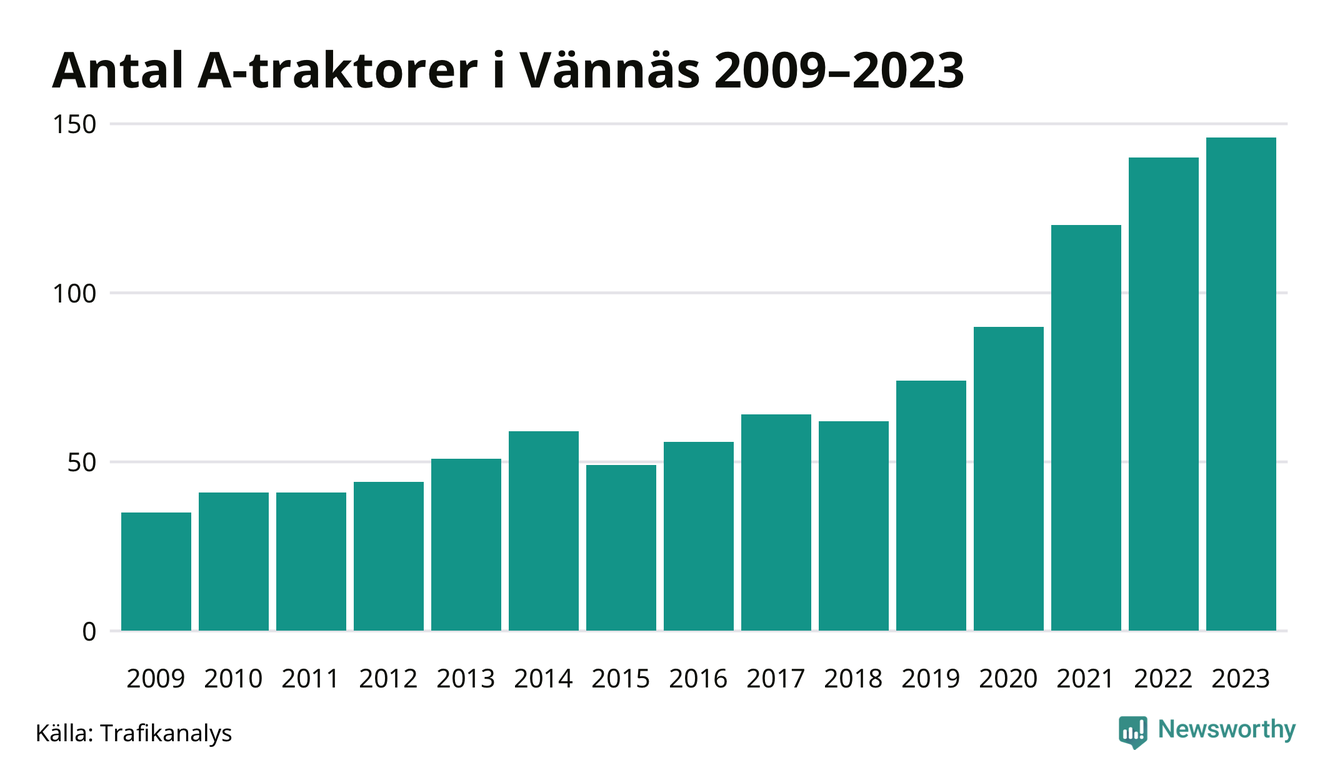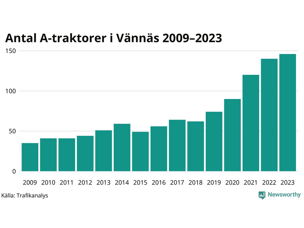 För femte året i rad ökar antalet A-traktorer i Vännäs kommun, visar nya siffror från Trafikanalys. I slutet av 2023 fanns 146 A-traktorer registrerade i kommunen, vilket är sex fler än året innan – en ökning med 4 procent. Inte sedan åtminstone 2009, som är det första året vi har statistik för, har det funnits så många A-traktorer i kommunen.