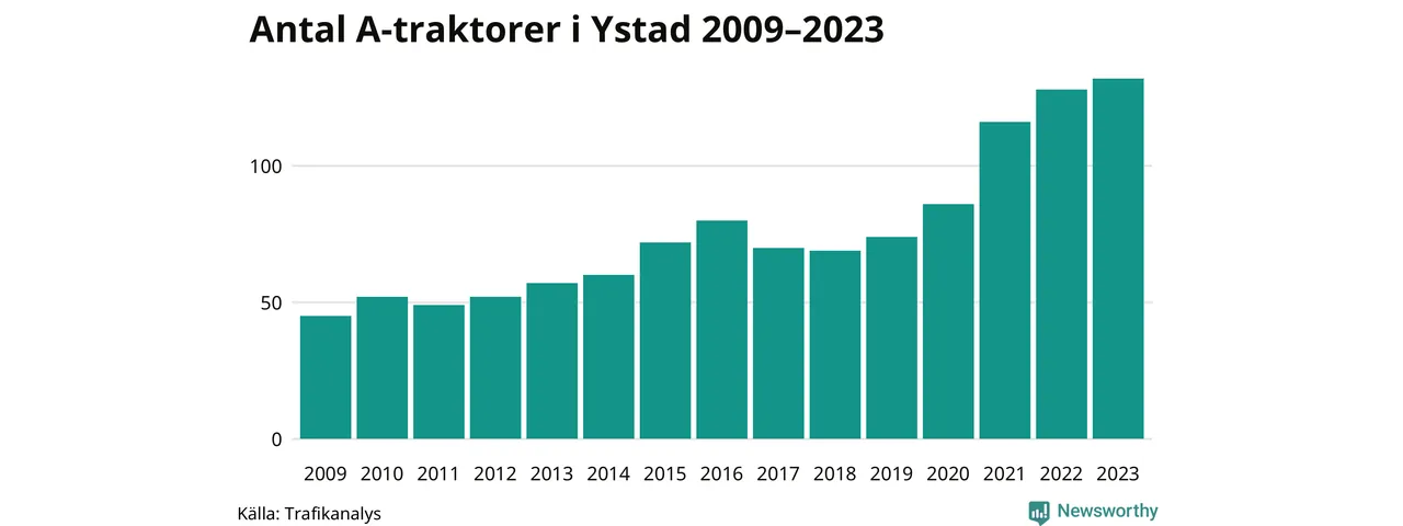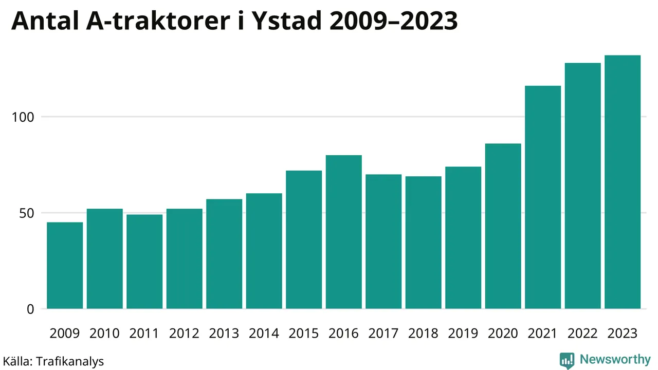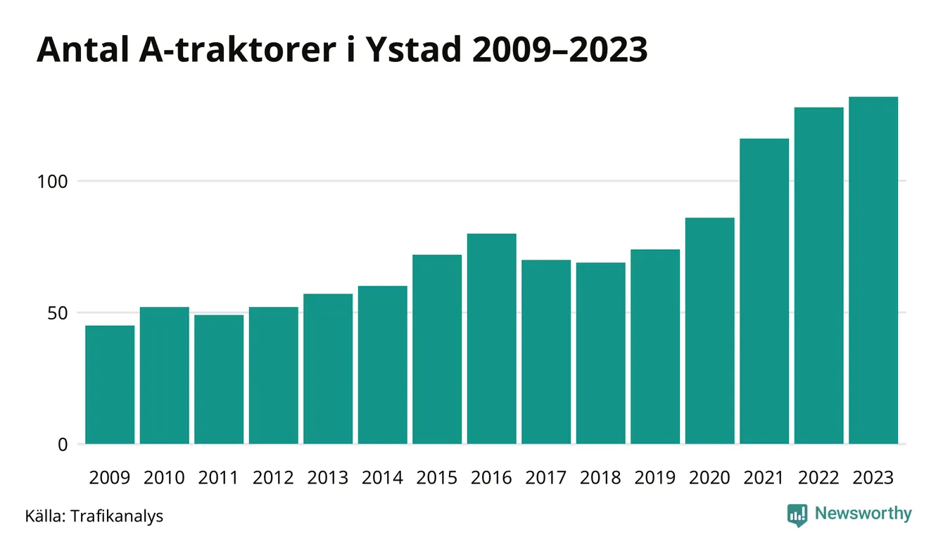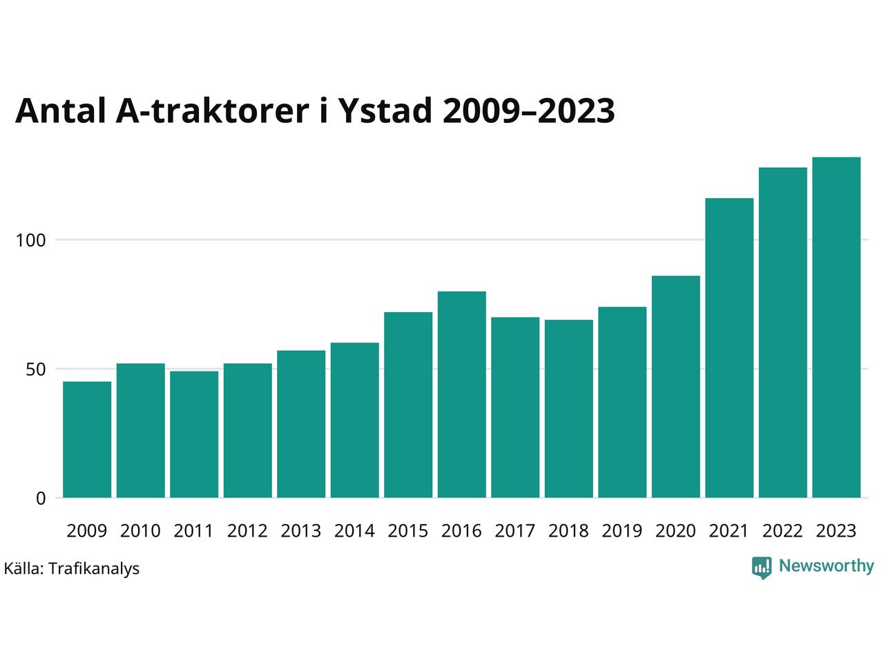 För femte året i rad ökar antalet A-traktorer i Ystads kommun, visar nya siffror från Trafikanalys. I slutet av 2023 fanns 132 A-traktorer registrerade i kommunen, vilket är fyra fler än året innan. Inte sedan åtminstone 2009, som är det första året vi har statistik för, har det funnits så många A-traktorer i kommunen.