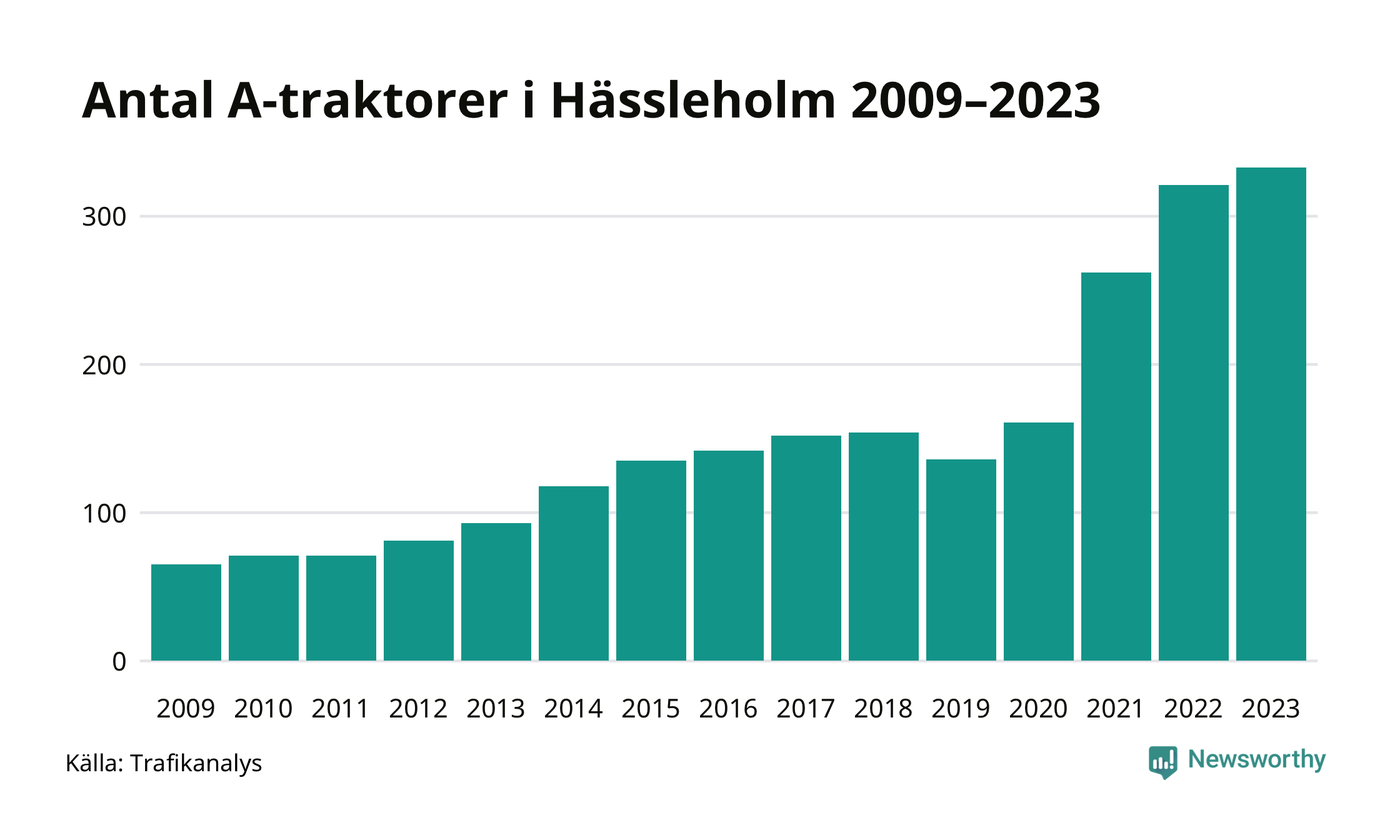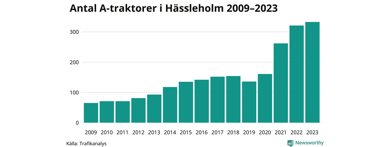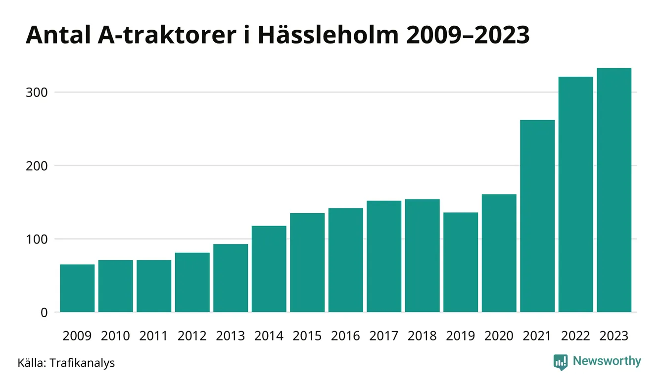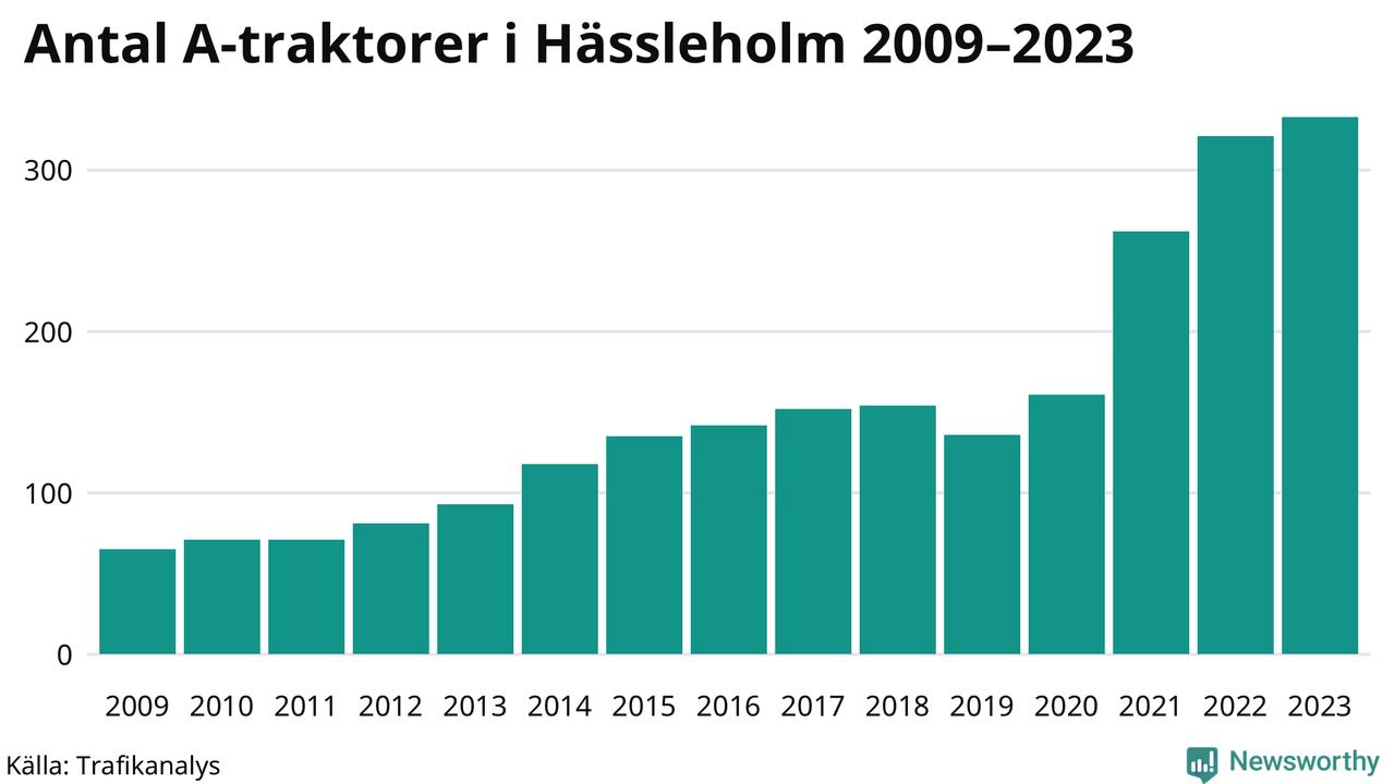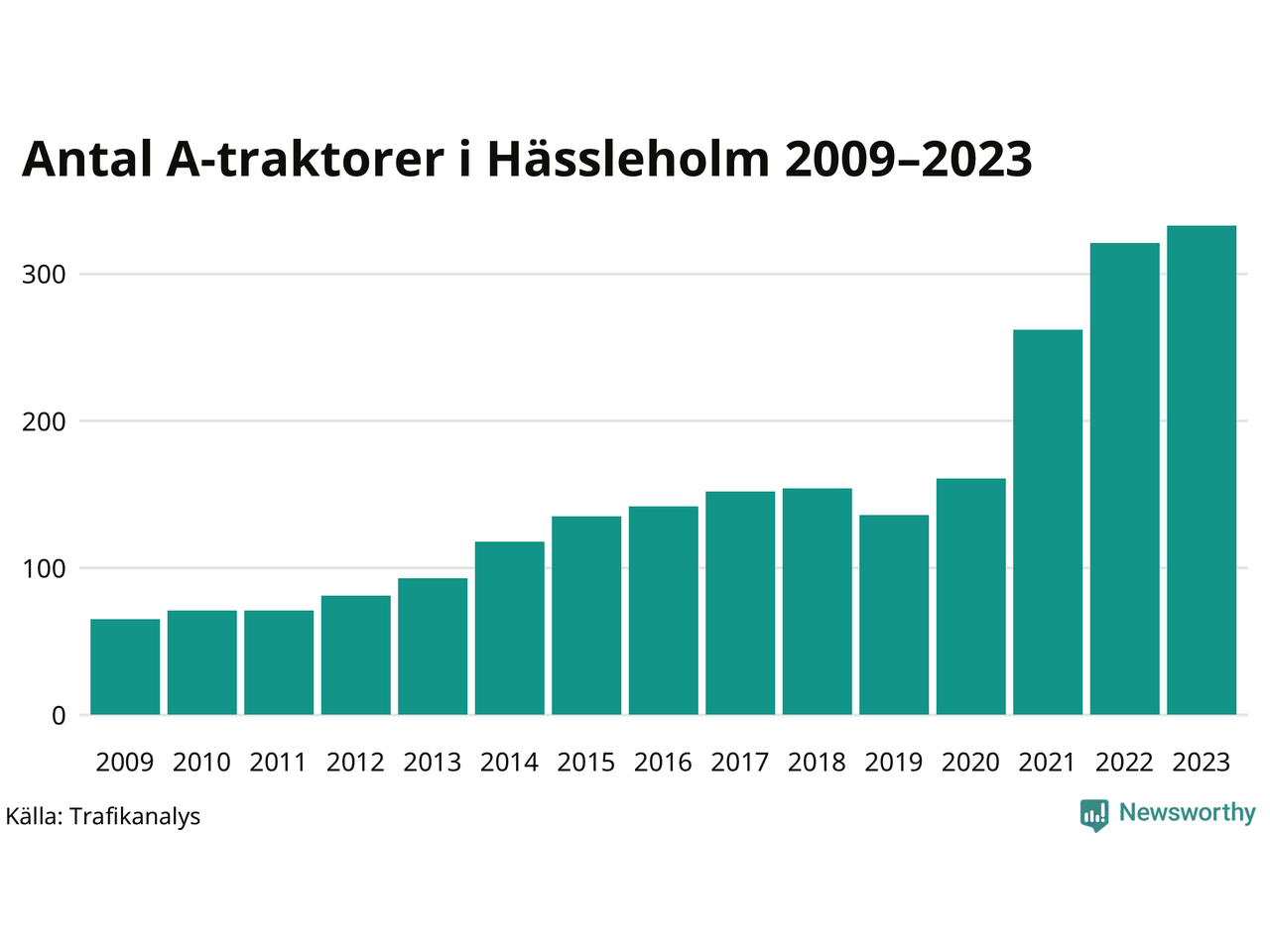 För fjärde året i rad ökar antalet A-traktorer i Hässleholms kommun, visar nya siffror från Trafikanalys. I slutet av 2023 fanns 333 A-traktorer registrerade i kommunen, vilket är tolv fler än året innan – en ökning med 4 procent. Inte sedan åtminstone 2009, som är det första året vi har statistik för, har det funnits så många A-traktorer i kommunen.