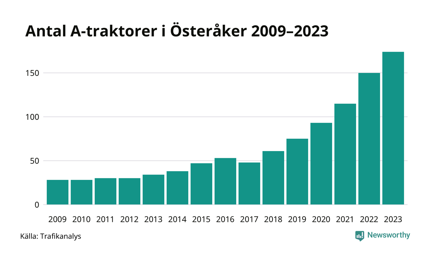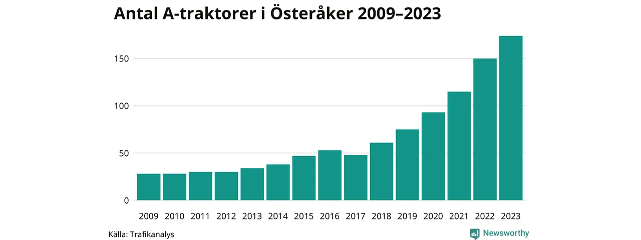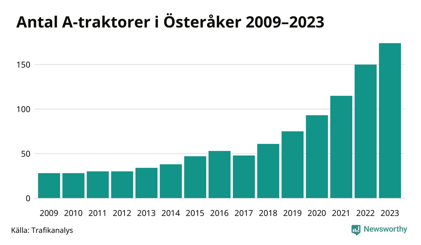 För sjätte året i rad ökar antalet A-traktorer i Österåkers kommun, visar nya siffror från Trafikanalys. I slutet av 2023 fanns 174 A-traktorer registrerade i kommunen, vilket är 24 fler än året innan – en ökning med 16 procent. Inte sedan åtminstone 2009, som är det första året vi har statistik för, har det funnits så många A-traktorer i kommunen.