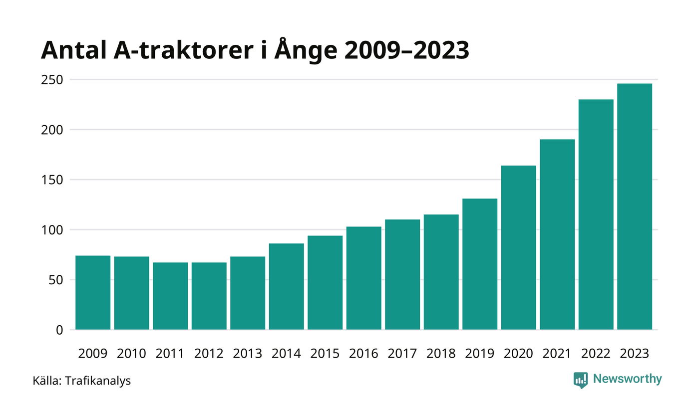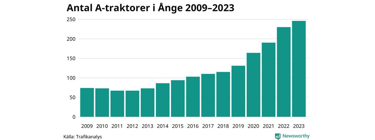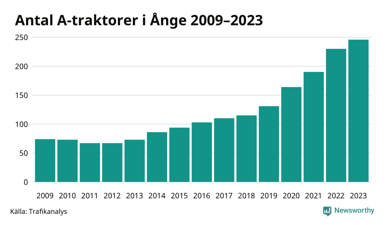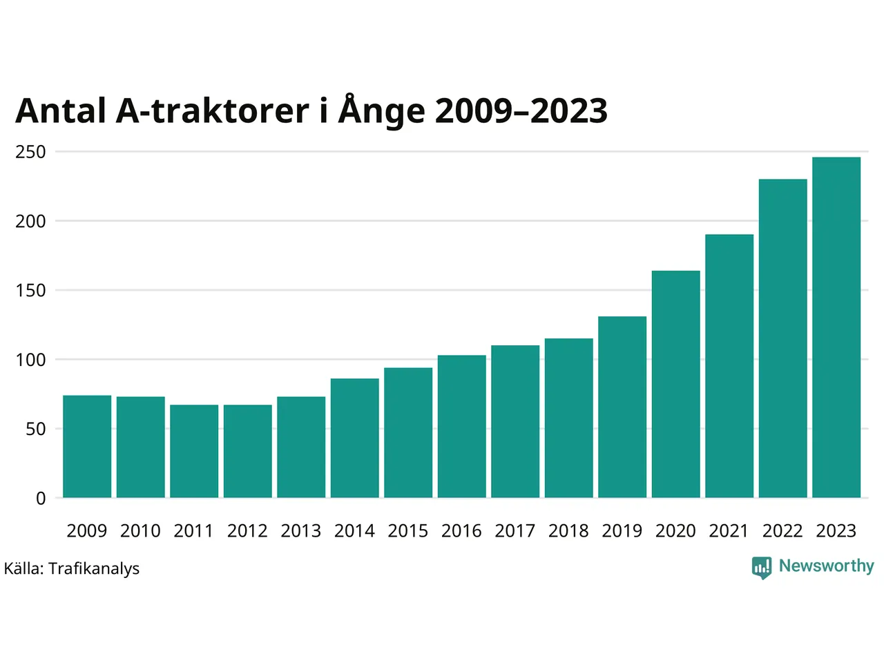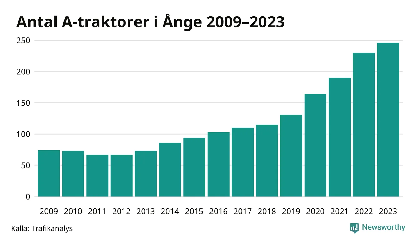 För elfte året i rad ökar antalet A-traktorer i Ånge kommun, visar nya siffror från Trafikanalys. I slutet av 2023 fanns 246 A-traktorer registrerade i kommunen, vilket är 16 fler än året innan – en ökning med 7 procent. Inte sedan åtminstone 2009, som är det första året vi har statistik för, har det funnits så många A-traktorer i kommunen.