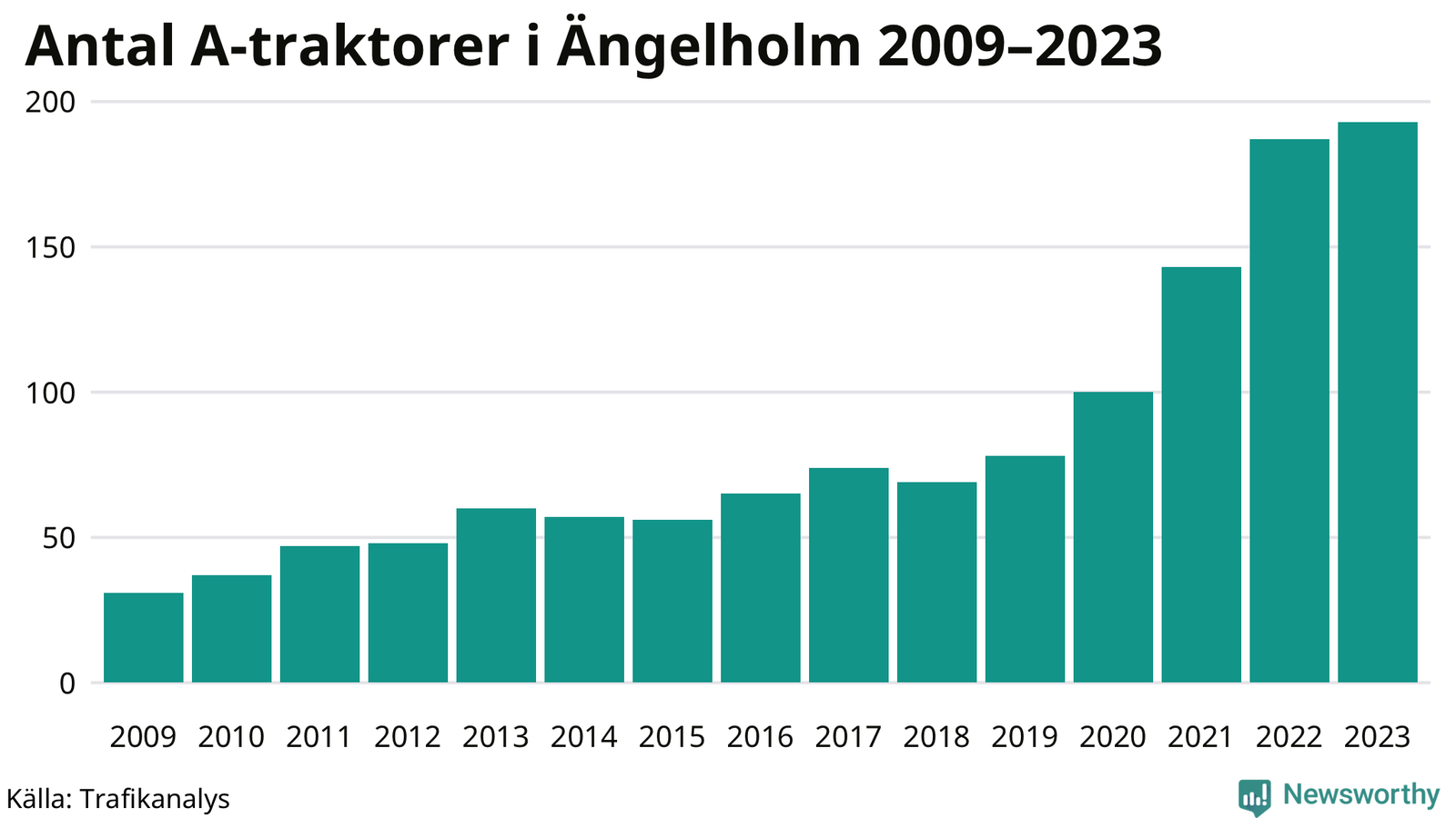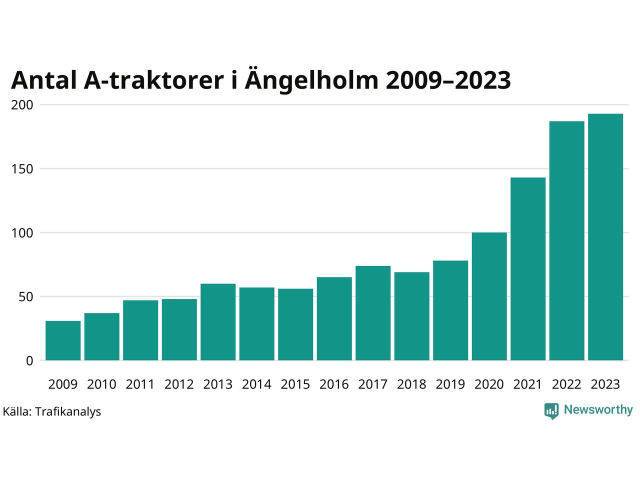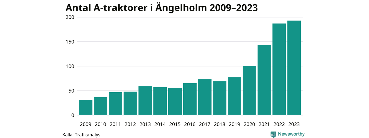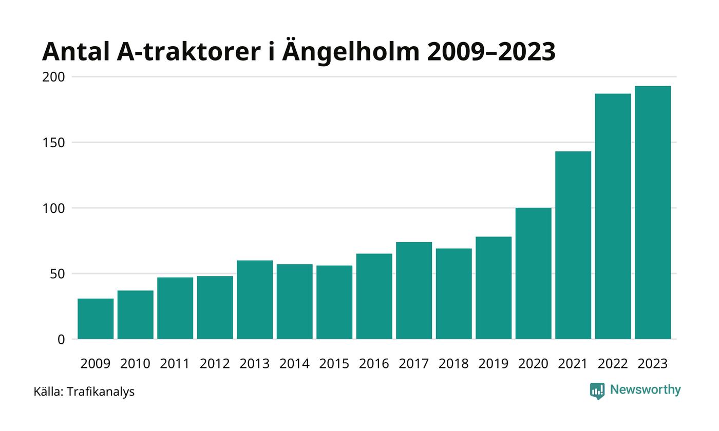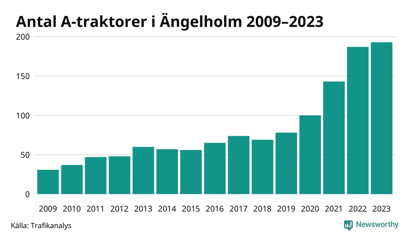 För femte året i rad ökar antalet A-traktorer i Ängelholms kommun, visar nya siffror från Trafikanalys. I slutet av 2023 fanns 193 A-traktorer registrerade i kommunen, vilket är sex fler än året innan – en ökning med 3 procent. Inte sedan åtminstone 2009, som är det första året vi har statistik för, har det funnits så många A-traktorer i kommunen.