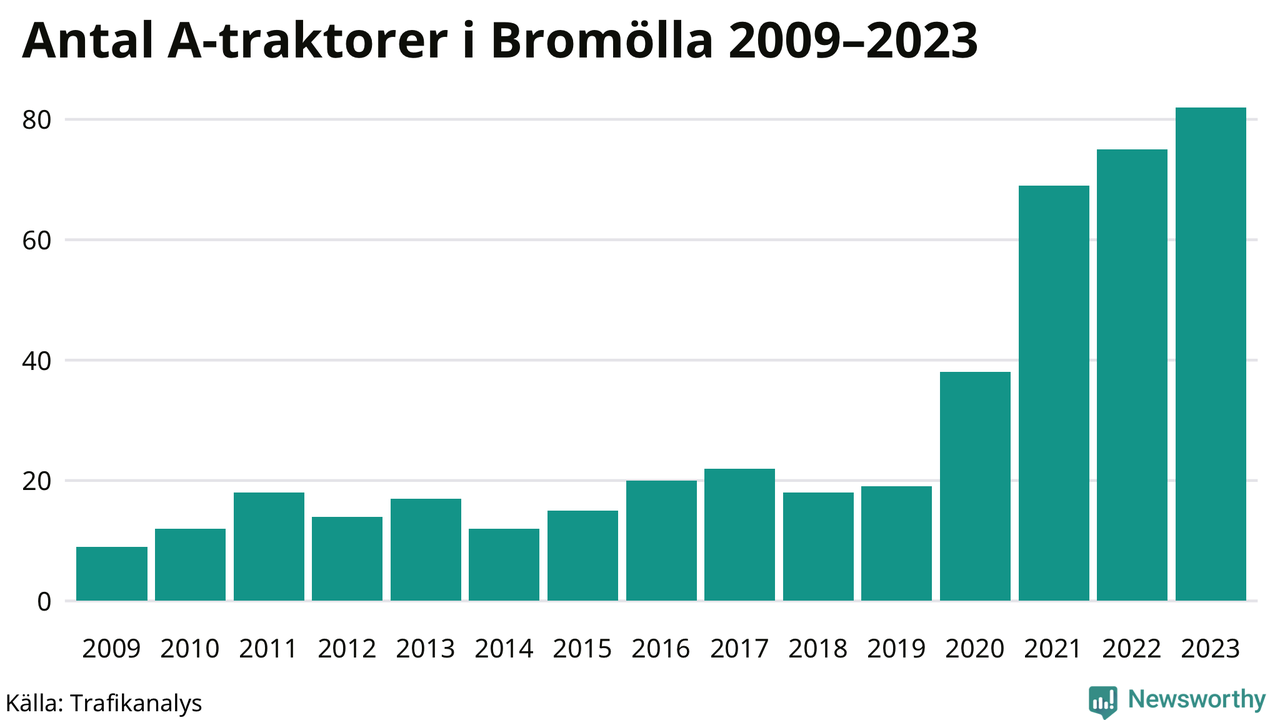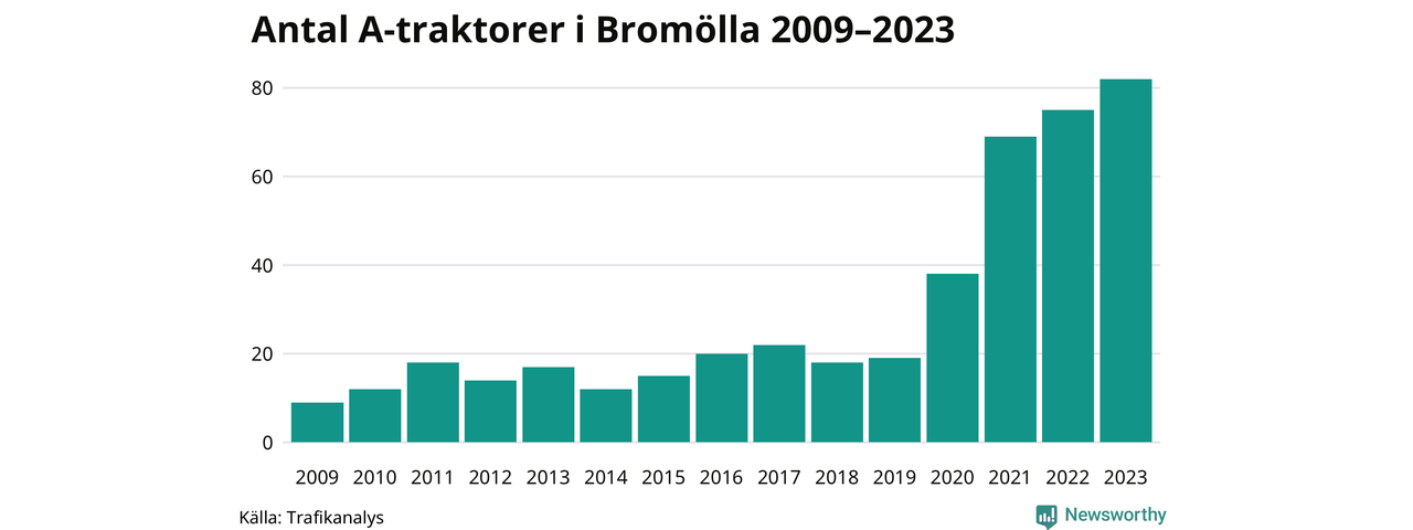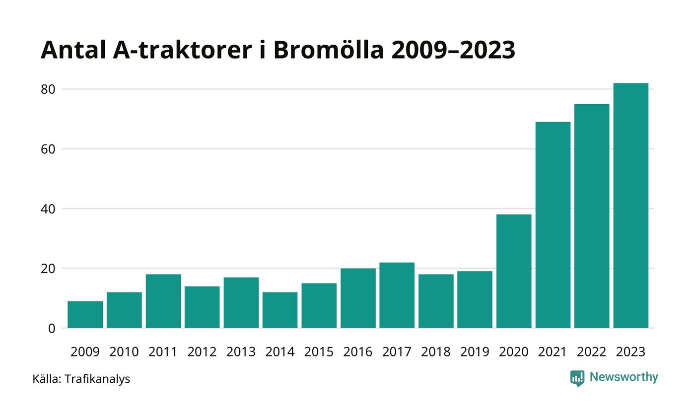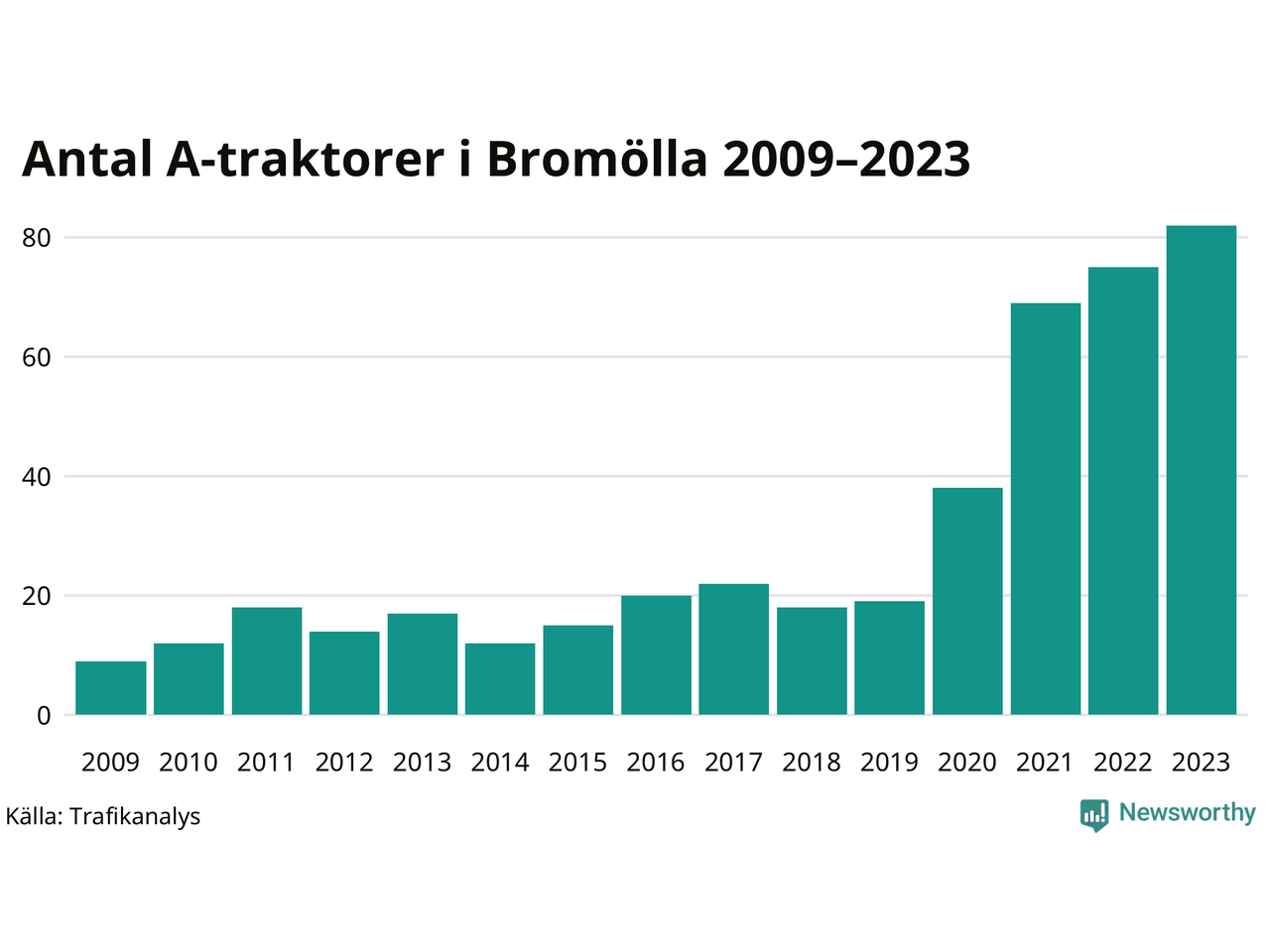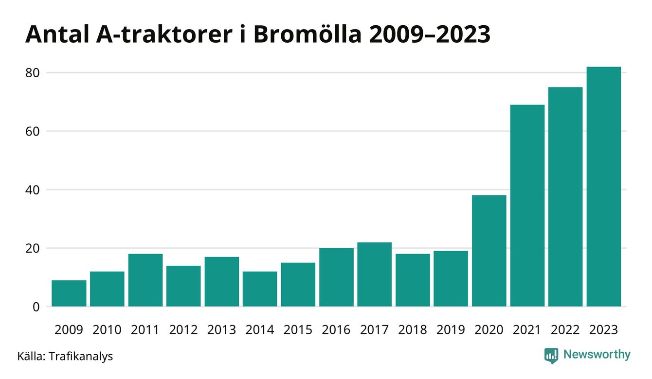 Skåne län följer samma mönster. Jämfört med 2009 har antalet nästan fyrdubblats – från drygt 1 200 till drygt 4 400 i slutet av 2023. Även i Bromölla har A-traktorerna blivit betydligt fler – antalet har niodubblats sedan 2009. Det är den största, procentuella, ökningen i Skåne län.