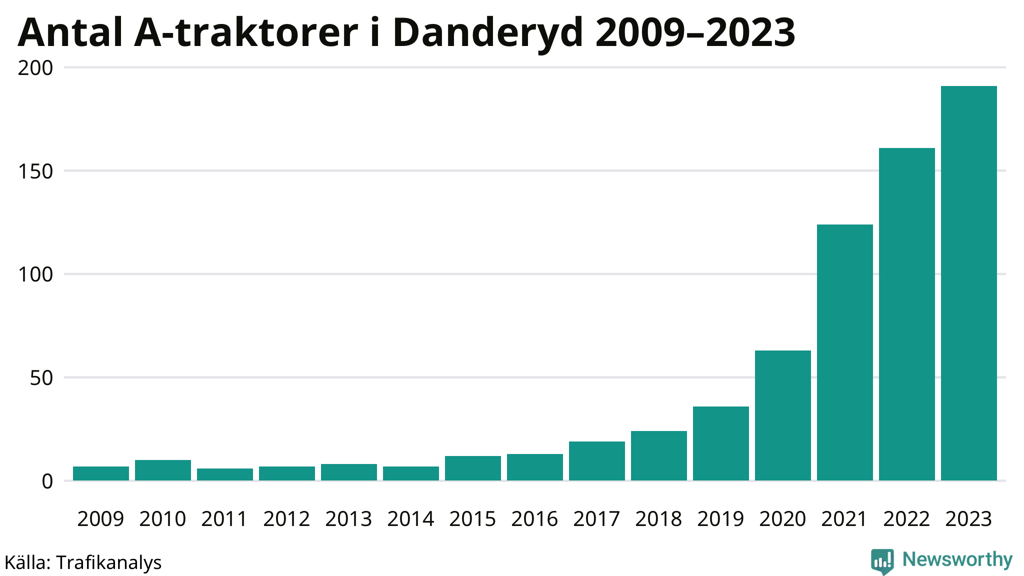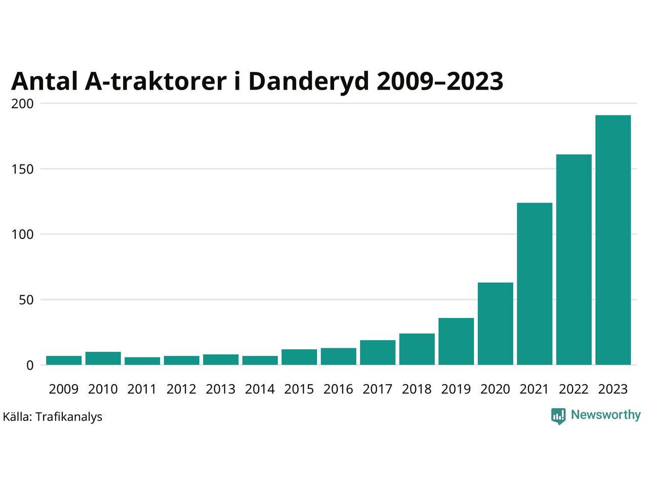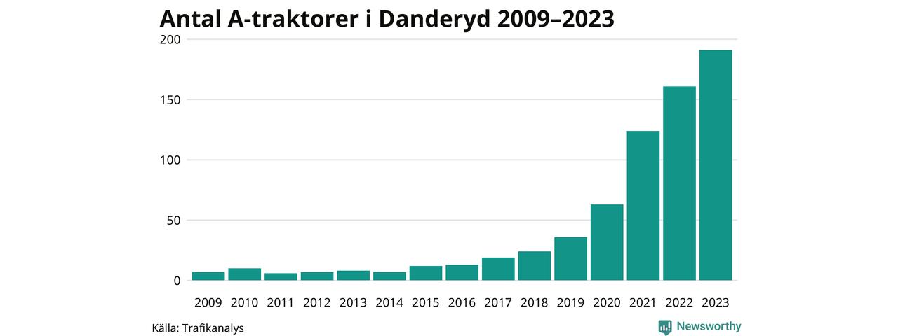 För nionde året i rad ökar antalet A-traktorer i Danderyds kommun, visar nya siffror från Trafikanalys. I slutet av 2023 fanns 191 A-traktorer registrerade i kommunen, vilket är 30 fler än året innan – en ökning med 19 procent. Inte sedan åtminstone 2009, som är det första året vi har statistik för, har det funnits så många A-traktorer i kommunen.