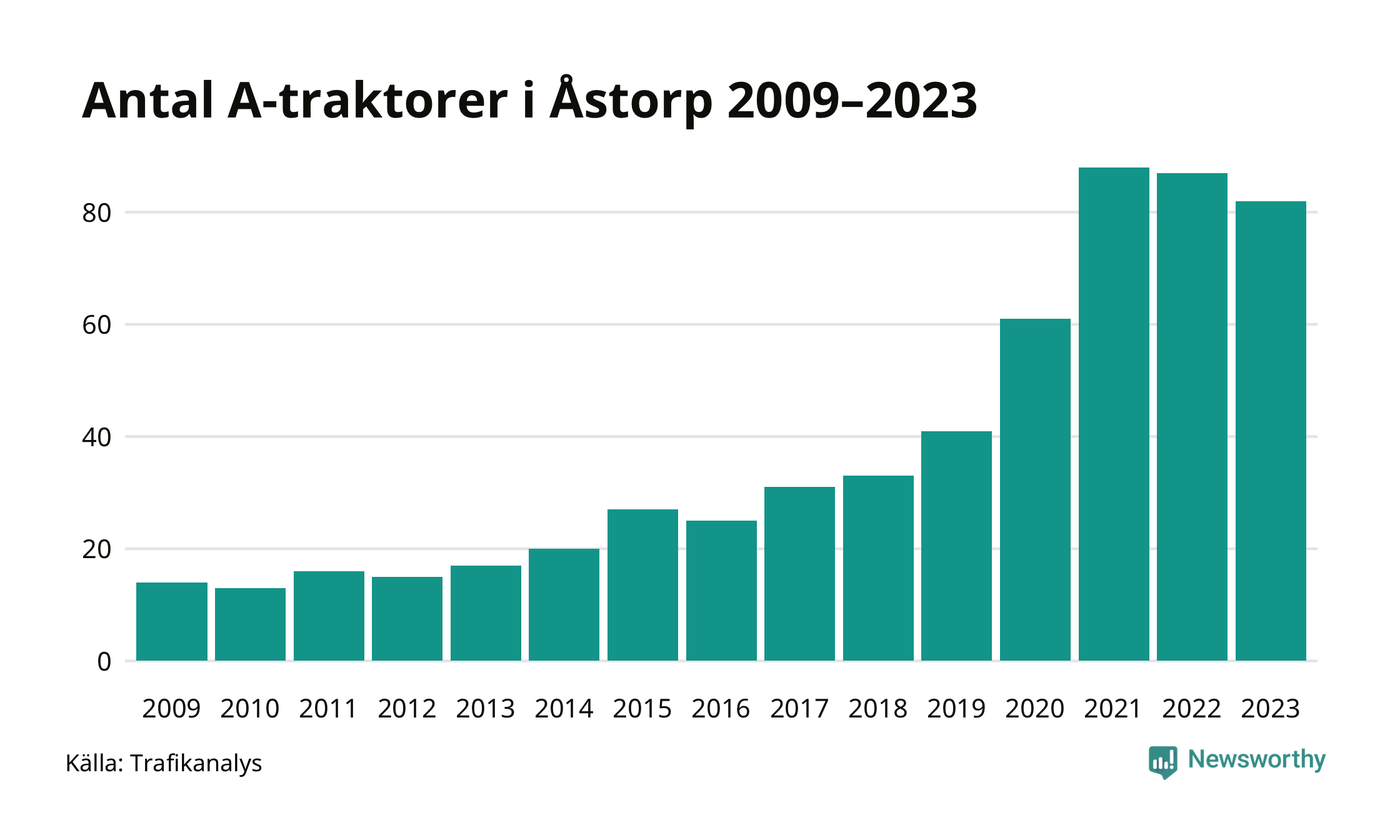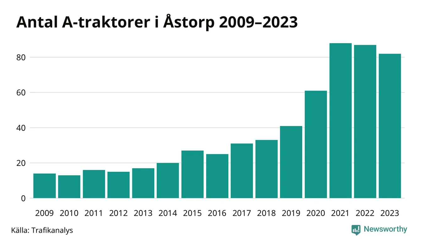 Under det senaste decenniet har antalet A-traktorer mer än fyrdubblats i Sverige – och under 2023 fortsatte utvecklingen. Men i Åstorps kommun blev de färre under förra året.