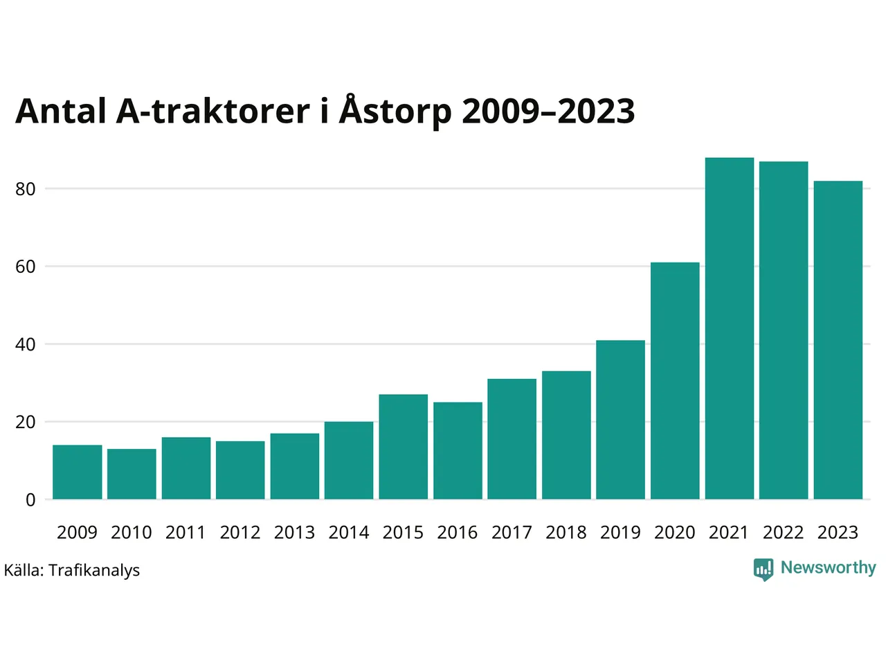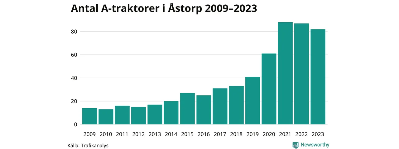 För andra året i rad minskar antalet A-traktorer i Åstorps kommun, visar nya siffror från Trafikanalys. I slutet av 2023 fanns 82 A-traktorer registrerade i Åstorps kommun, vilket är fem färre än året innan. Det visar nya siffror från Trafikanalys.