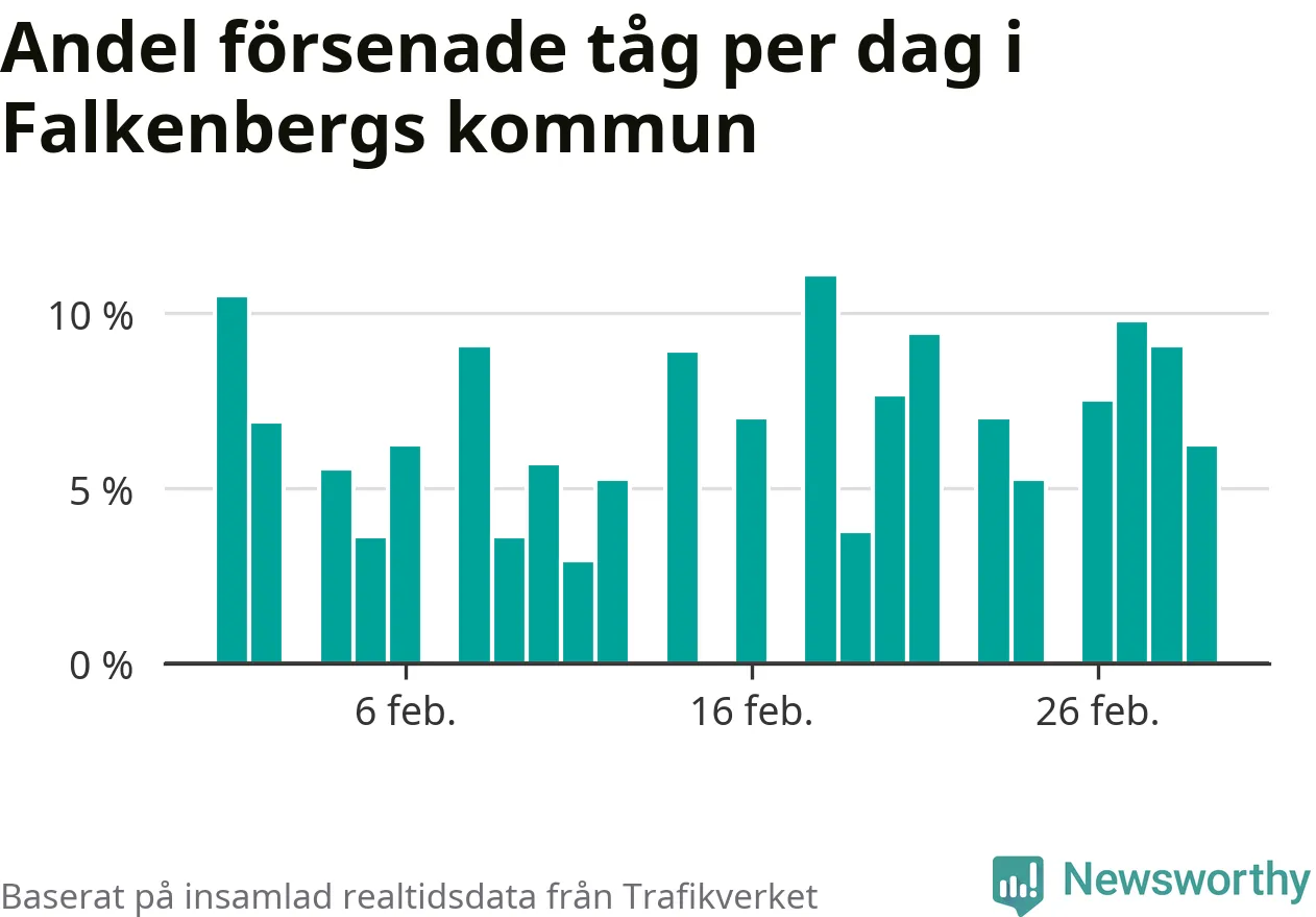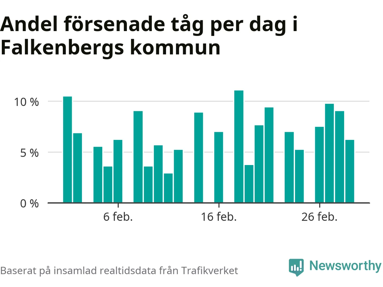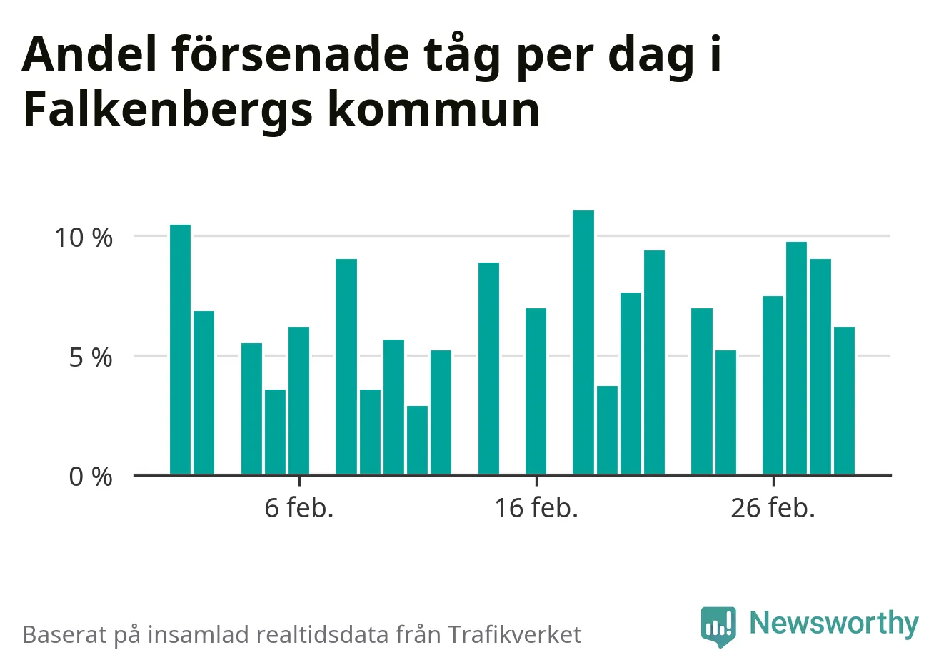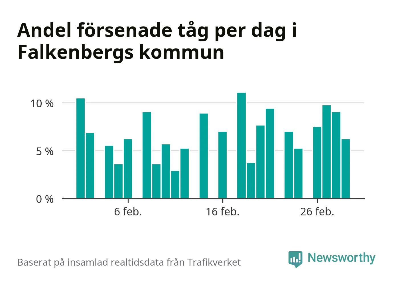 Vintern har kantats av stora tågförseningar. Newsworthy har samlat in ankomsttider under hela februari, för att se hur stor andel av tågen till Falkenbergs kommun som var i tid under månaden.
