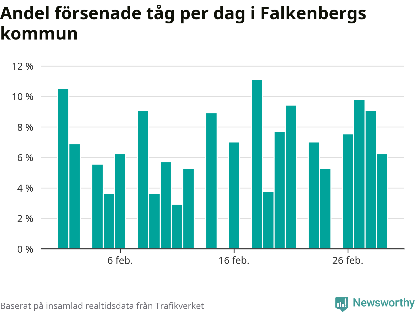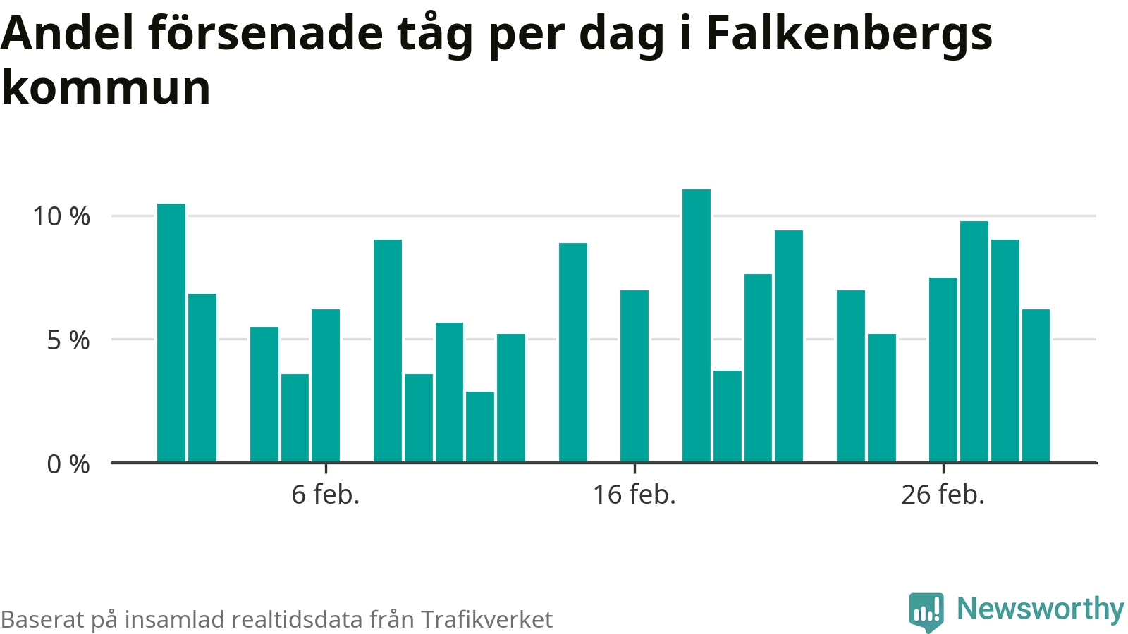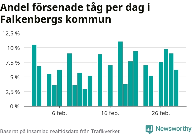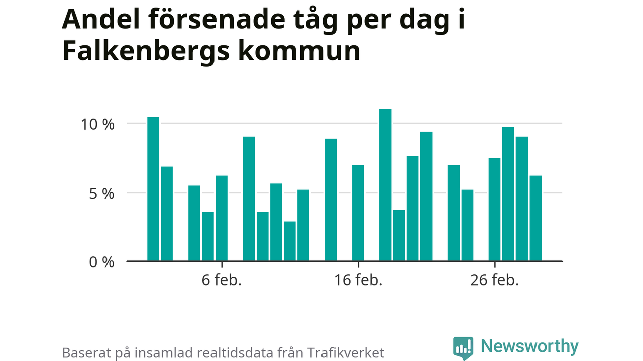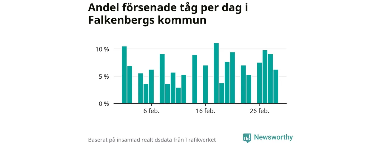 Vintern har kantats av stora tågförseningar. Newsworthy har samlat in ankomsttider under hela februari, för att se hur stor andel av tågen till Falkenbergs kommun som var i tid under månaden.
