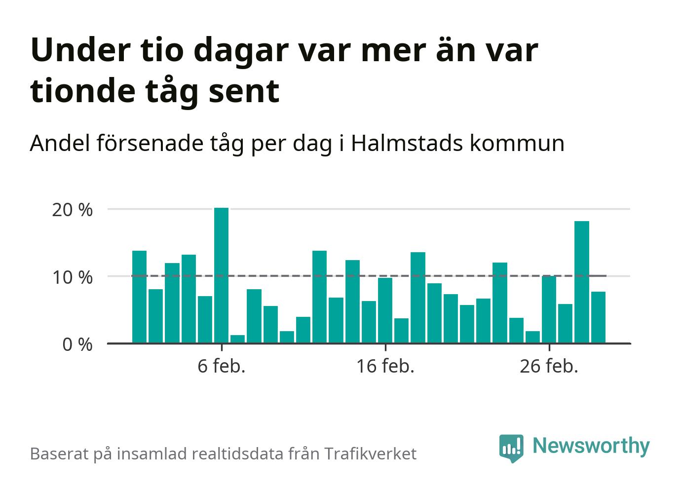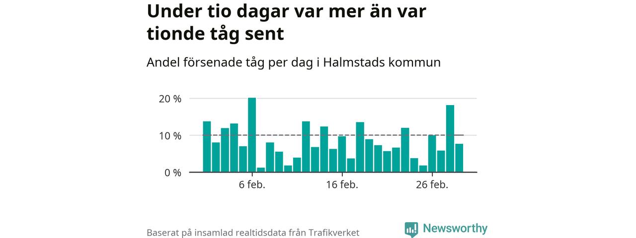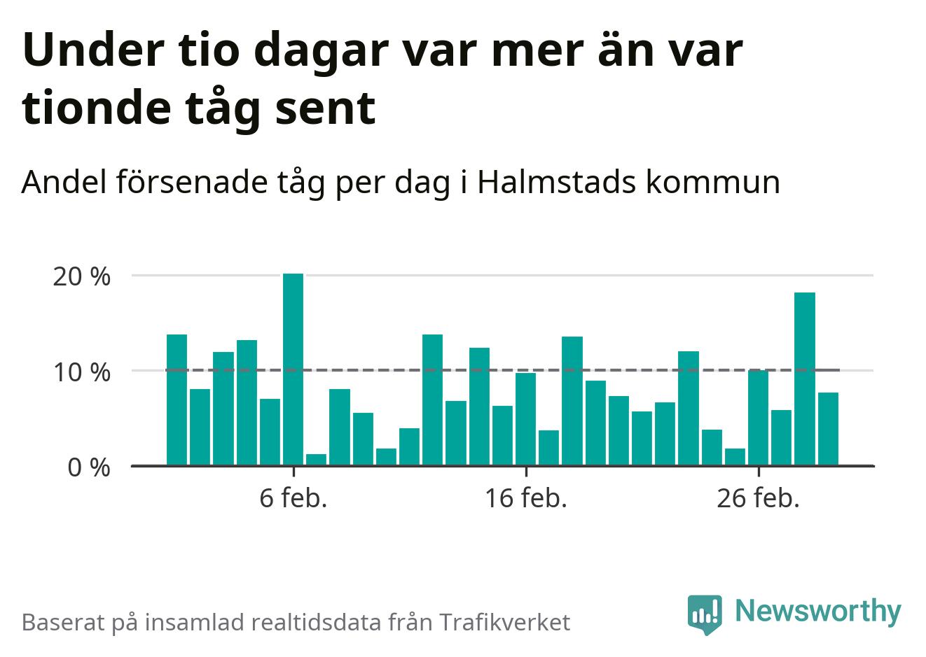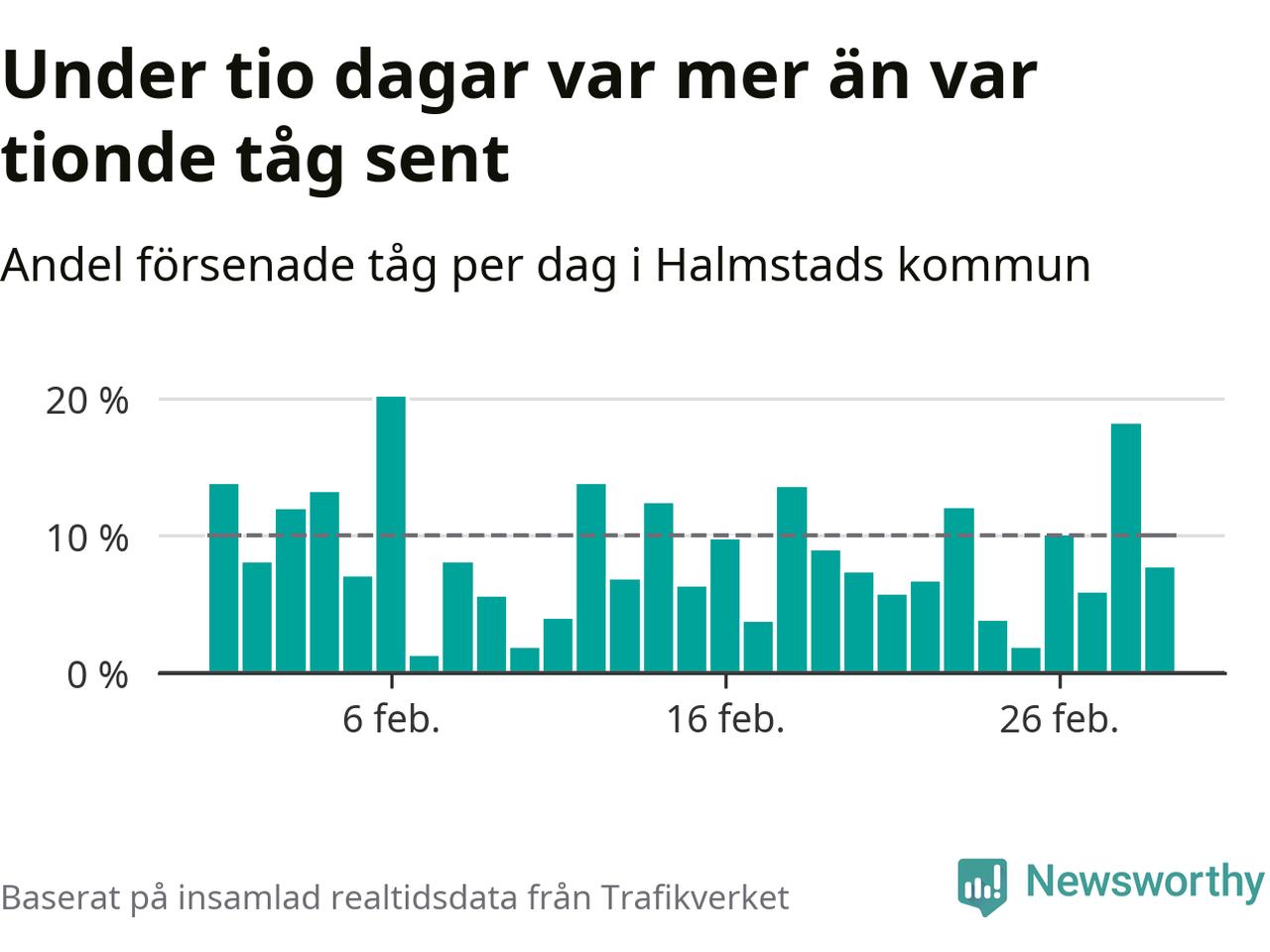 Vintern har kantats av stora tågförseningar. Newsworthy har samlat in ankomsttider under hela februari, för att se hur stor andel av tågen till Halmstads kommun som var i tid under månaden.