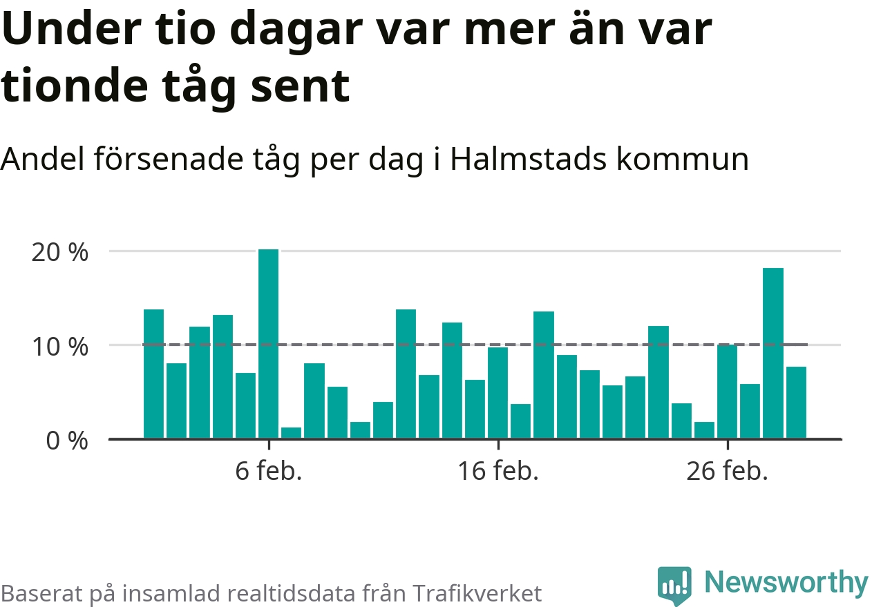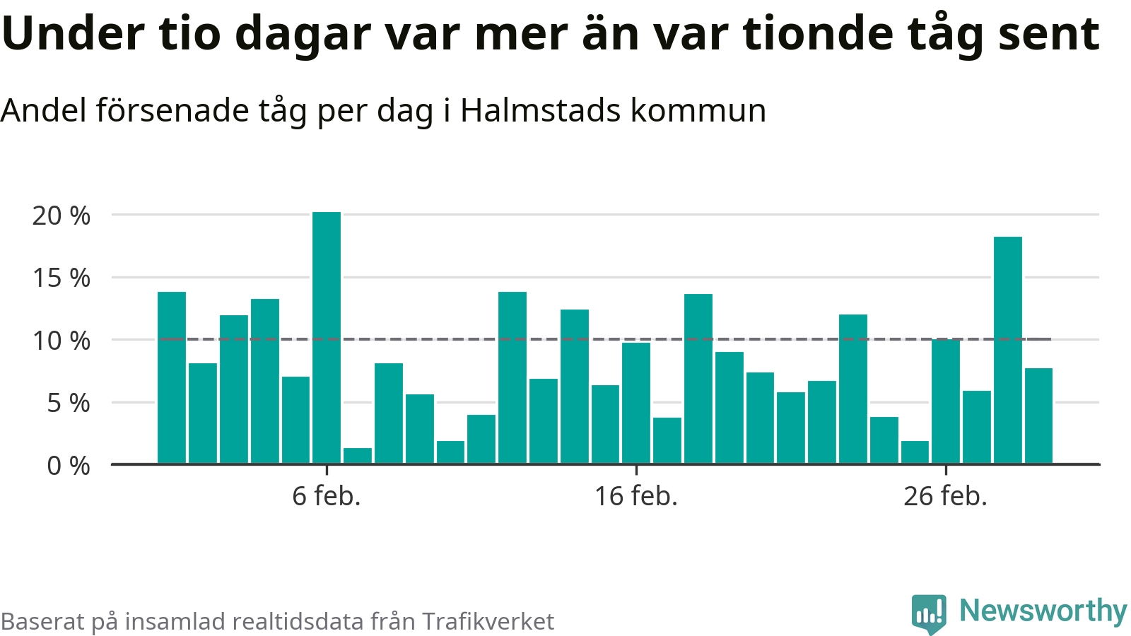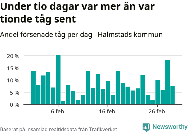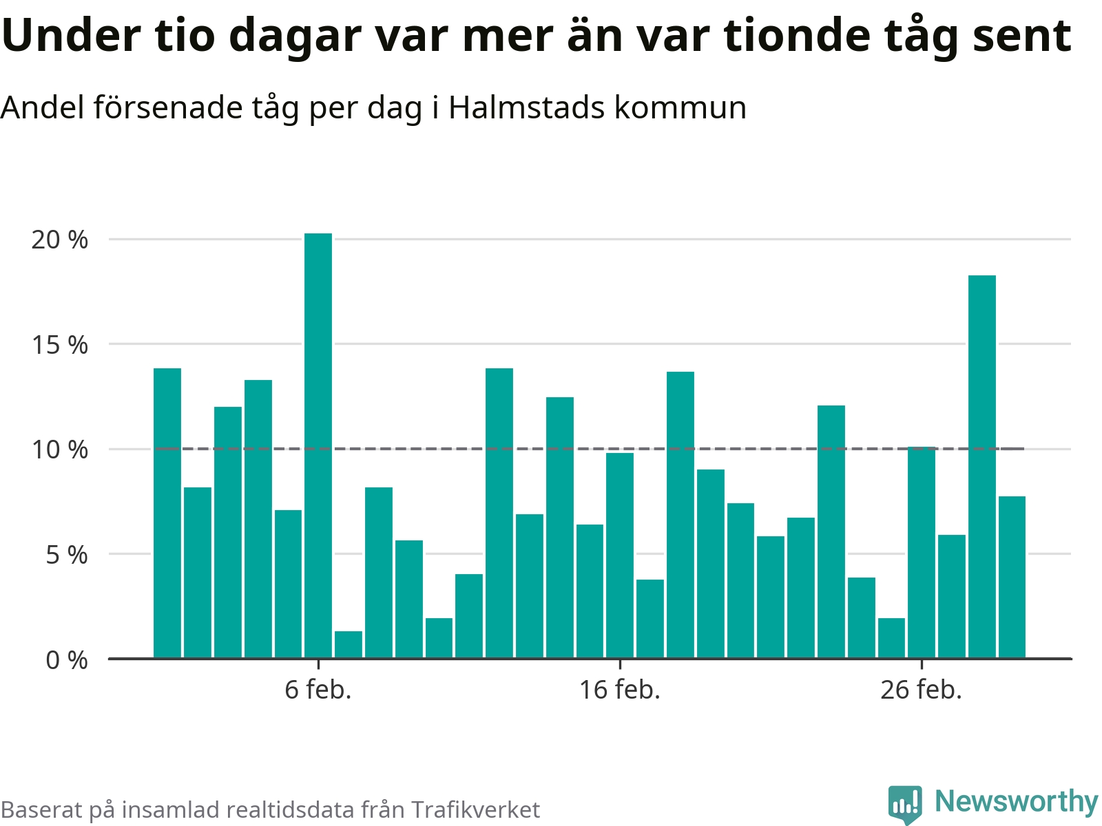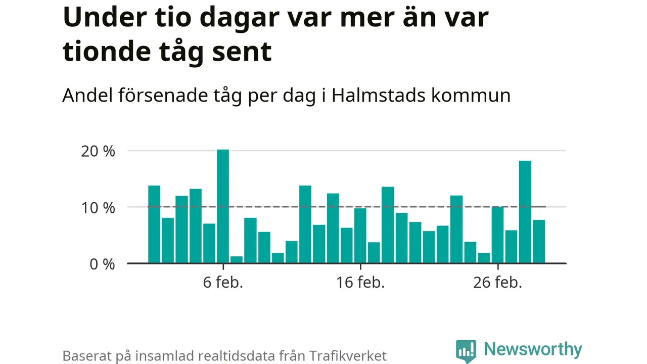 Vintern har kantats av stora tågförseningar. Newsworthy har samlat in ankomsttider under hela februari, för att se hur stor andel av tågen till Halmstads kommun som var i tid under månaden.