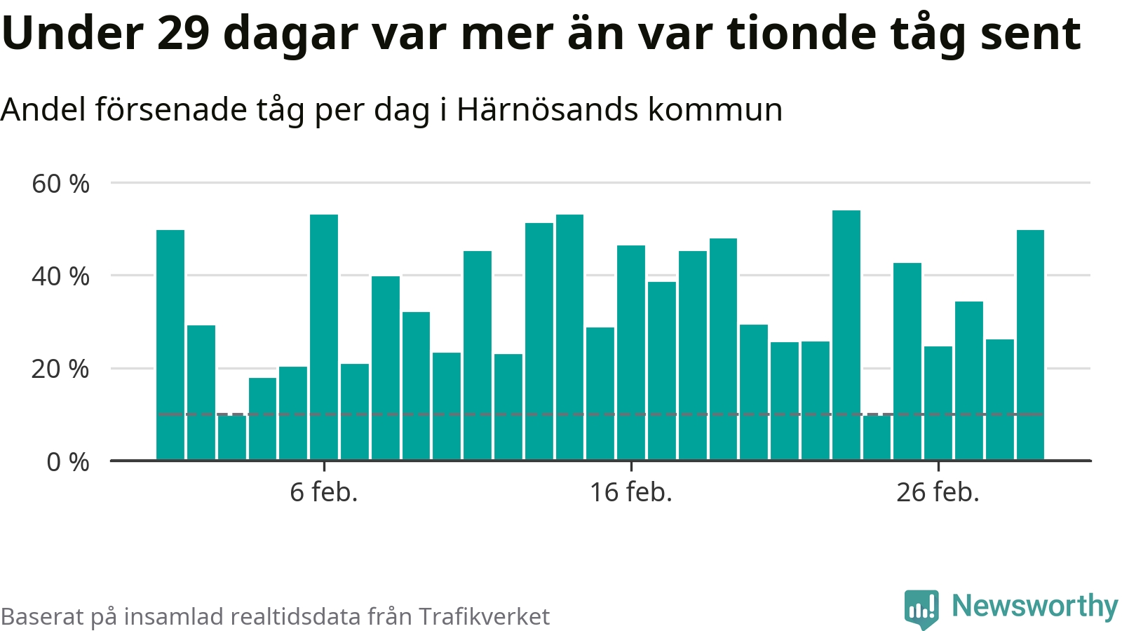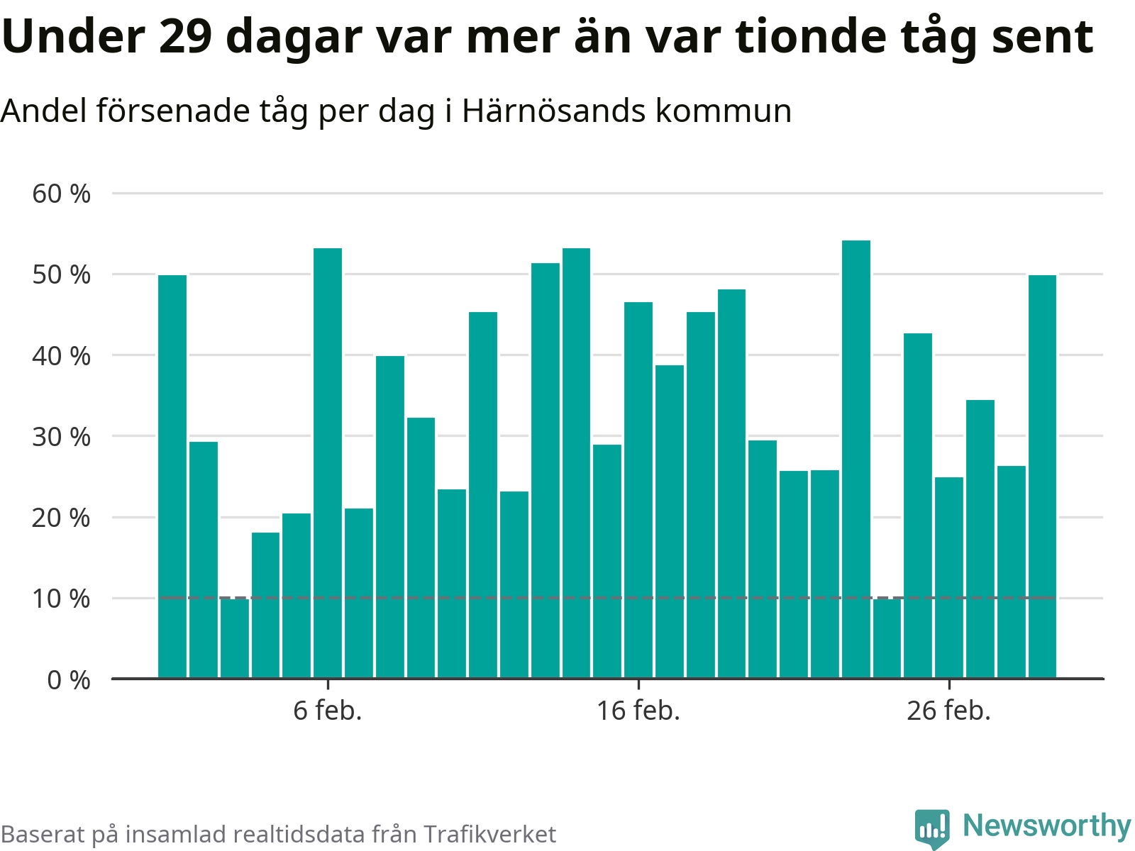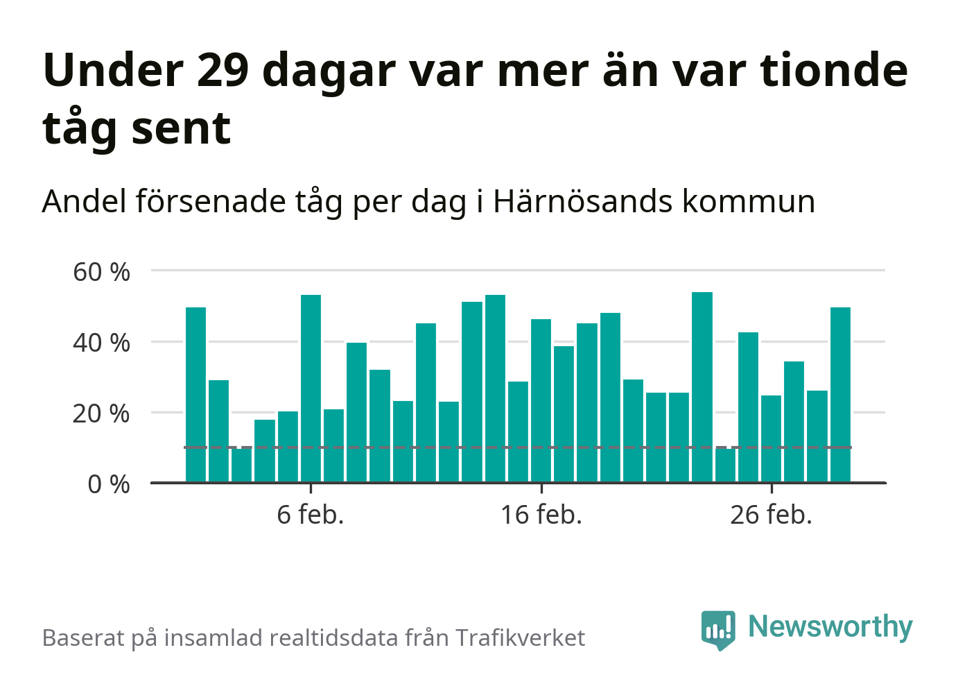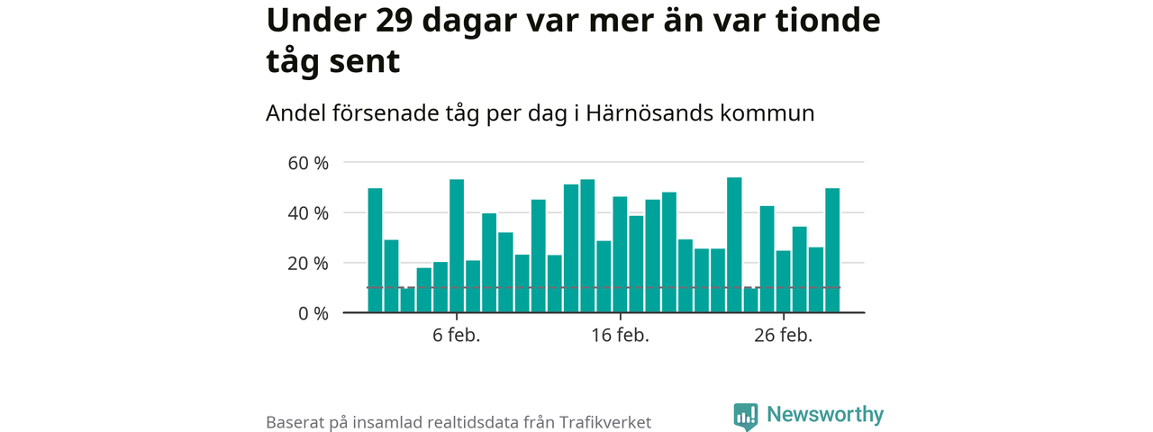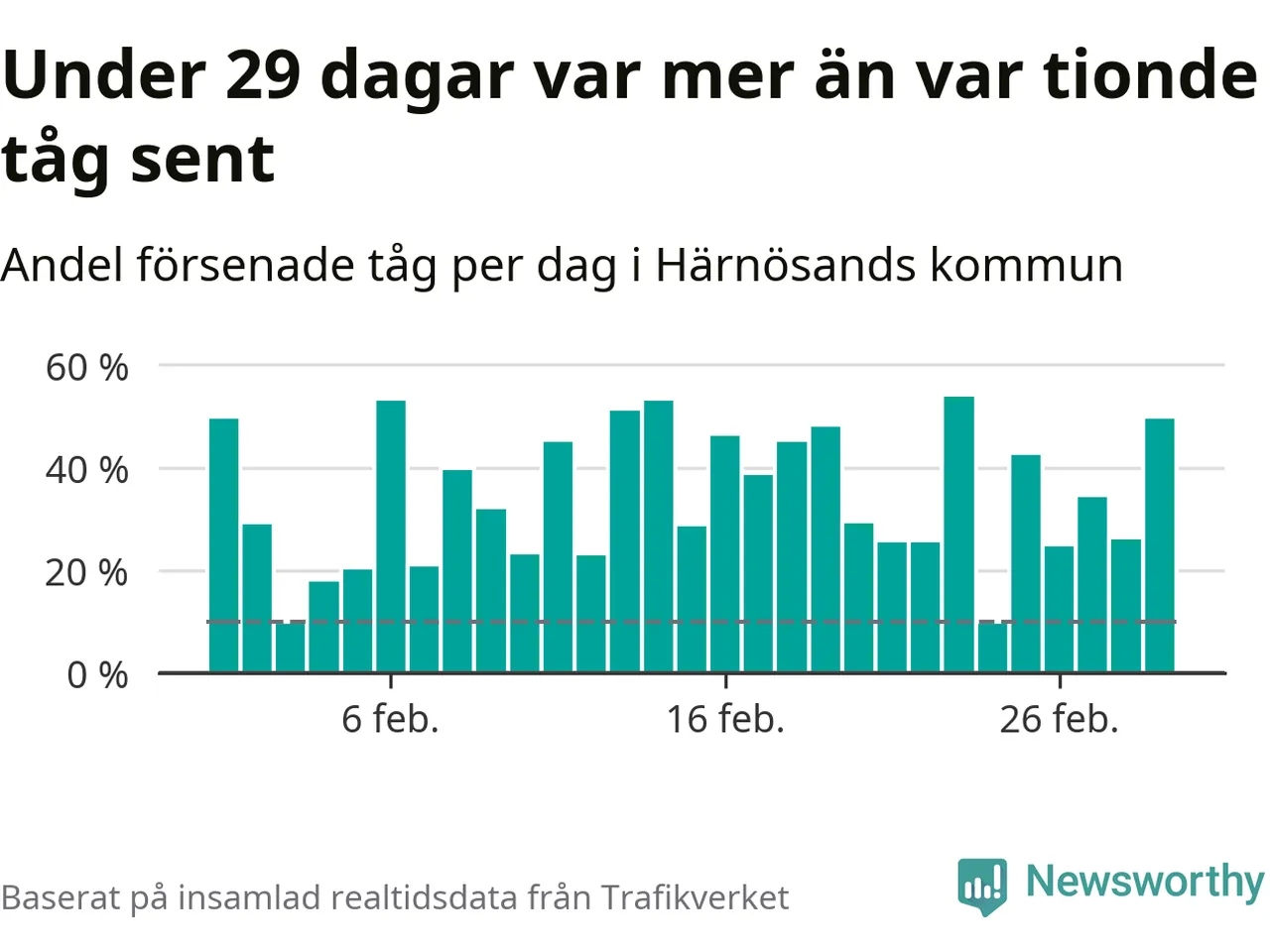 Under alla 29 dagar i februari var mer än var tionde tåg vid Härnösand C försenat. Det visar Newsworthys sammanställning av alla tågförseningar förra månaden.